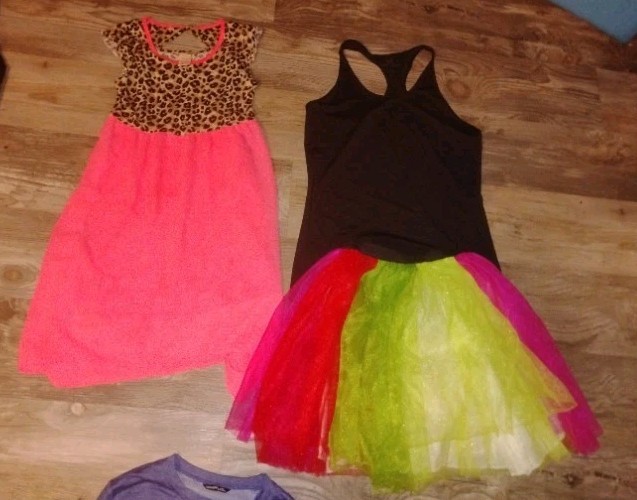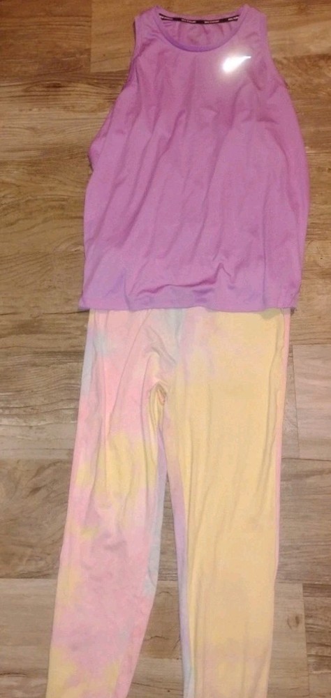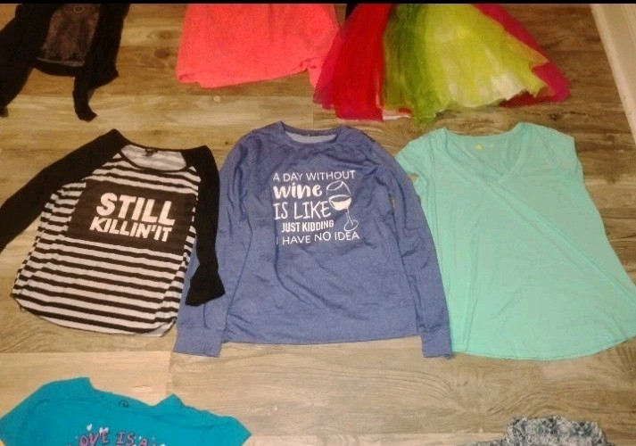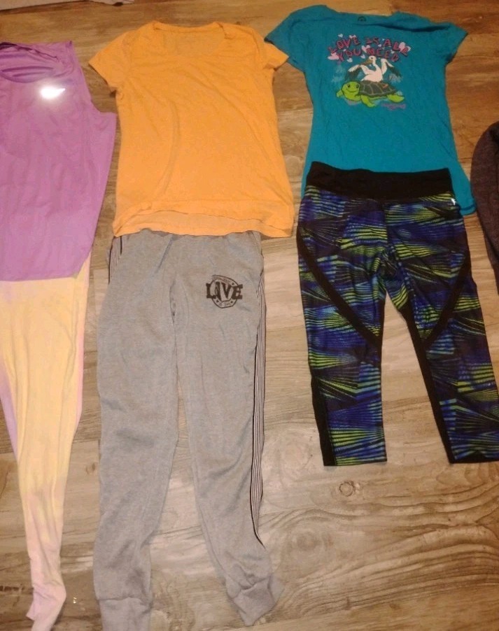 The Women's Size Large Clothing Bundle includes a variety of solid-colored tops in a mix of brands, perfect for everyday wear. Made from 100% cotton, these multi-color shirts have a sports theme, making them versatile for all seasons. This bundle offers a convenient and stylish option for women looking to expand their wardrobe with comfortable and fashionable pieces. Long black dress up sweater 2 pairs pajama pants 1 pajama set 1 skirt 8 tops 1 pair sweat pants 1 pair yoga pants