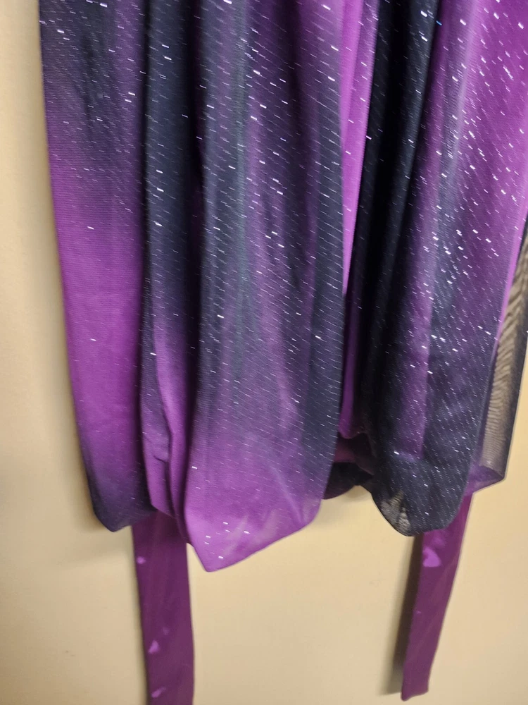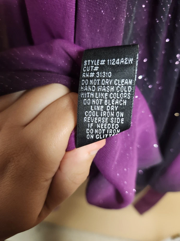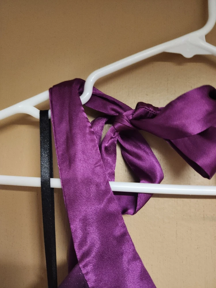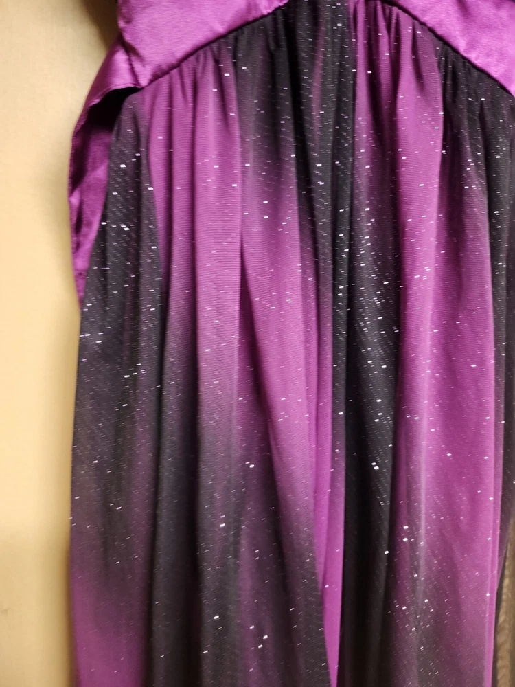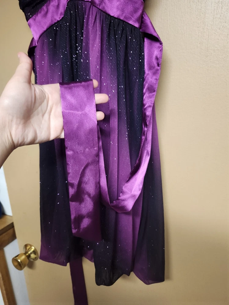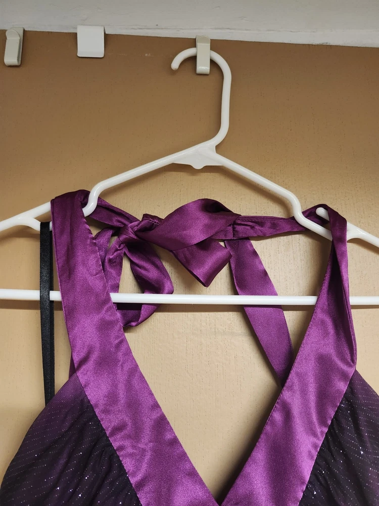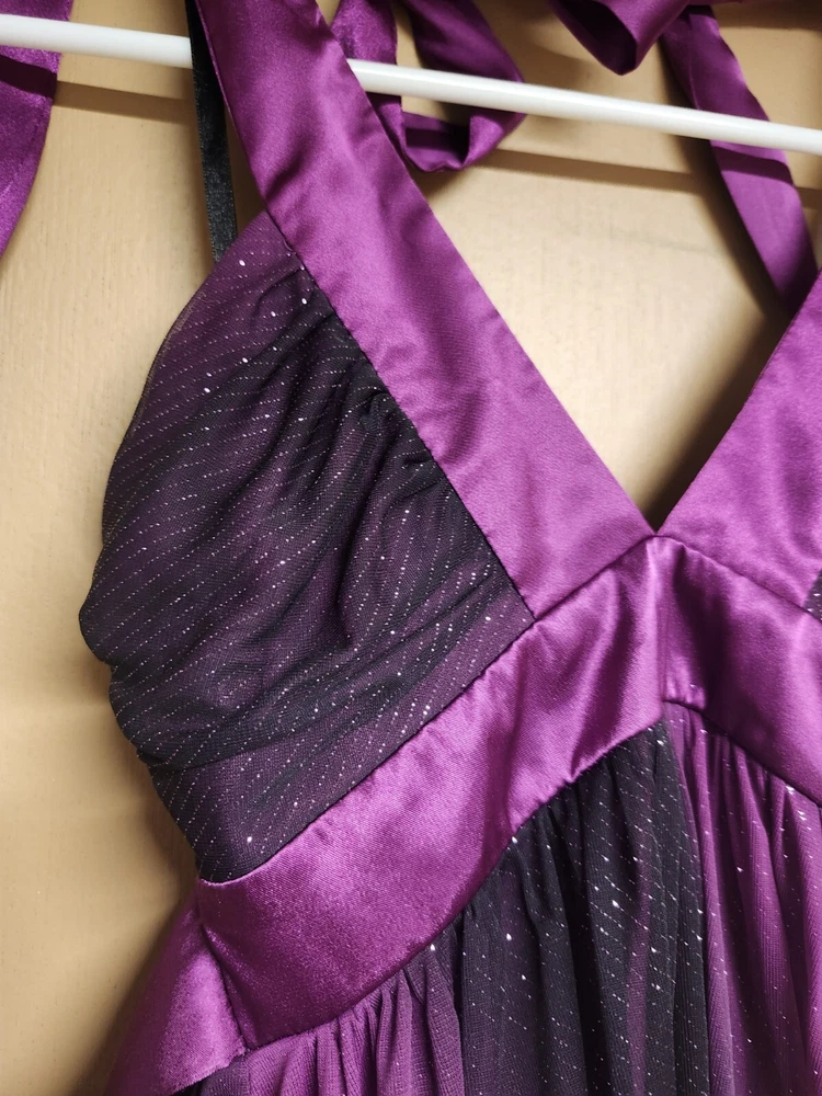 Women's size small, Byer California brand, purple and black colored, glittery, sparkly, halter neckline wrap dress prom dress. 100% polyester material.