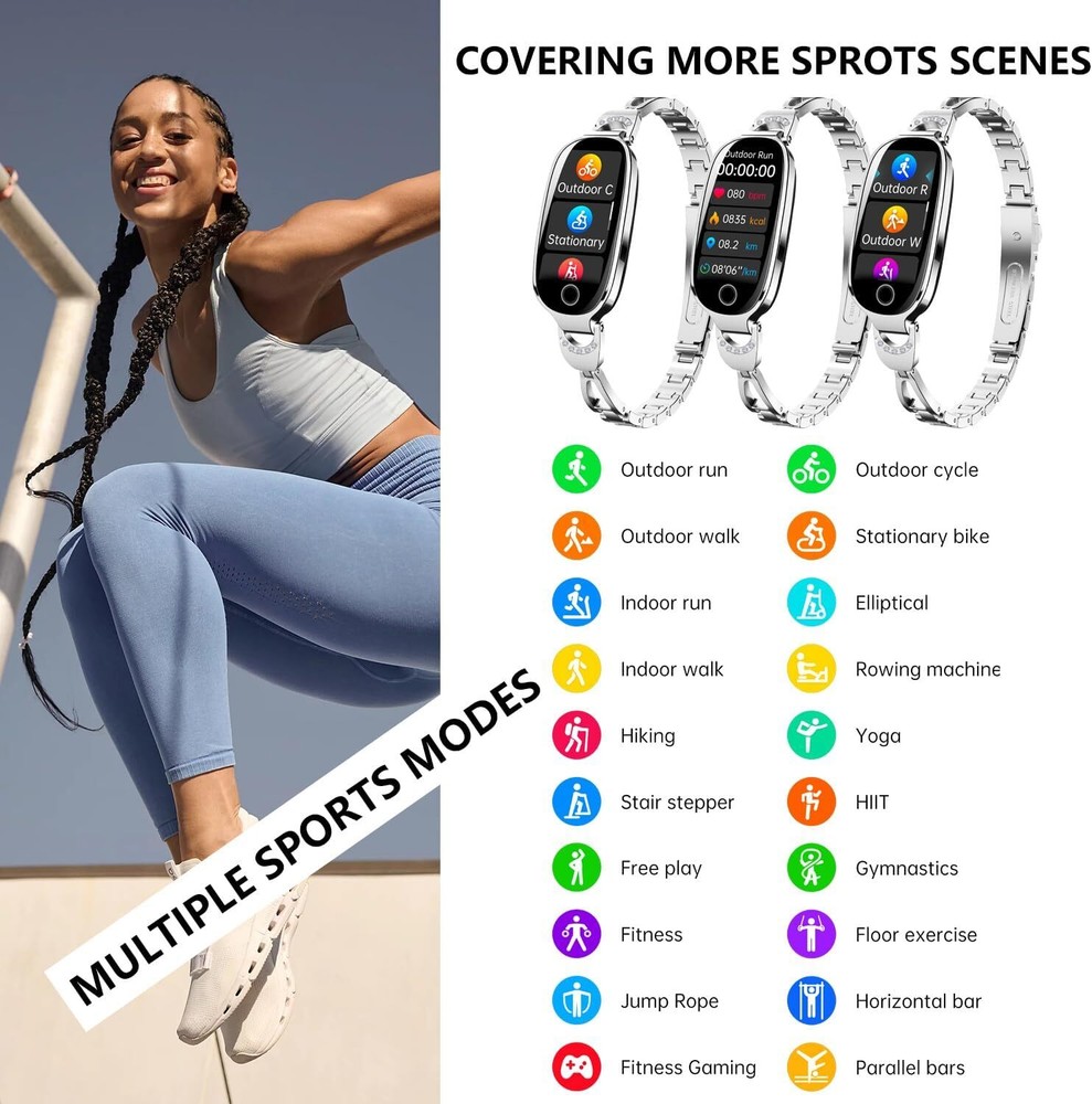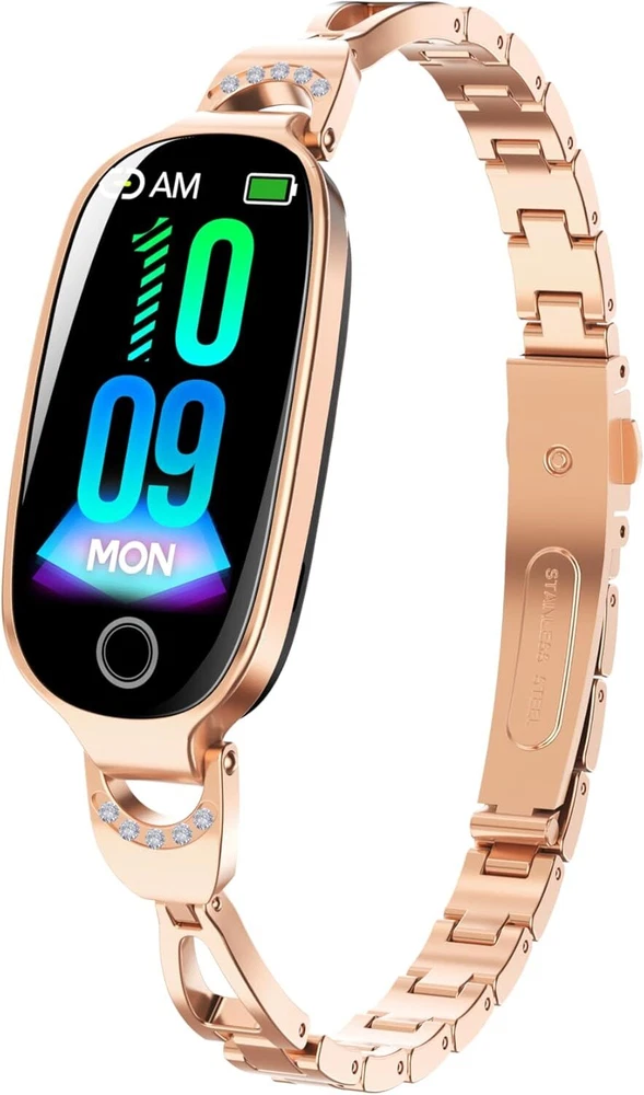 💎 Elegant Women’s Smart Watch with Health & Fitness Tracking This stylish smart watch for women features a premium oval face with a polished metal band and rhinestone accents—designed for elegance and everyday functionality. Ideal for fitness tracking, health monitoring, and smart notifications, all in one sleek device. ✨ Key Features: Elegant Design for Women: Sleek oval face, polished metal band, and sparkling rhinestone accents. A perfect blend of fashion and tech. Comprehensive Health Monitoring: Track heart rate, SpO2 (blood oxygen), blood pressure*, skin temperature, sleep quality, and menstrual cycle. *For wellness reference only, not for medical use. Fitness Tracking with 50+ Sport Modes: Monitor your workouts with step counting, distance, and calorie tracking. Supports running, cycling, yoga, and more. Smart Notifications: Receive calls, SMS, app alerts (WhatsApp, Instagram, etc.). Control music and camera remotely via Joeme Fit app. Long Battery Life: Up to 7 days of usage on a single charge. Fully recharges in about 2 hours with magnetic USB. IP67 Waterproof: Resistant to rain, sweat, and handwashing. Not suitable for swimming or bathing. Multilingual & Global Compatibility: App supports 36 languages; notifications push supports Latin, Cyrillic, and Asian characters. Broad Compatibility: Works with Android 5.0+, iOS 10.0+, and HarmonyOS. Bluetooth 5.3 for stable connection. 📦 Package Includes: 1× Women's Smart Watch 1× Magnetic USB Charging Cable 1× User Manual Perfect for daily wear, fitness tracking, and gifting—this smartwatch delivers beauty, brains, and health at your fingertips.