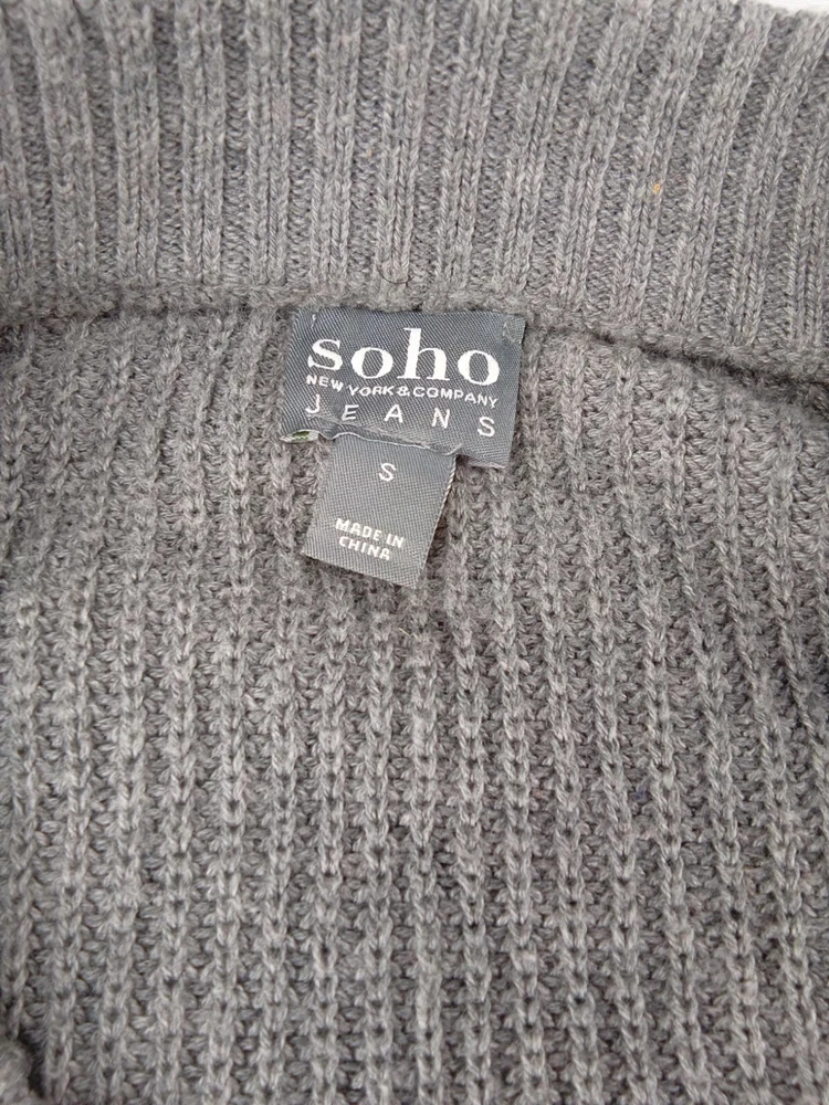 This Women's Soho New York & Company Jeans Sweater is perfect for a casual day out. The gray color and tight-knit acrylic material make it warm and comfortable to wear. The 3/4 sleeves and V-neckline add a touch of cuteness to the sweater, while the laced-up back gives it a stylish edge. The sweater is a size small and is designed for regular-sized women. It is a pullover style sweater with a solid pattern and knit fabric type. The sweater is not vintage and is perfect for any casual occasion.