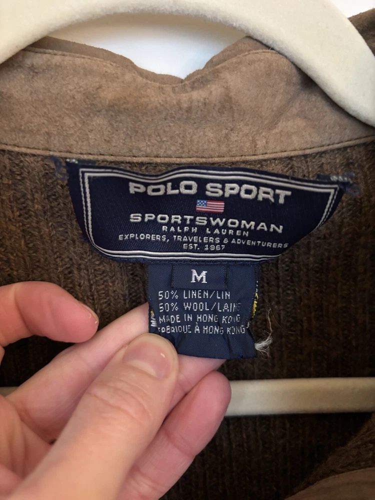 This is a women's Ralph Lauren sweater in size M, designed as a button-up cardigan style in a brown color. It is made from a blend of 50% wool and 50% linen, featuring a knit fabric type with accents of wooden buttons. The sweater exudes a sporty theme, perfect for casual or athletic wear. Some of the buttons are a little loose and the tag is starting to fall off, otherwise it is in perfect condition!