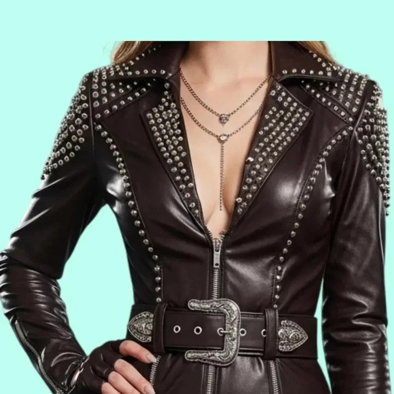 Turn heads and own the spotlight with this bold and edgy studded leather jumpsuit. Perfect for performers, fashion risk-takers, and anyone with a taste for high-impact style, this full-body catsuit is designed with premium black leather, silver stud embellishments, and a figure-flattering fit. Ideal for concerts, music videos, clubwear, photo shoots, festivals, and biker events, this piece combines punk rock attitude with runway-worthy detail. ✨ Features: Material: Premium genuine Cowhide Leather Color: Classic black with silver-tone studs Design: Long-sleeve, fitted catsuit with deep V-neckline Closure: Full-length front zipper for easy wear Belt: Matching leather belt with metal buckle for a cinched waist Details: Studded shoulder accents for extra edge Fit: Slim, tailored fit to enhance curves Occasions: Perfect for punk rock shows, biker events, cosplay, stage performances, photo shoots, and nightlife fashion 📏 Available Sizes: XS, S, M, L, XL, 2XL, 3XL, 4XL (See size chart in listing images for exact measurements.)