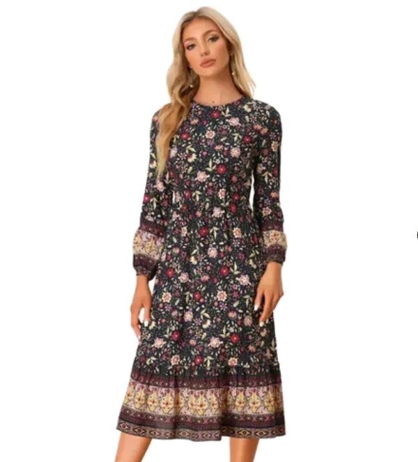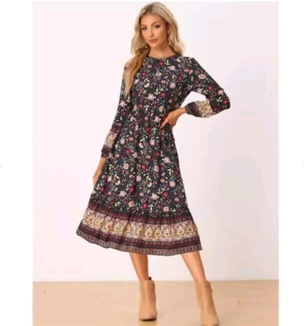 Features stunning standout beautiful floral pattern, long sleeves, elastic waist, round neck, elastic cuffs, unlined, midi, side zipper, Bust 20"