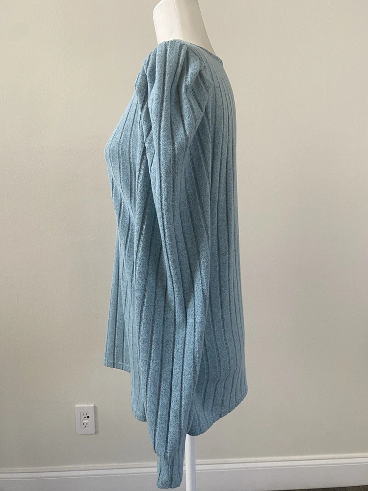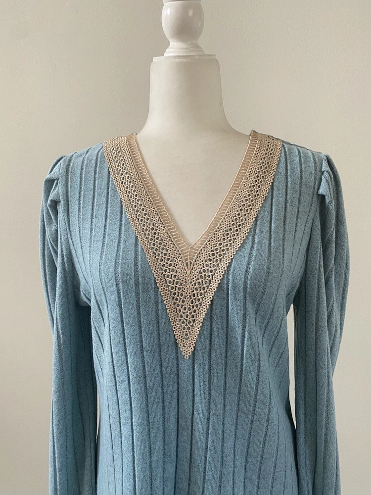 Elevate your wardrobe with this stunning sky blue and beige lace V-neck sweater. The tight-knit polyester knit fabric offers comfort and stretch, making it perfect for any occasion, whether it's a party, a casual outing, or a business meeting. The long sleeves and breathable material make it suitable for all seasons, while the regular fit and flattering neckline ensure you look your best. This lightweight sweater is machine washable and features a solid pattern that is perfect for pairing with your favorite jeans or dress pants. It's a versatile piece that is perfect for any fashion-forward woman. Don't miss out on this amazing addition to your wardrobe! Pit to Pit: 19.5”; Length: 26”. Condition of the item is Pre-Owned in great shape! Shipped asap by USPS ground advantage mail.