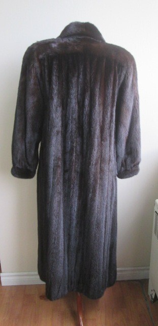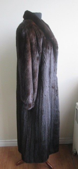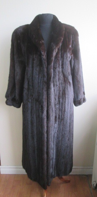 This fur garment, which is entirely "Made in Canada," is not subject to US tariffs. I tem Description: Elegant top quality SAGA MINK. Super soft FEMALE mink fur coat for ladies. Warm and cozy mink fur collar, front furrier closures , side pockets, satin lining complete the look of this spectacular fur coat. Both fur and lining excellent condition. Cleaned and glazed and ready to wear. SIZE: 8 LENGTH : 50" SLEEVES: 28.5"