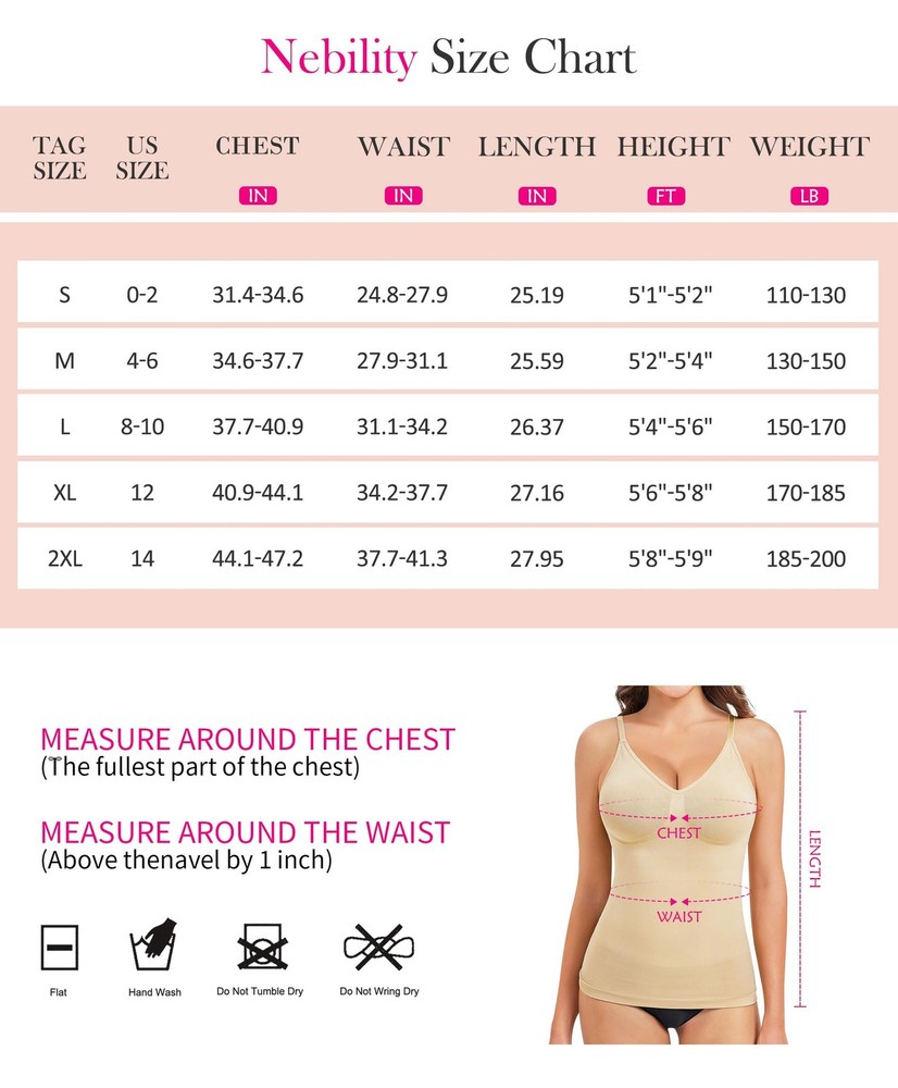 1:women's shapewear tan tank top creates more toned and streamlined appearance fupa control shapewear helps to create a sleeker figure by flattening the belly fat, tightening lower abdomen and love handles. body shaper for women tummy control provides light compression to your midsection, aiming to provide shaping and versatile fit throughout the day. 2: One piece waist shaper seamless compression tank tops for women Whether paired with dresses, skirts, jeans, or any other attire, this women compression tank top with bra remains undetectable, allowing you to enjoy a streamlined look without anyone suspecting it's a shapewear piece. 3: V-neck slimming tank tops for women contribute to an overall more flattering look Girdle tummy control has adjustable spaghetti shoulder straps to provide a flexible fit. With no pads cups to fit any small or big breast without compressing your breast. Enhancing your beautiful neckline and natural and breast curves. 4: Versatile collection body shaper camisoles for women for under clothes This comfortable, stretchable and seamless plus size shapewear tummy control is versatile and stylish with any outfit. It is easy to pair with different outfits without any visible lines or bulk. you can confidently wear it for any occasion, and enjoy the shaping and smoothing effects you desire. ADJUSTABLE SPAGHETTI STRAPS: camisole tops for women adopts adjustable spaghetti straps, making it easily customized to achieve a perfect fit. Crafted from Nylon and Spandex, this body shaper tummy control is stretchy, and breathable, ensuring maximum comfort. Additionally, the women's tank tops is designed with a flattering v-neckline, which not only enhances the appearance of your breasts but also highlights your clavicles for a more attractive figure. SEAMLESS ONE PIECE SHAPEWEAR TOPS: tummy control shapewear is designed as a seamless, one-piece garment, ensuring that no lines or seams are visible when worn underneath your clothing. Moreover, black tank tops for women can also be worn by itself as a regular tank top, offering you the freedom to style it in various ways. cami tops perfect to wear with fitted dress, skirts, jeans etc. By embracing your curves and providing a slimming effect, it helps to enhance your body shape discreetly. TUMMY CONTROL TANK TOP: compression tanks for women provides light compression to your waist and abdomen, helping to flatten tummy fat, smooth the abdomen, tighten waist fat, and reduce waistline. These shapewear tank top typically feature a thicker and elastic fabric in the midsection area, which effectively hugs your body and provides a slimming effect. The shapewear for women tummy control compression helps to shape and contour your waistline, giving you a slimmer and smoother appearance. PAD-FREE SHAPEWEAR CAMI SHAPER: seamless shapewear tummy control provides a comfortable and supportive fit for everyday wear. This shapewear camisole typically do not have bra pads, allowing them to fit all sizes of breasts without flattening them. The absence of wires in an everyday shapewear tank top tummy control ensures a comfortable wearing experience.The cut of this workout tops for women position properly, holding the girls up completely. This helps to maintain a natural and lifted shape. STAY IN PLACE: The hem of the shapewear tummy control is designed to be wide and elastic, which helps to prevent any rolling or shifting during wear. This ensures that the black tank top woman stays securely in position, providing you with a comfortable fit. Whether you are going about your daily life, attending a club or party, or working in the office, you can rely on the womens camisole tank tops stomach control shapewear to provide the support, shaping, and comfort you need. SIZE GUIDES AND MAINTENANCE: To get a snug fit, it is important to measure yourself and choose your size from our body shaper for women under dress size chart.
