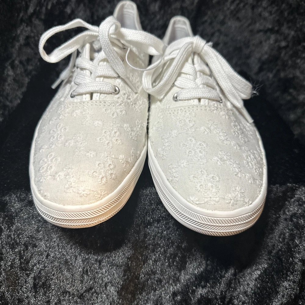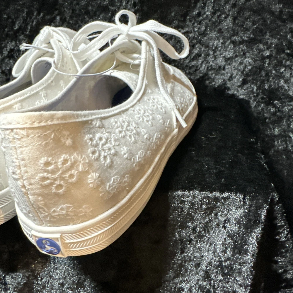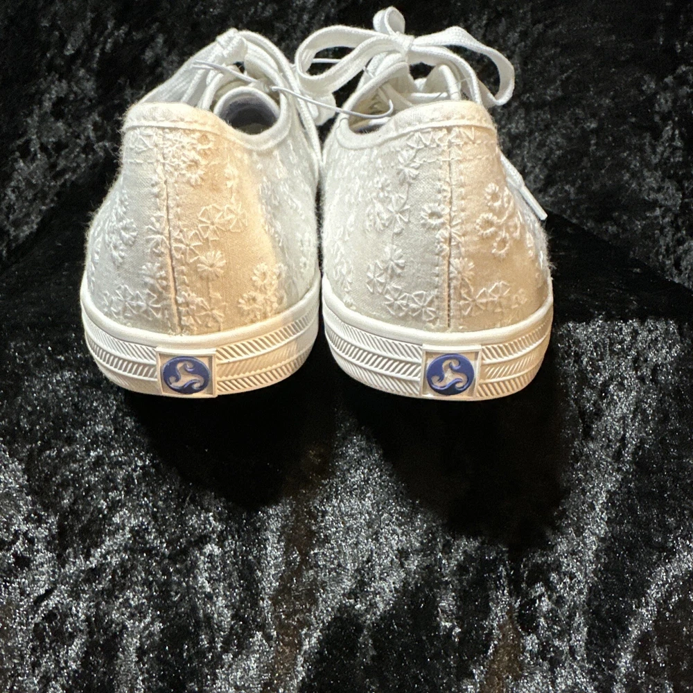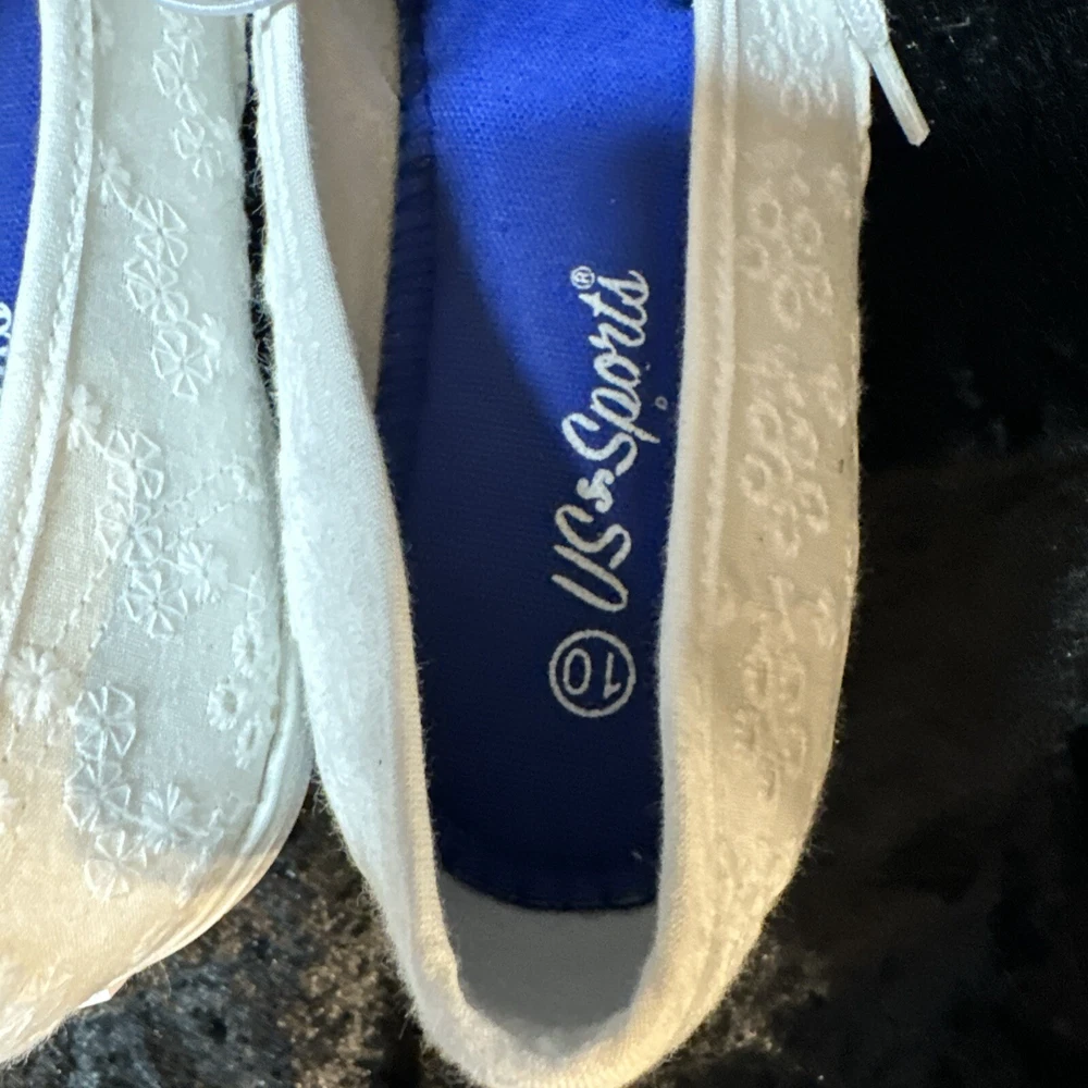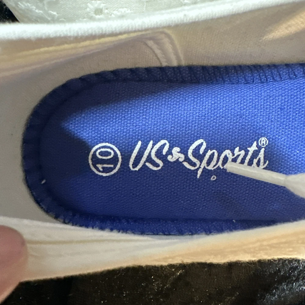 These are Women's US Sports White Shoes in Size 10. They are Low Top sneakers with a floral pattern, lace-up closure, and made of breathable canvas material. The shoes are lightweight, comfortable, and suitable for activewear and casual occasions. Ideal for walking, running, jogging, or the beach, they feature a rubber outsole for traction and foam insoles for added comfort. Perfect for summer, fall, and spring seasons.