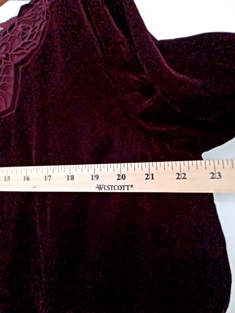 Womens Velvet Lace Crochet Embroidered Blouse XL Gothic Fairy Ethereal Oxblood No flaws - CLEAN in ready to wear condition. Item ships in protective tissue and sealed Poly pouch from a smoke /pet free home fro your peace of mind. SIZING Length -28 in pit to pit -22.5 in Chest -44 in Sleeve length -23 in shoulder to shoulder -17 in CARE INSTRUCTION Machine wash cold only with similar colors gentle cycle lay flat to dry cool iron if needed Please read the description and review photos for size information Please review photo's carefully as a component of description and for physical condition. Please contact me first and I'll do my best to answer all questions and resolve any issues. Items usually ship same/next business day. International Buyers You are responsible for shipping cost, all import duties, taxes and charges. Please check with your country's customs office to determine what these additional costs will be prior to buying. We won't under-value merchandise or mark the item as a gift on custom forms. This is against US and international laws.