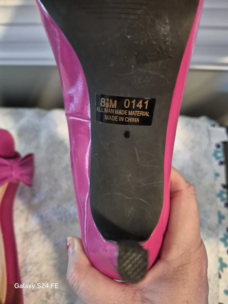 Toe Shape: Peep Toe Season: Spring, Summer Style: Pump Upper Material: Polyurethane US Shoe Size: 8.5 Occasion: Business, Party/Cocktail Closure: Slip On Accents: Bow Type: Heel Heel Height: Mid (2-2.9 in) Department: Women Color: Pink Heel Style: Stiletto Brand: Versona