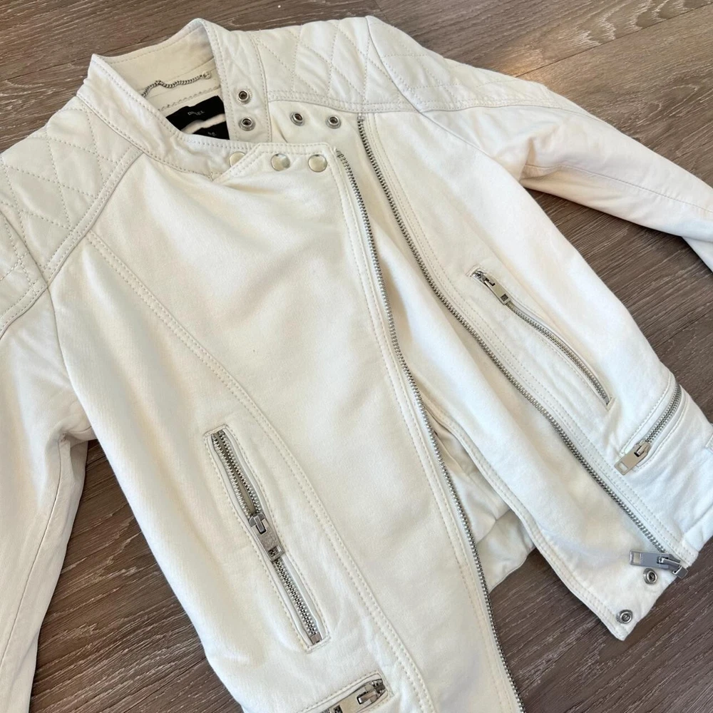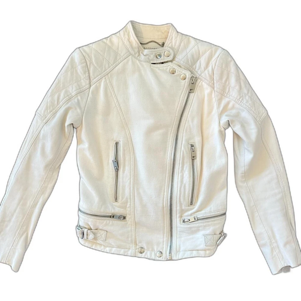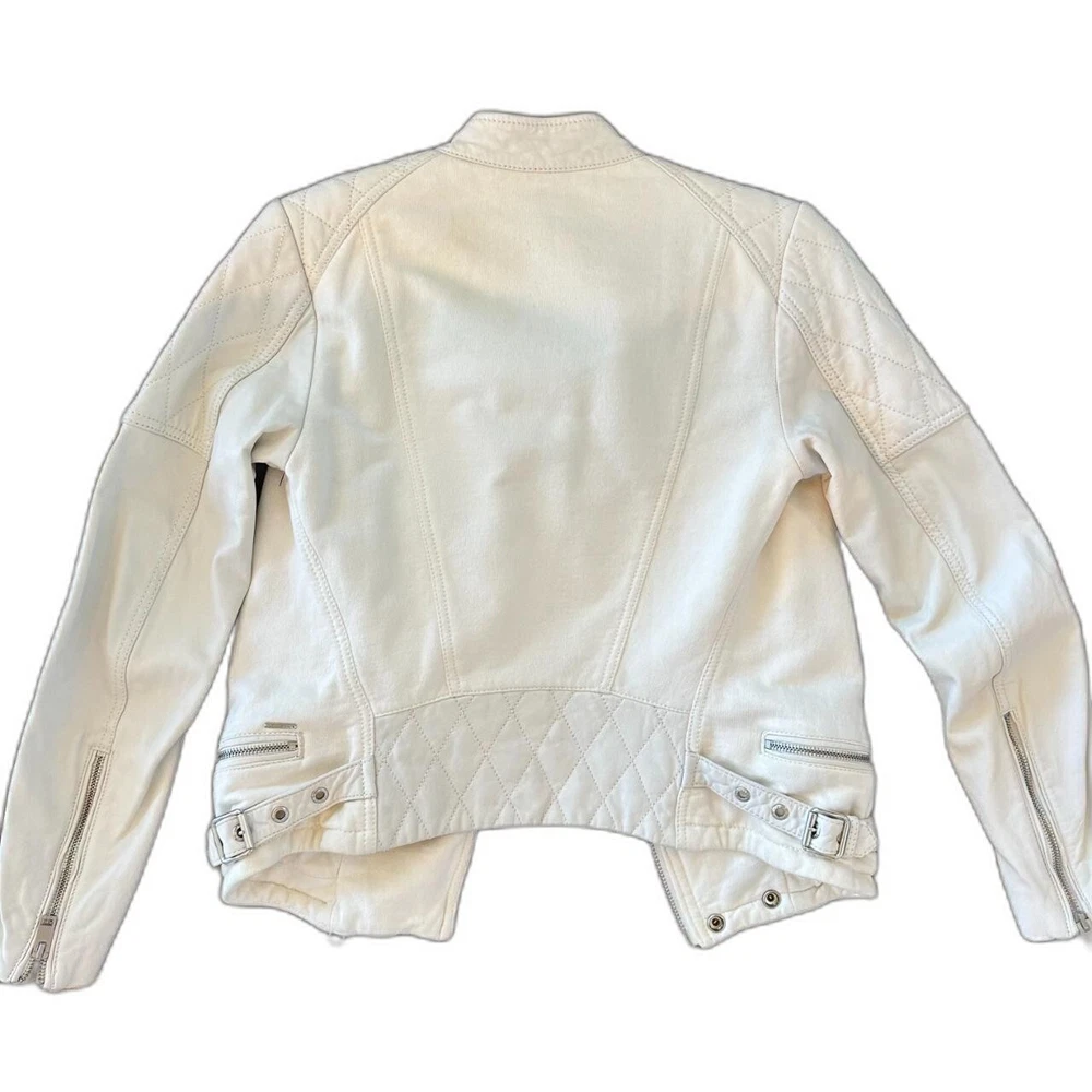 💌 Vintage Diesel leather jacket in a classic biker style 💌 Soft white leather with silver-tone zipper detailing💌 Quilted stitching on shoulders and upper sleeves💌 Asymmetrical front zip closure with snap collar💌 Two zippered chest pockets and adjustable waist tabs-✨In perfect condition✨ ✨Fall jacket; winter jacket✨✨Made with sheepskin leather✨ - Elevate your style with this stunning white leather jacket from Diesel. Crafted from high-quality sheepskin leather, this short-length biker jacket features long sleeves and a full zip closure. The jacket is accented with button, quilted, buckle, zipper, and logo details, making it a unique addition to your wardrobe. Ideal for travel, party, or casual occasions, this jacket is a must-have for any fashion-forward woman. The jacket is dry clean only and is available in size S. It is perfect for fall and winter seasons and is made in India. Add this vintage piece to your collection and make a statement wherever you go.