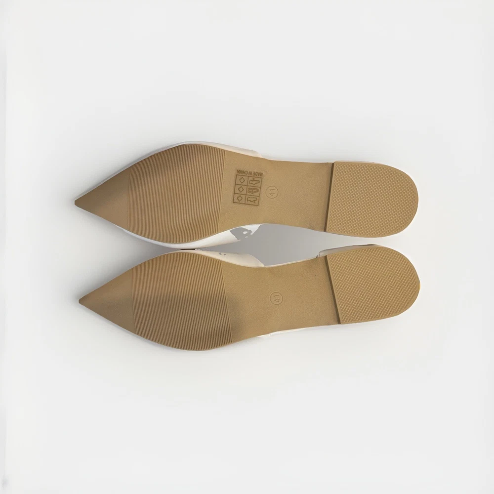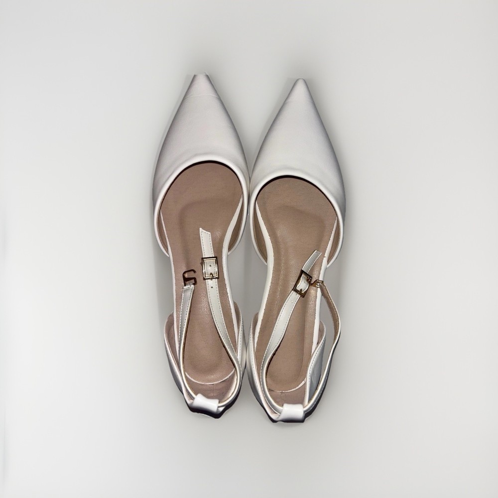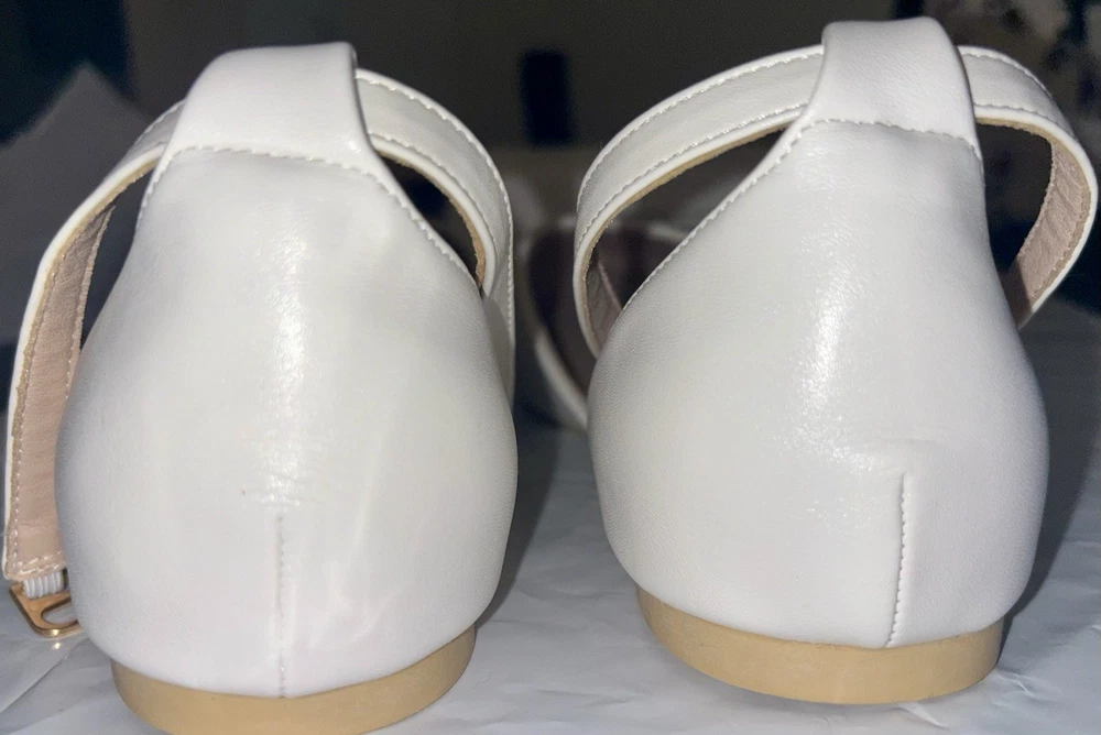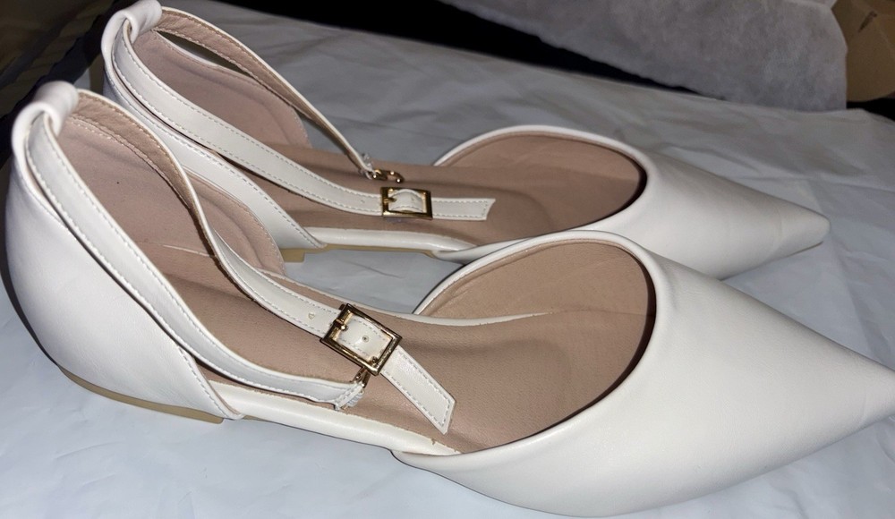 These Women's White Pointed Toe Ankle Strap Flats are perfect for a casual summer or spring outfit. The synthetic upper material and outsole provide durability and comfort, while the buckle closure and ankle strap add a stylish touch. The solid white color and pointed toe shape give these flats a chic and trendy look, making them a versatile and fashionable choice for any woman's wardrobe. Size: 8.5 US.