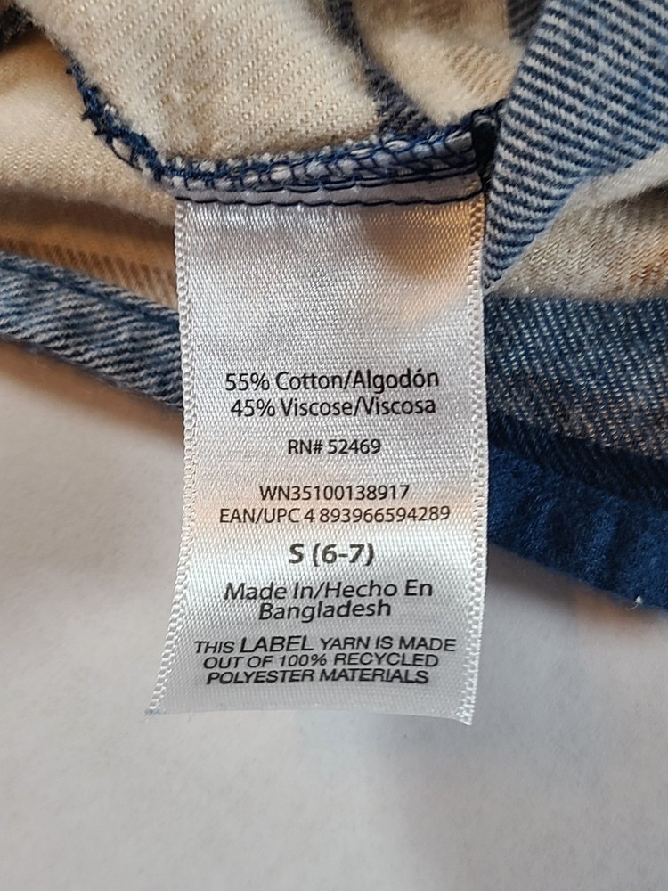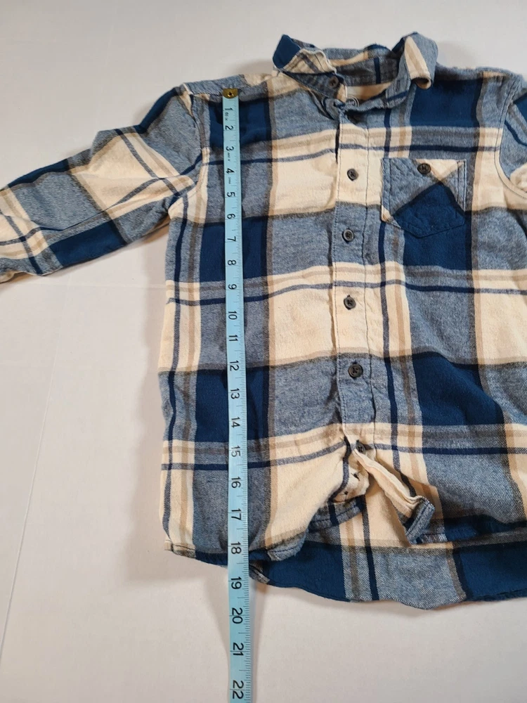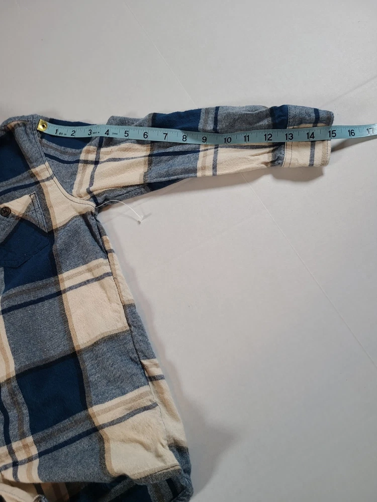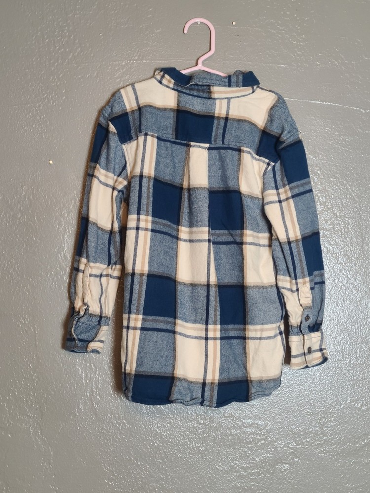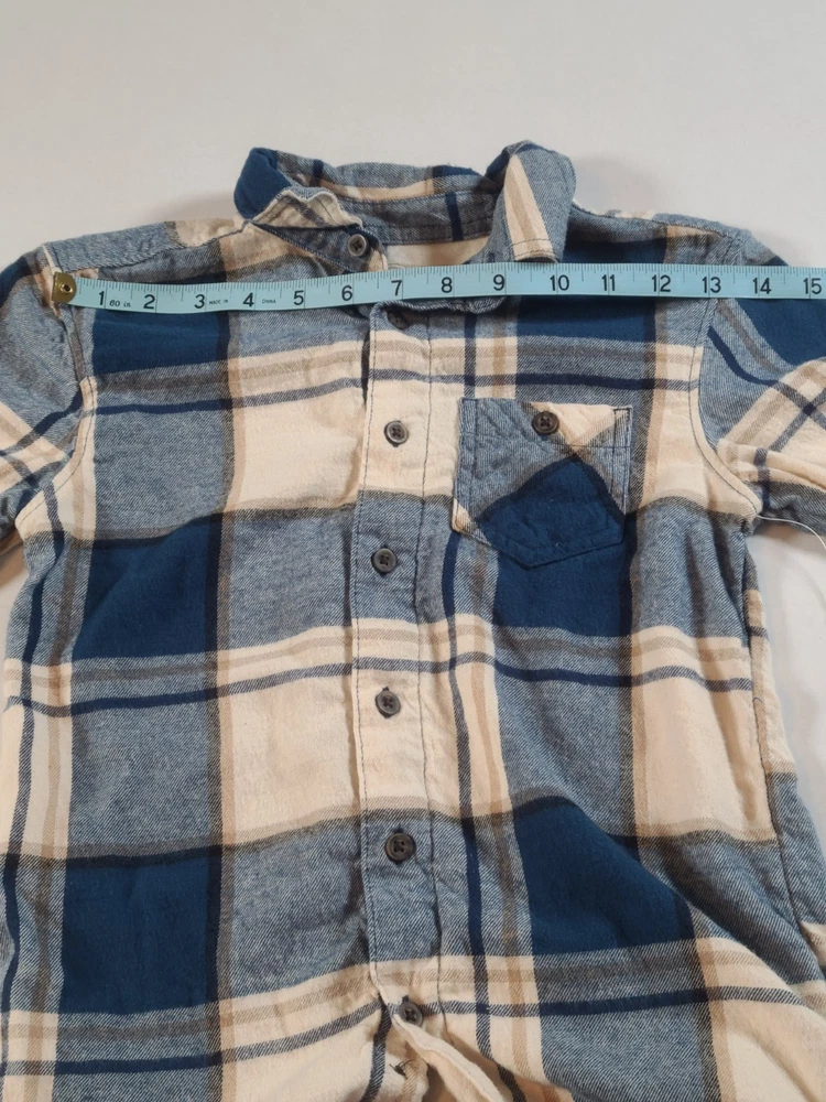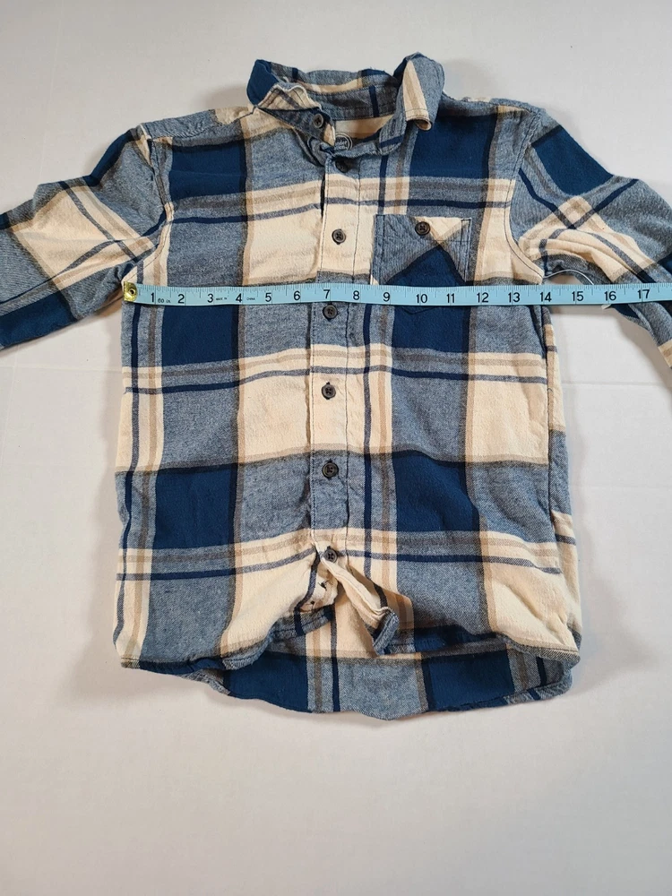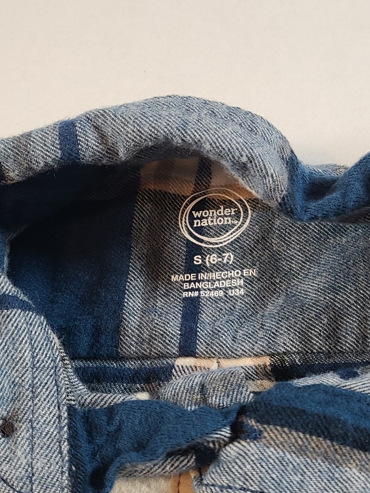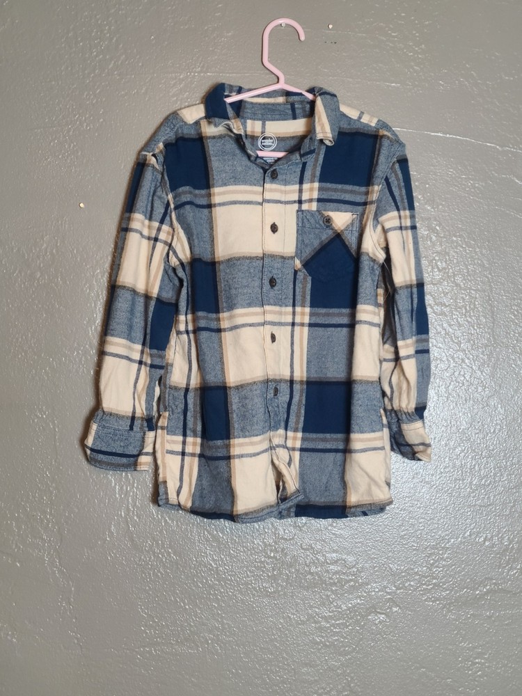 The Wonder Nation Blue and Cream Plaid Button-Up Flannel Boys Shirt in size S (6-7) is a classic and versatile addition to any young boy's wardrobe. Made from a blend of viscose and cotton flannel, this shirt features a collared neckline and button-down style for a polished look. The multicolor plaid pattern adds a fun and trendy touch, perfect for casual occasions or travel during the winter, fall, or spring seasons. Easy to care for with its machine washable design, this shirt also includes convenient pockets and is suitable for activities like walking, school, and hiking. Ideal for a young adventurer, this shirt embodies the theme of classic style and comfort. See photos for measurements approximate. NWOT