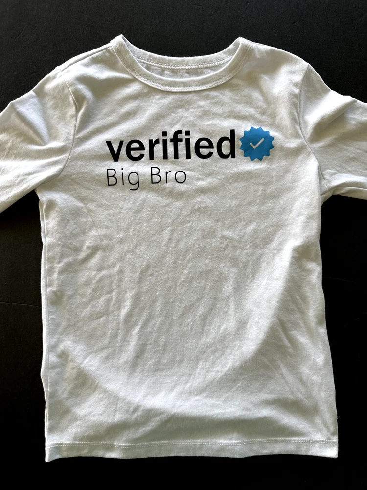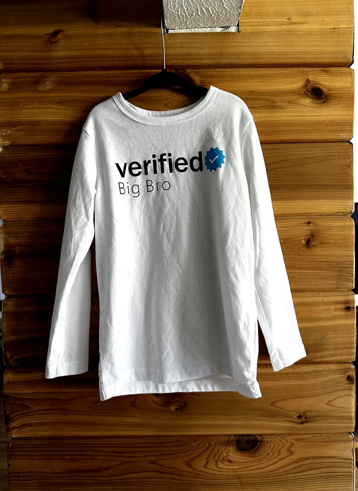 Wonder Nation Boys Small (6-7) Cotton Blend Big Brother Long Sleeve White Tee "Verified Big Bro" Social media Instagram/Twitter Graphic Fun Creative Quippy T-Shirt Cute top for a big brother or soon-to-be sibling! Bust: 13" Length: 19"
