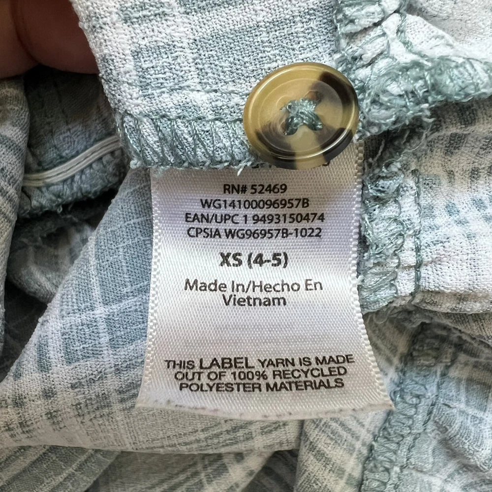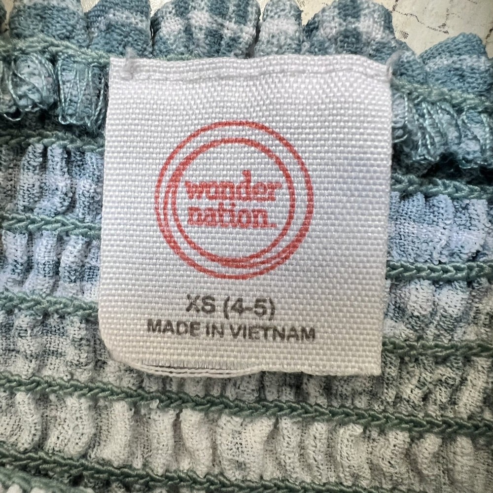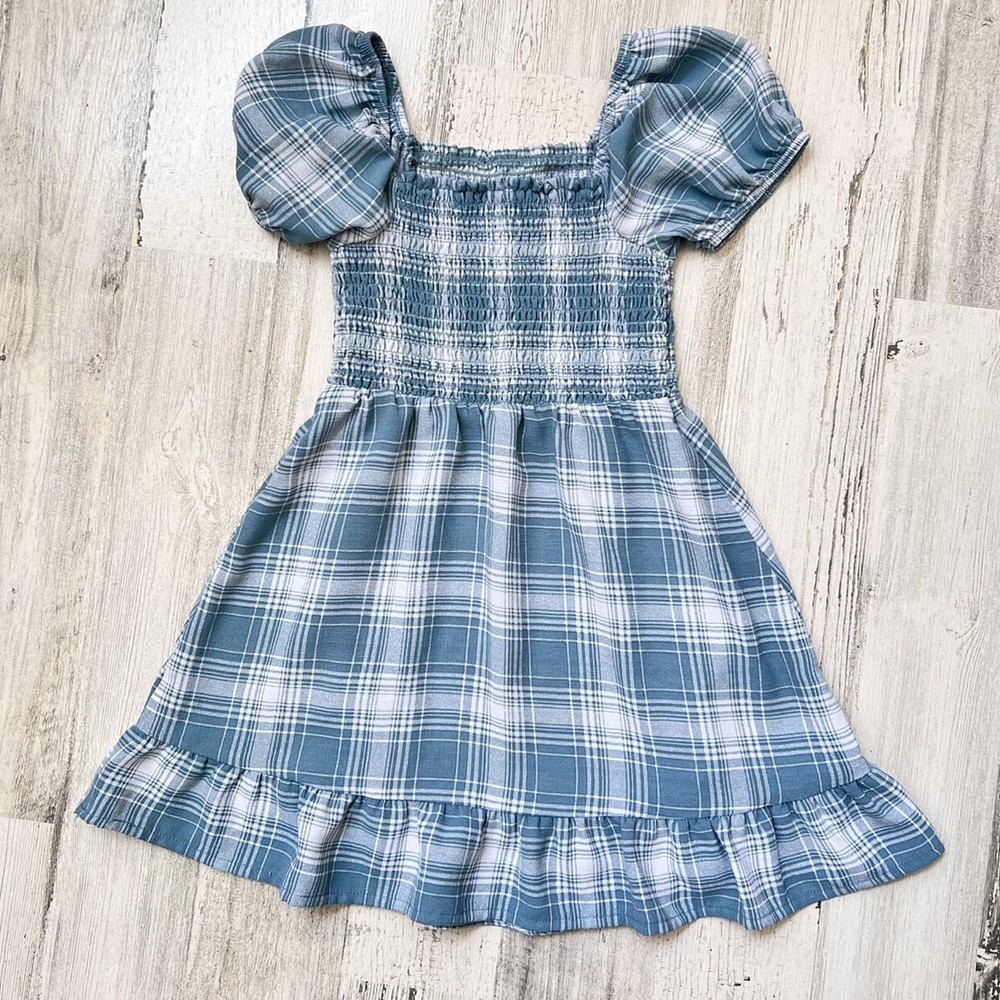 A sweet plaid dress from Wonder Nation with a smocked bodice and faux tortoise shell buttons. Designed with puff sleeves, a square neckline, and a faux wrap ruffle hem for a playful finish. Styling suggestions: Pair with tights and a cardigan for fall, wear with sandals in summer, or layer with a denim jacket for casual outings. • Brand: Wonder Nation • Size: 4-5 (XS) • Color: Light teal & white plaid • Material: 100% polyester • Style: Dress • Features: Puff sleeves, smocked bodice, faux button front, faux ruffle wrap hem • Neckline: Square • Sleeve: Puff sleeve • Closure: Pullover • Dress Length: Above knee • Fit: Regular • Pattern: Plaid • Occasion: Casual, School, Everyday • Season: Spring, Summer, Fall • Condition: Very good used condition (minior small stain at hem shown in photos) • Style aesthetics: playful, casual, classic, trendy, sweet, girly, comfy, versatile Ships from the USA. No customs delays, no surprise import fees. Clean, smoke-free, pet friendly home. Bundle to save!