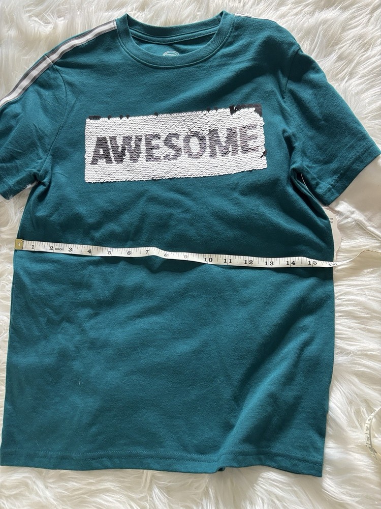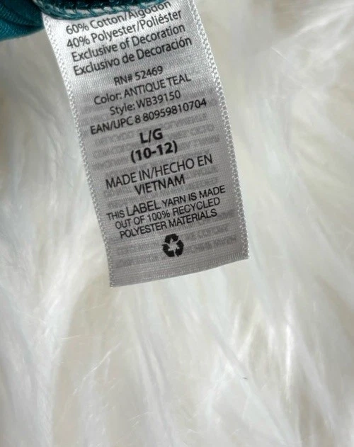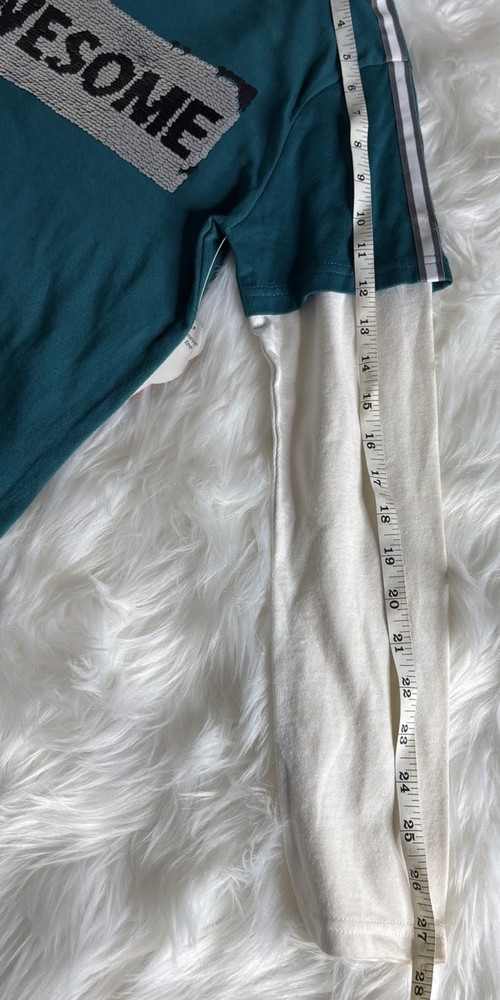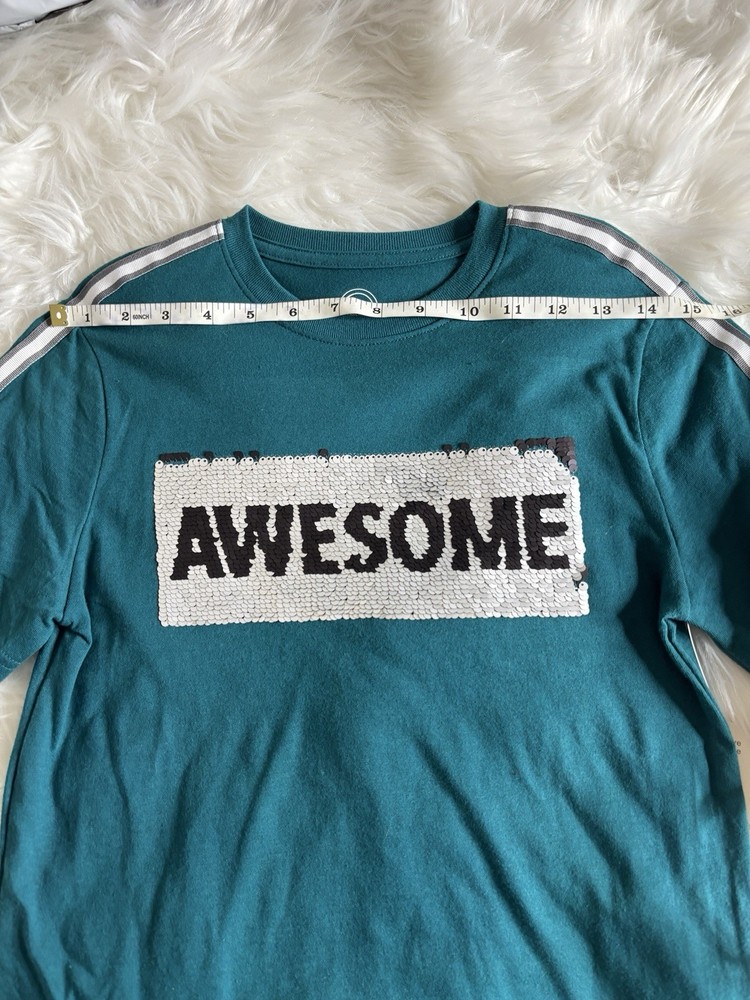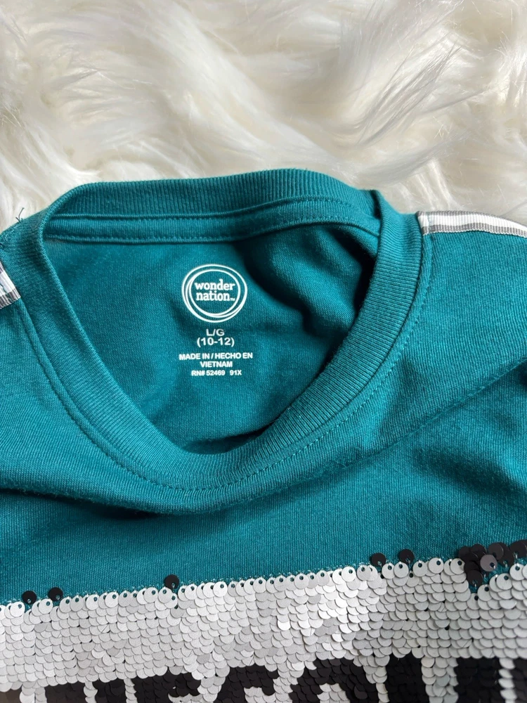 The Wonder Nation Girls Awesome Shirt in size Large 10-12 is a stylish and versatile pullover top perfect for various occasions such as travel, parties, and casual wear. Made from a comfortable cotton/polyester blend, this shirt features studded silver accents and a round neckline for added flair. The teal green, off white, silver, and black color combination adds a fun and vibrant touch, while the long sleeves and lightweight fabric make it ideal for the winter, fall, and spring seasons. With a regular fit and machine washable design, this shirt is both practical and trendy for young girls looking to add an awesome top to their wardrobe.