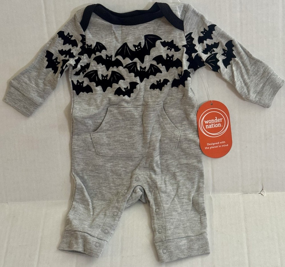 Wonder Nation Infant Bat Print Long Sleeve Halloween Theme Romper. Snap leg closures. Front pocket. Unisex. Size 0-3 months. New with tags.