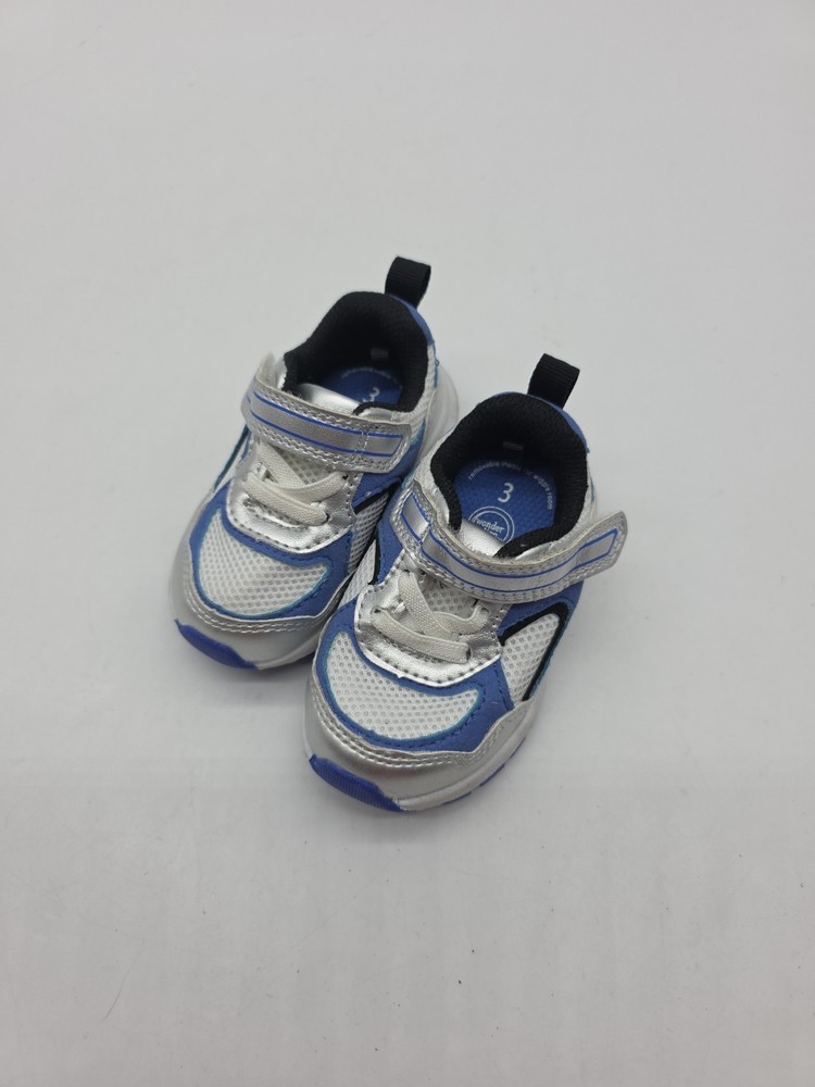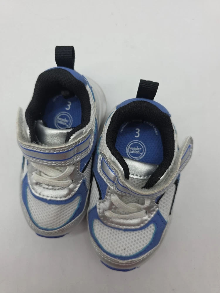 The Wonder Nation Shoes Sneakers in Boy Size 3 are stylish athletic sneakers designed for young boys. These blue sneakers feature a lace strap for easy and secure closure. Made with fabric material, these sneakers are durable and comfortable for active little ones. Perfect for everyday wear or special occasions, these Wonder Nation shoes are sure to make any toddler happy.