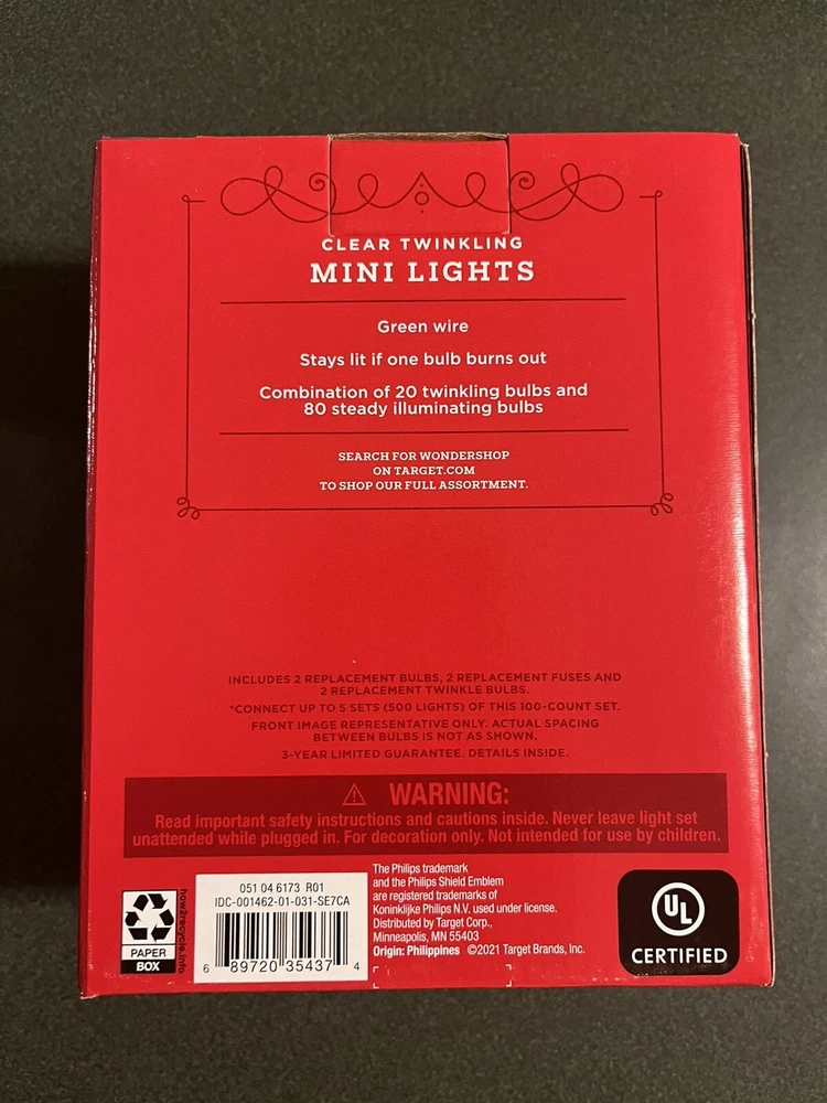 Add a touch of magic to your indoor or outdoor space with Wondershop's Twinkling Clear Mini Lights. With 100 lights, you can create a stunning atmosphere for any occasion, from bridal showers to beach parties. The clear white light color and ultra daylight color temperature of 6500 K+ give a warm and inviting glow to your venue. These corded string lights feature a wall switch control style and are powered by electricity. The bottle-shaped light shape and starry theme make them perfect for all occasions, whether you're celebrating love or holiday cheer. With a 3-year manufacturer warranty and energy star rating of 2 stars, you can enjoy these lights for years to come. Upgrade your space today with Wondershop's Twinkling Clear Mini Lights. HARD TO FIND - TARGET BRAND -