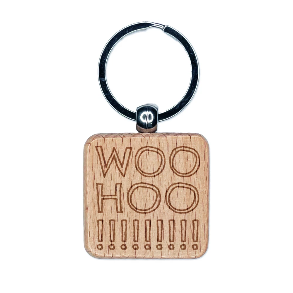 Woo Hoo Outline Fun Text Engraved Wood Square Keychain Tag Charm