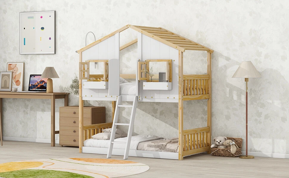 Wood Bed Frame Twin over Twin House Bunk Bed with Roof , Window & Ladder Natural Features [Wood House Roof bunk Bed ] The unique design of wood house bunk bed with windows,door,ladder,provides kids with endless imagination and access to the natural woods, while they go to bed and fall asleep. This bed not only gives them a lot of fun, but also add to their imagination and creation. They can put various decorations and accessories on the window boxes to accompany their whole sleep and daily activities. [Low Height Design] The low height feature of this bunk bed not only ensures better stability but also reduce safety concerns, offering many restful nights of lasting sleep. In addition, the ladder is designed with a wider width to provide more spacious steps and solid support, making it easier for you to climb up and down the ladder. [Safety and Quality Guaranteed] This bunk bed is mainly crafted from premium pine wood, its bottom frame structure providing lasting sturdiness and durability. The bunk bed is constructed with firmly secured structure, forging strong stability that ensures the safety of users while resting in the loft bed. The high guard rails surrounding the bed will further protect users from falling off the bed. [Stylistic Elements] The elegance of the bed is reflected from the contemporary minimalistic design of its structure, suiting interior designs of all. Moreover, there are a variety of classic colors that you can choose, which you believe suits your children's bedroom the most. The abundant space underneath the bed offers better organization of storage space, allowing your bedroom to be neat and tidy. [Easy Assembly] The bunk bed is delivered in two packages, along with the installation manual and full set of hardware necessary to guide you through the process of assembly, and the bed will definitely be assembled conveniently. Description Twin over Twin House Bunk Bed with Roof , Window, Window Box, Door Just give kids a lovely, interesting bunk bed featuring a wood house through their childhood, keep your kids as close to the natural atmosphere as possible, create their beautiful playground, where they are playing around the wooden house joyfully and intrigue their imagination about the unexplored world . The sturdy structure with full-length guardrails of the low height bed assures the kids of the sound and safe sleep. We prepared for a clear assembly instruction to guide you to fix our product easily. Description Product Type House Bunk Bed Size Twin over twin Color Natural+White Material (main) Pine + Plywood +PB Number of Slats Top Bed: 14 pcs / Floor bed: nil Spring Box No need Assembly Required Yes Manual and Hardware Yes Country of Origin Vietnam Technical Details Overall Product Dimension 81.7" x 57.8" x 86.9" Overall Product Weight 134.5 lbs Package Details Please refer to the Specification Bed Weight Capacity Bed: 200 lbs Suggested Mattress Thickness 6 inches or less