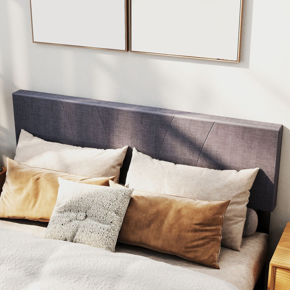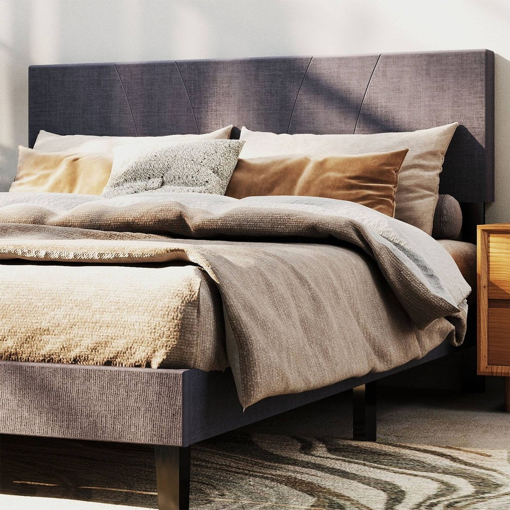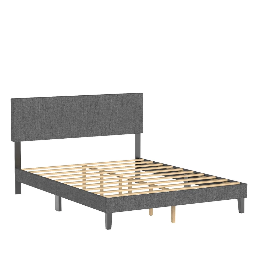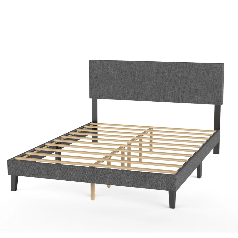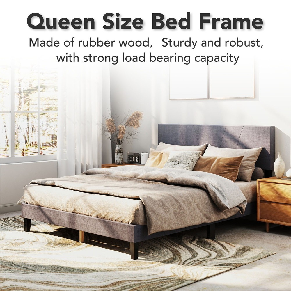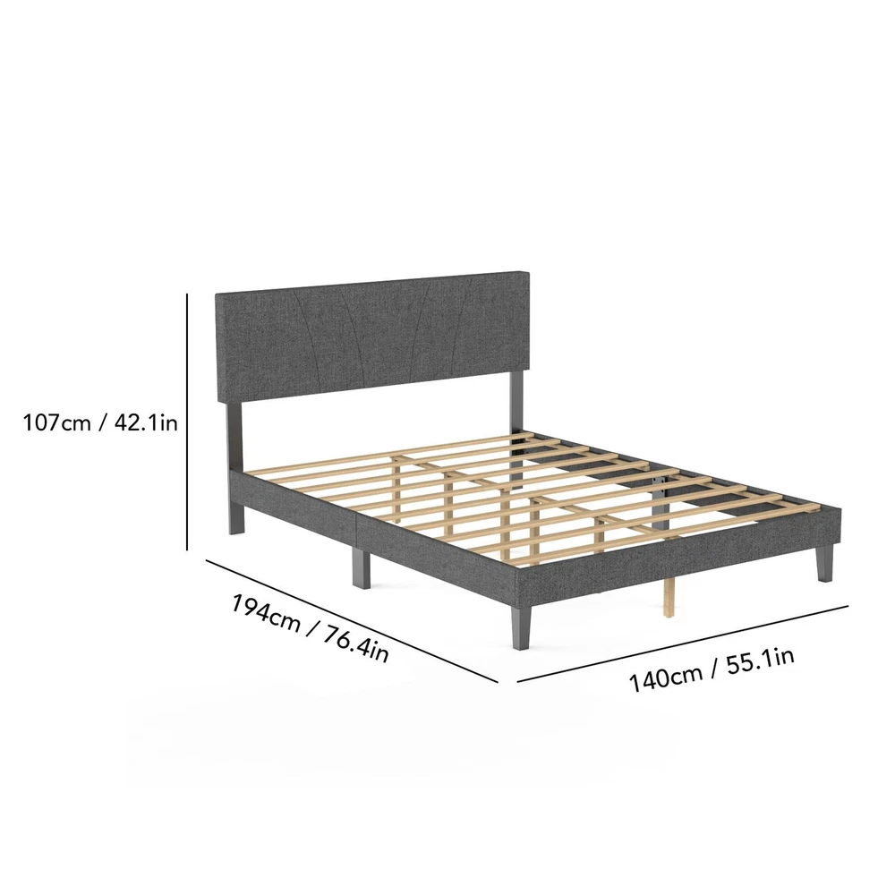 Feature: 1. [Sturdy Support Structure] This full size wooden bed frame features a metal framework wrapped with high density foam, reinforced by 10 solid wood slats and 6 metal legs for even weight distribution. With a 1200 lb capacity, the platform bed eliminates the need for a box spring while ensuring long lasting stability. 2. [Modern Comfort Design] The upholstered bed showcases a clean lined headboard padded with soft foam and covered in linen fabric. Its minimalist complements various bedroom decors, adding understated elegance to your sleeping space with its muted grey finish. 3. [Quiet Night's Rest] Engineered with noise reducing pads along the central support bar and touch fastener secured slats, this full size bed frame minimizes movement sounds. The quiet mechanism allows undisturbed sleep without creaking or shifting noises throughout the night. 4. [Quick Assembly Process] All necessary hardware and clear instructions are included with the wooden bed frame. Two people can complete setup within 20 minutes thanks to the straightforward interlocking system and pre drilled components for no hassle installation. 5. [Dimension Optimized] Measuring 76.4 x 55.1 x 42.1in (Full size), the upholstered platform bed fits standard mattresses. Crafted from robust rubber wood, its proportional design maximizes space efficiency while maintaining generous sleeping area for couples or individuals. Specification: Item Type: Full Bed Frame Material: Rubber Wood Size: Approx. 194 x 140 x 107cm / 76.4 x 55.1 x 42.1in Weight: Approx. 24600.00g / 867.74oz Package List: 1 Set x Bed Frame 1 x Instruction Manual