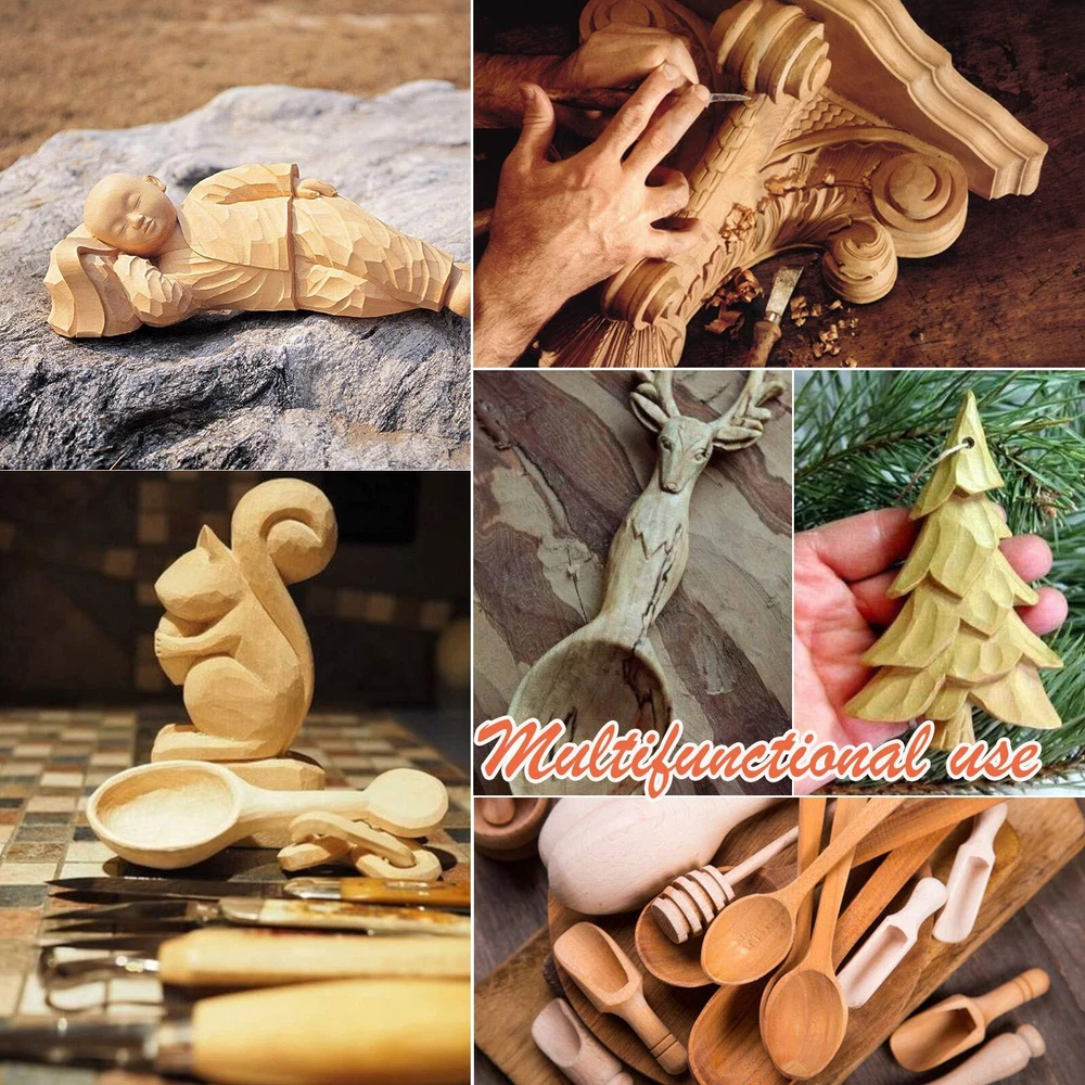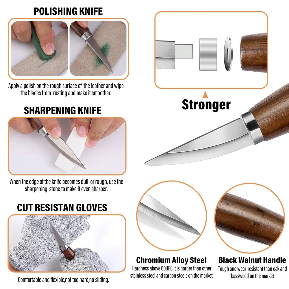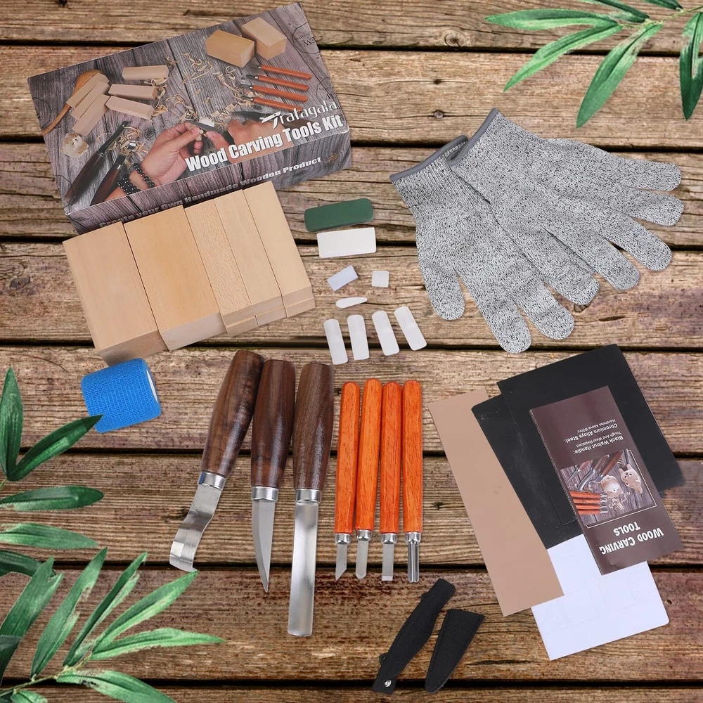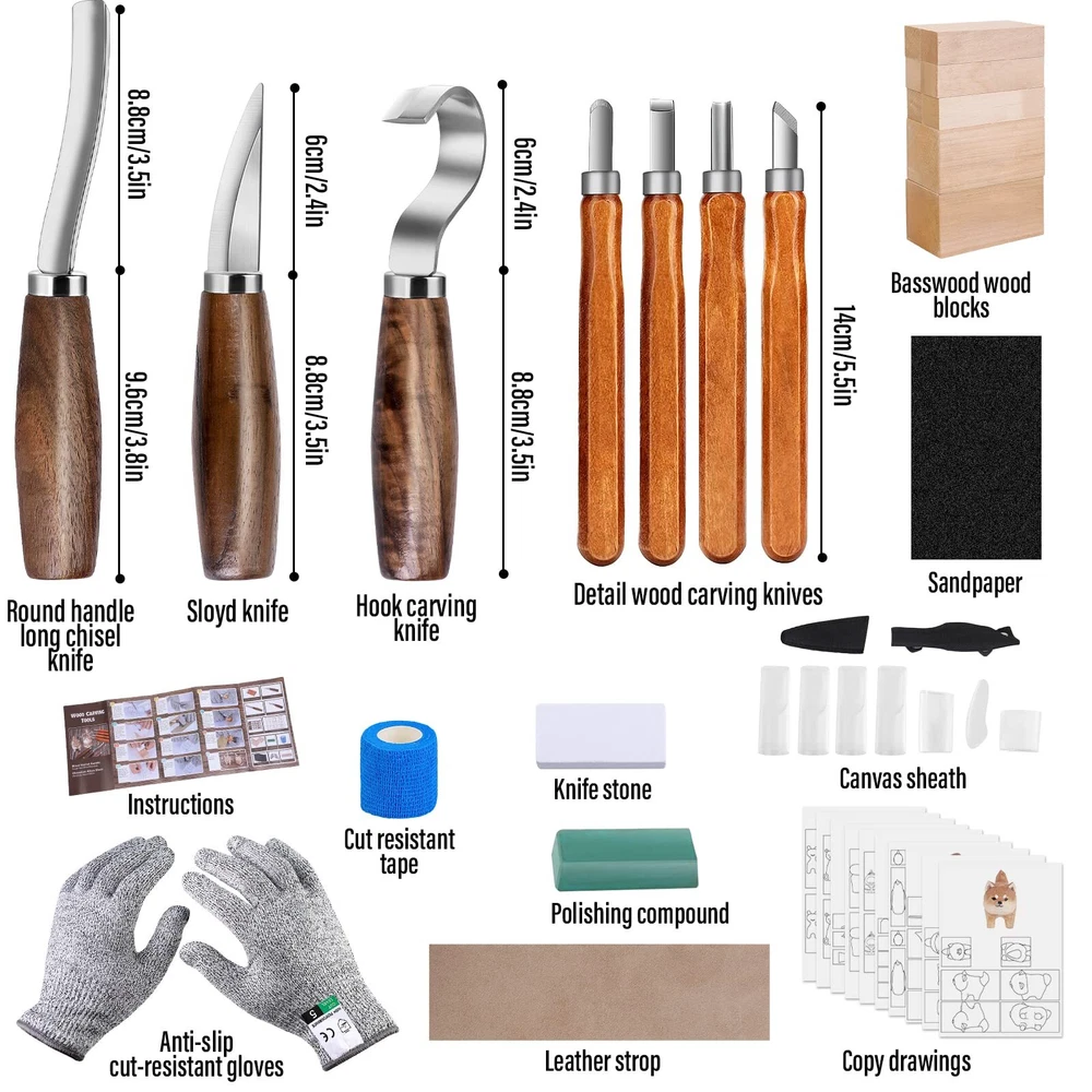 🏆 All In One Wood Carving Tools Kit --- The wood carving kit includes 3 kinds of whittling knives,4pcs sk2 carbon steel wood carving knives,8 basswood wood blocks,4pcs sandpapers1 polishing compound,1 leather strop,1sharpening stone,1 roll of cut resistant tape,1 pair of gloves,drawings and carving step instructions.Our wood carving tools kit can help beginners easily carve different animals, which is the perfect carving experience. 🏆Premium Quality Wood Carving Knife --- Our wood carving knives are made of chrome vanadium alloy steel,feature excellent sharpness, high hardness to keep knives edge razor-sharp and not curling after several wooden carving,and exceptional corrosion resistance. ⭐NOTICE: Due to the limitation of the production process, the hook knife you receive will be dull, please sharpen it before use. 🏆Walnut Handle of Whittling Knife --- Black walnut as the woodcarvers first choice create comfortable green wood carving tools. Handle length about 4inch, no matter adult and older kids are able to hold carving wood knife tightly. 🏆Engrave Everything Wood Carving Kit --- The wood carving set can carve just about anything you can imagine!Sloyd knife is good at whittling and taking bigger chunks of wood.Hook carving knife plays a leading role on perfect for digging out grooves.Round handle long chisel knife can dig out deep grooves,like bowl.Then you can use sk2 carbon steel wood carving knives to do tiny details and caricature carving. You can easy get woodcrafts like spoon, bowl, cat,dog,bird etc. 🎁Perfect Holiday Gift Idea --- The professional wood carving knife set is perfect for carving unique and original designs while passing time around the fireplace. It's the perfect gift for beginners all the way to advanced wood carver! Those wood carving knife comes with the highest quality blades,sharp, precise and durable,to satisfy all your wood carving creativity!A perfect gift for Birthday, Christmas, Halloween, Thanksgiving, Valentine's Day.