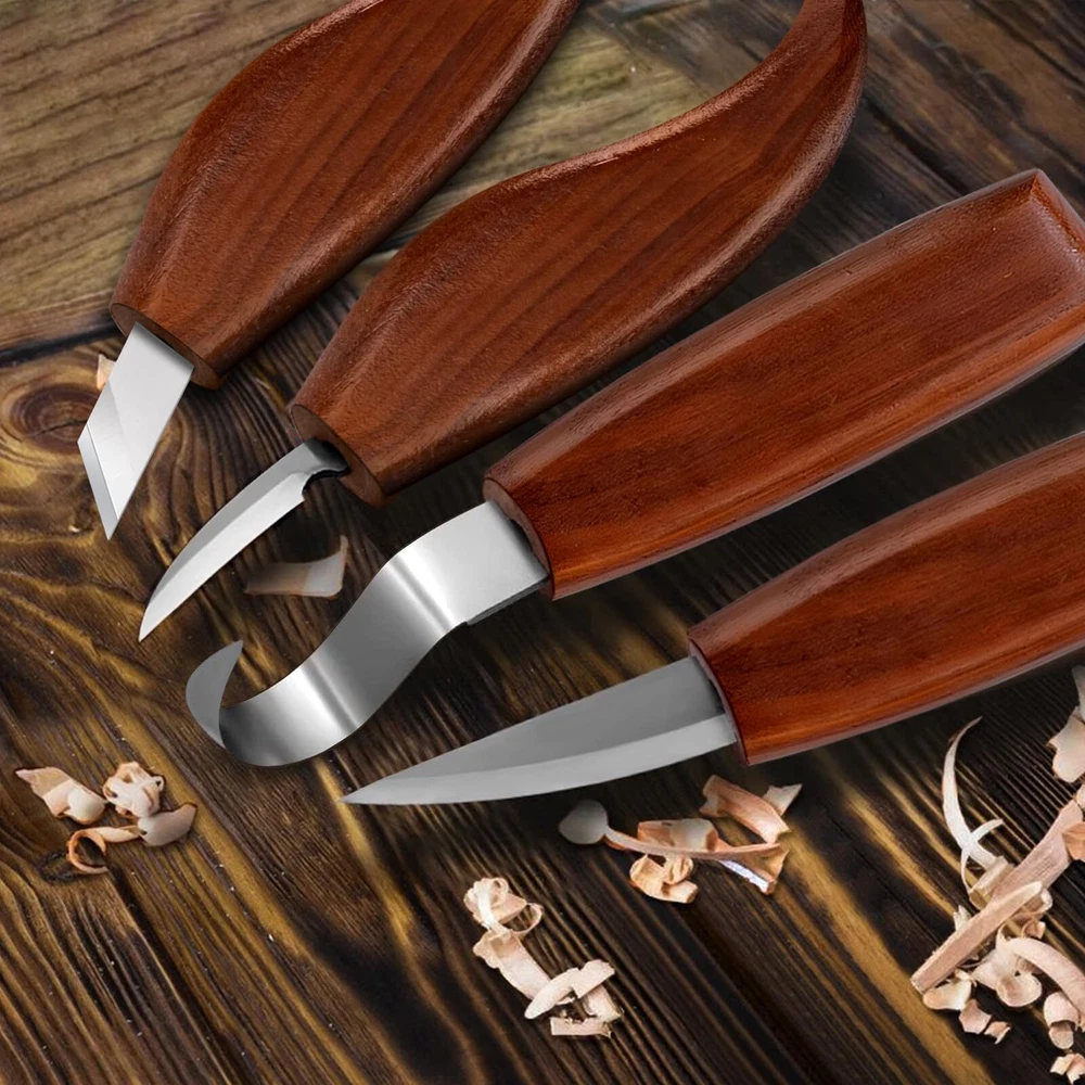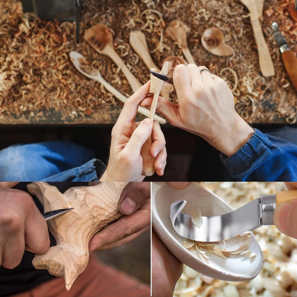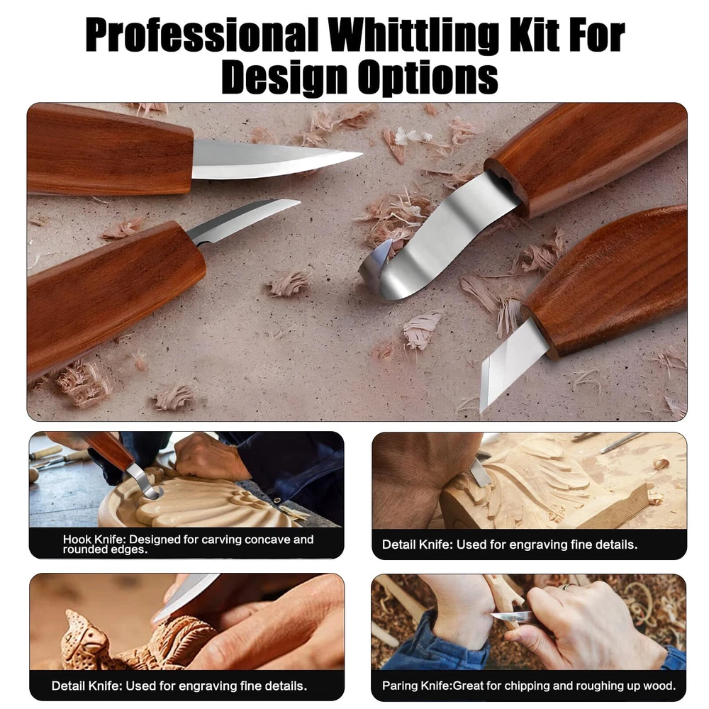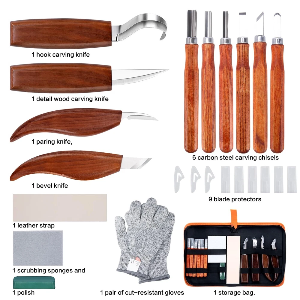 Wood Carving Tools Set, Wood Whittling Kit for Beginners Kids and Adults - Wood Carving Kit with Detail Wood Carving Knife, Whittling Knife, Wood Chisel Knife, Gloves, Carving Knife Sharpener Wood Whittling Kit Package Included Wood Carving Knife *10 knife Blade Protector *9 Storage Bag *1 Wood Carving blank*1 Leather Strop*1 Polishing Compound *1 Frosted Sponge *2 Cut Resistant Gloves * 1 pair Wood Carving Set Advantage ★Ergonomic handle The handle is round and comfortable. ★Cut Resistant Gloves Protect your hands ★Portable Roll Bag You can use them anywhere for easy storage and portability. Wood Carving Knife *10 ★4pcs wood carving knives Wood Carving Details Knife Wood Carving Sloyd Knife Wood Carving Hook Knife Wood Carving Oblique knife ★6pcs carbon steel carving chisel knives This wood carving tool set is a perfect gift for beginners to advanced sharpeners, it can satisfy your wood carving creativity, allowing you to enjoy the fun of wood carving creation by creating your own wood carving art, allowing you to relax from a busy day . 【Wood Carving Tools Set】Whittling knives set Including 1 hook carving knife, 1 detail wood carving knife, 1 paring knife, 1 Oblique knife, 6 carbon steel carving chisels, 9 blade protectors, 1 pair of cut-resistant gloves, 1 wood carving blank, 1 leather strap, 1 polish, 2 scrubbing sponges and 1 storage bag. 【Grip & Metal Cover】With 4 main carved handles made of smooth and durable black walnut, the Wood carving knife tool set is ergonomically designed to reduce hand fatigue. The sharp blade also features a metal cover to hold the blade in place and prevent the blade and handle from breaking. 【Multifunctional Wood Carving Tools】Widdle wood kit for beginners kids, you can freely carve various shapes of wood blanks. Detailing knives and engraving knives are suitable for working with concave or rounded woods, while 6 piece detailing wood carving knives can be used to add fine lines and decorative patterns. 【Cut-Resistant Gloves】The equipped cut-resistant gloves can effectively protect hands from cuts and abrasions. The glove is flexible and comfortable, stable and not slipping when operating. 【Enjoy Wood Carving Fun】This wood carving tool set can meet your various wood carving creation needs,wood whittling knife kit is a perfect gift from beginners to professional knife sharpeners! Use your own craftsmanship to create woodcarving works for your family or friends, and enjoy the fun of woodcarving.
