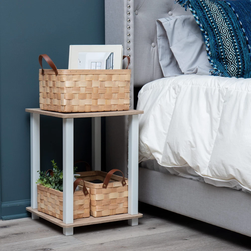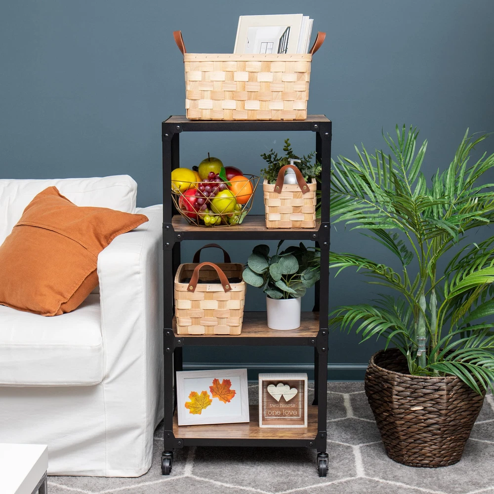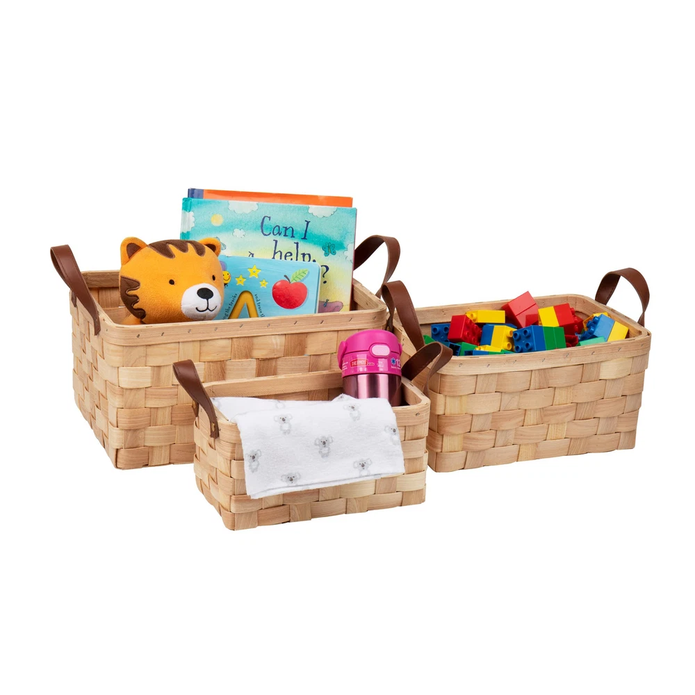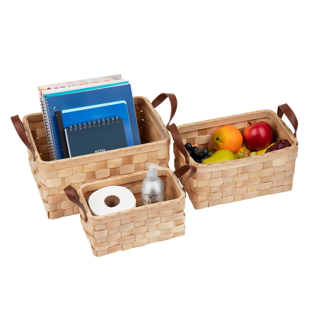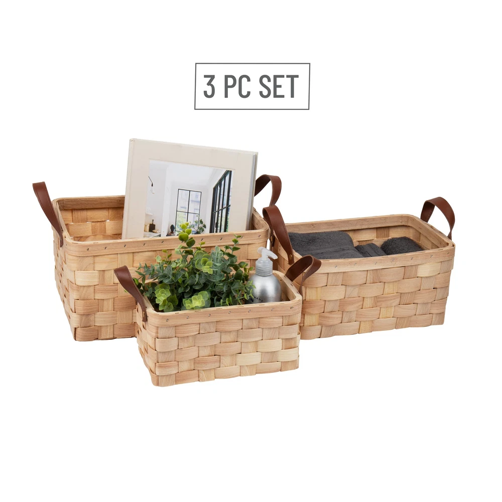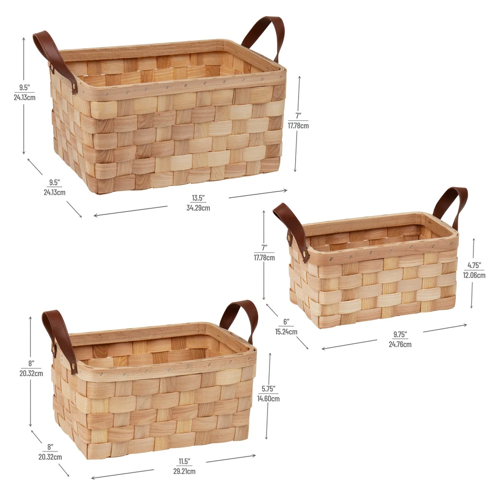 Basket Organization You Can Handle This set of three woodchip storage baskets nest within each other but can hold dozens of small items. Combined, the three baskets weigh 1 lb 4 oz (567 g) so you can easily carry any of the baskets from place to place using the faux leather handles. The baskets are durable and can handle daily use. You can clean the baskets and handles with mild soap and a soft wet cloth if needed. You can the baskets on shelves, tabletops, or in a closet. toys, small bathroom toiletries, kitchen napkins, and office supplies — versatile for almost every room in your house. The small basket measures 6 long x 9.75 wide x 4.75 inches tall (15.24 x 24.77 x 12 cm), the medium basket measures 8 long x 11.5 wide x 5.75 inches tall (20.32 x 29.21 x 14.6 cm), and the large basket measures 9.5 long x 13.5 wide x 7 inches tall (24.12 x 34.29 x 17.78 cm). This basket set makes a great gift for the organized person in your life, a housewarming present, or a just-because thoughtful gift. Classic woven design: The three baskets have a thick-weave design and a dark faux leather handle Helpful for the organized person: You can toys, kitchen items, bathroom hygiene items, and trinkets in any of the three baskets Save spacing: Each of the three baskets nest perfectly within the other when not in use Durable and easy to clean: Made of woodchip and woven tight, these nested storage baskets are durable and easily cleaned with mild soap and a wet cloth Dimensions: The small basket measures 6 long x 9.75 wide x 4.75 inches tall (15.24 x 24.77 x 12 cm), the medium basket measures 8 long x 11.5 wide x 5.75 inches tall (20.32 x 29.21 x 14.6 cm), and the large basket measures 9.5 long x 13.5 wide x 7 inches tall (24.12 x 34.29 x 17.78 cm)