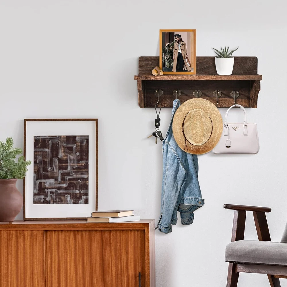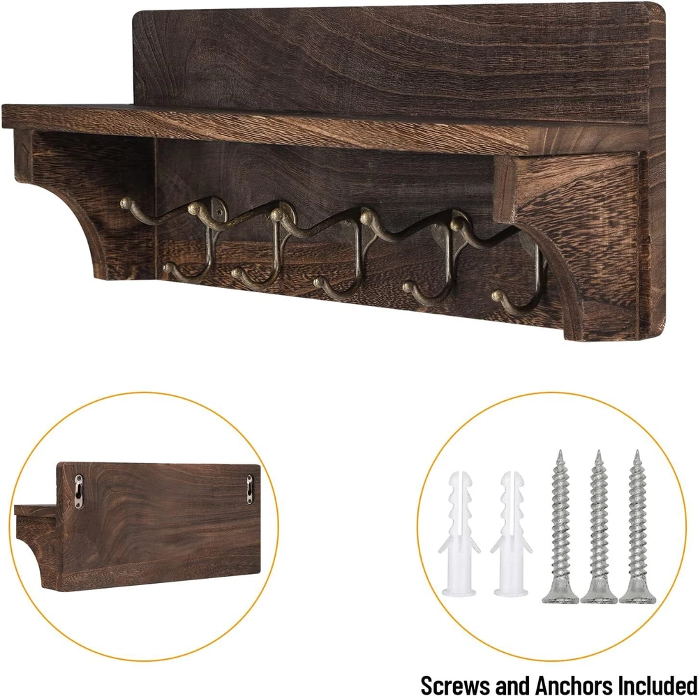 [High Quality of Rustic Coat Rack]: Our rustic wall mounted coat hooks with shelf are made from 100% solid fir wood. Our wood is hand selected to great quality and endurance. The unique rustic finish of our wall-mounted coat rack will bring function and farmhouse flair to the foyer [Unique Design Coat Rack for Space Saving]: Our entryway shelf with 5 hooks can hang any coats, purses, jackets, leashes and more. These hooks are perfect for saving your room space and make your home tidy and stylish. Upper with a flat shelf in this rack is convenient for holding like letters, mails,books or displaying picture frame, and some small plants or any other small items [Get Organized with Our Coat Rack]: Declutter your home with this stylish and practical entryway shelf. Utilize the coat hooks with shelf for extra organizing space or for decorative purposes. Use the upper flat shelf and hooks to store all your loose items and give a new clean yet rustic look to your home. to keep your home or office neat and organized, and it's very space-saving [Easy to Install]: This wall-mounted coat rack is easy to install with screws and anchors included making ready to hang out right out of the box. Our wood wall mounted coat hanger is 15 inches long, 6.3 inches tall, and 3.9 inches wide [ risk-free shopping]:We are confident in our products and stand behind them . Just reach to us with any questions or concerns and we will be happy to help in less than 24 hours Product Description Our Rustic Wall Coat Organizer will save you space and look great! The unique rustic finish color looks great in modern, industrial, or rustic style homes. It also comes with 4 metal hooks to help you organize your kitchen, bathroom, entryway, mud room, hallway or anywhere else! Entryway Coat Rack with Hooks Features: GOOD MATERIAL: Made of 100% solid fir wood material and stainless steel hooks, this rustic coat rack is stable, durable, stylish and sturdy, and easy to clean. SPACE SAVING: This wall shelf is perfect to be used in living room, bedroom, hallway, balcony, kitchen or other suitable place, to keep your home or office neat and organized, and it's very space-saving. EASY to INSTALL: This wall-mounted coat rack is easy to install with screws and anchors included making ready to hang out right out of the box. MULTIPURPOSE RACK: Combined hook and shelf design, this hook rack is perfect for saving your room space and make your home tidy and stylish. Upper with a flat shelf in this rack is convenient for holding books, picture frame, keys and some small plants or any other small items, and 5 dual coat hooks can be used for hanging bags, coats, umbrellas, towels, etc. MULTIPURPOSE RACK Bathroom Kitchen Livingroom High Quality Stunning Hardware Our entryway shelf with 5 hooks can hang any coats, purses, jackets, leashes and more. These hooks are perfect for saving your room space and make your home tidy and stylish. Suit Size Coat Rack Our wood wall mounted coat hanger is 15 inches long, 6.3 inches tall, and 3.9 inches wide.The coat rack with shelf are perfect for saving your room space and make your home tidy and stylish. Easy to Install This wall-mounted coat rack is easy to install with screws and anchors included making ready to hang out right out of the box. Package Included: 1 x Coat Rack 3 x Screws(1 spare) 2 x Dry Wall Anchor Specification: ●Color: Dark brown(Retro). ●Weight capacity: 30lbs(15kg). ●Material: solid wood. ●Dimensions:15 x 3.9 x 6.3 Inch. Add to Cart Add to Cart Add to Cart Add to Cart Customer Reviews 4.6 out of 5 stars 326 4.5 out of 5 stars 459 4.6 out of 5 stars 340 4.2 out of 5 stars 29 4.3 out of 5 stars 33 Price $20.99 $ 20 . 99 $20.99 $ 20 . 99 $18.49 $ 18 . 49 $18.99 $ 18 . 99 — material solid wood solid wood solid wood solid wood solid wood color brown black white black black