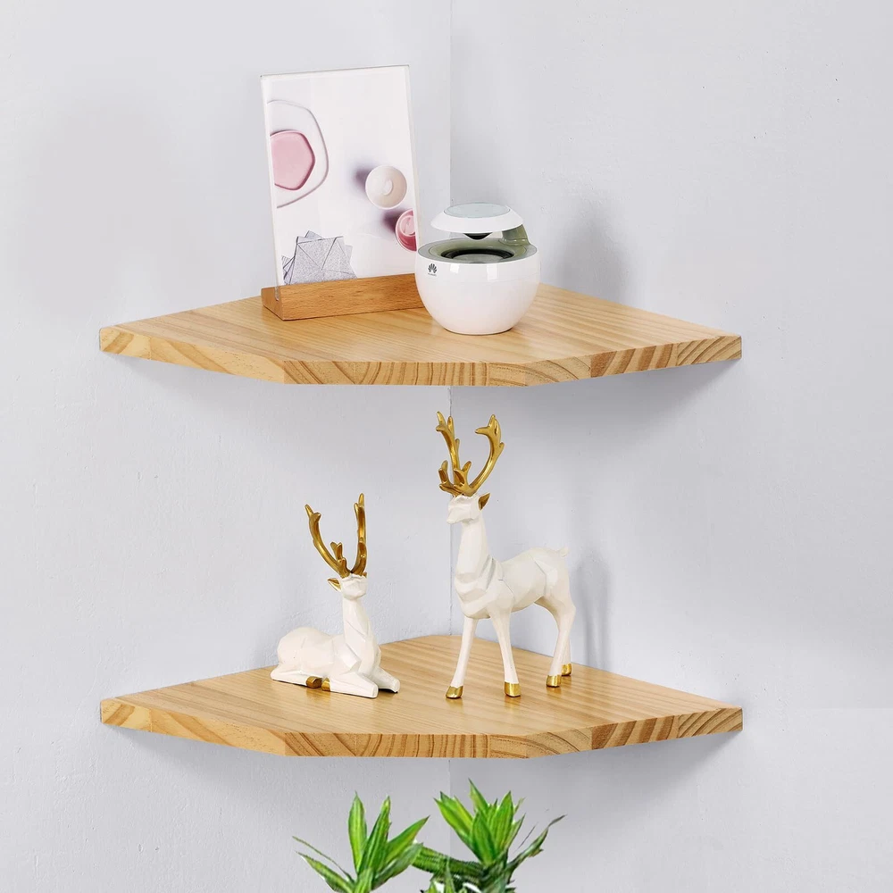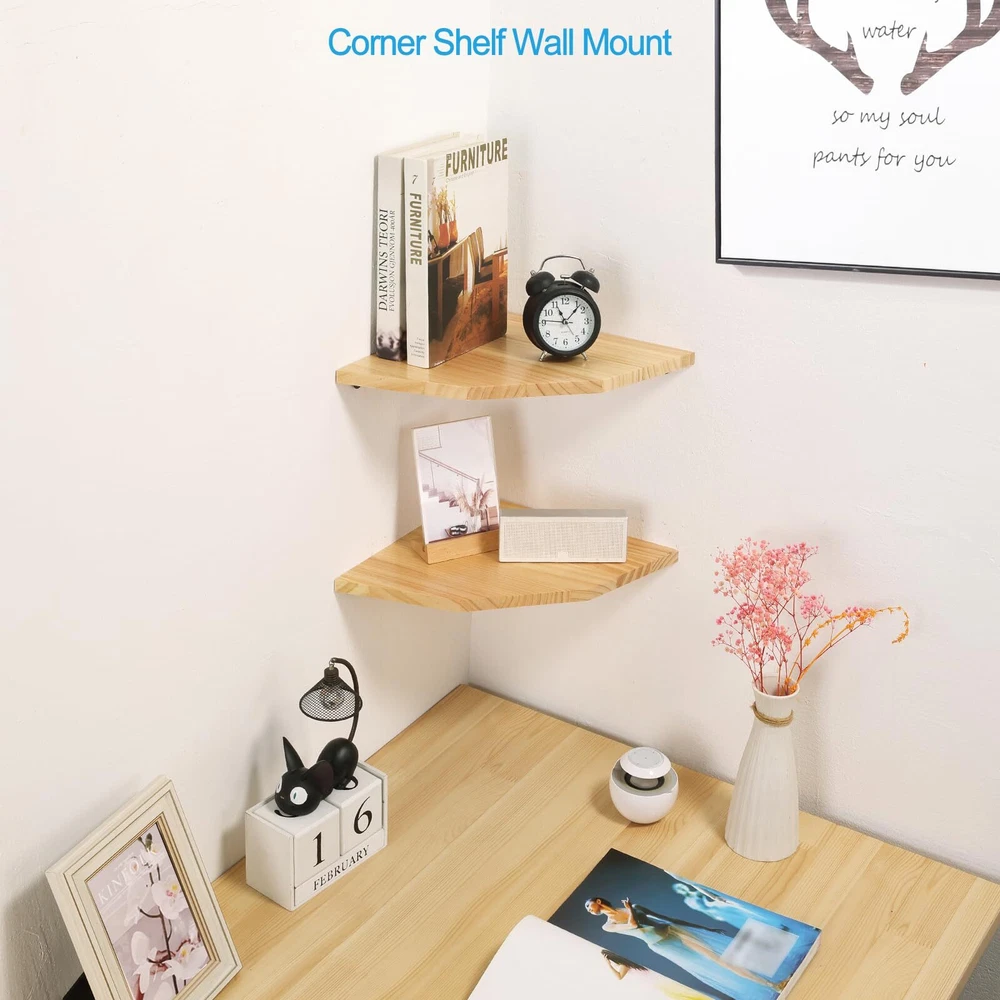 Solid Wood Corner Wall Shelf: These corner wall shelves are designed with natural wood and stainless steel brackets, made of 100% Premium Solid Pine Wood, green and pollution-free. Our sturdy and beautiful corner shelves are suitable for any corner of your room to display your favorite decorative items. Space Saver Floating Corner Shelves: Do you have empty corner wall where you could use some additional storage and organization? Our corner shelf can meet your needs, very useful for adding extra storage space to and reorganize small items in your bedroom, living room, kitchen and more. It will be a great space saver. Efficient Corner Shelves Wall Mount: The corner shelf wall mount is 0.7 inches thick and 12 inches long and can hold 48 pounds. Ideal for displaying photos, collectibles, small plants or other decorative items in your living room, bedroom, study, corridor, stairway corner; It is also a good choice to install it to your kitchen for storing spices and condiments. Large Size And Easy To Install: Each wood corner shelf's size is 12Lx12Wx0.7H inches, more width and more depth than others. Wall mount corner shelves include all hardware and installation instructions, you only need to follow the instructions to complete the installation in a few minutes. Specially designed for 90 degree wall corners only! Get Your Home Organized: Wanna turn bare and empty corner into a useful storage and display space? Would you like to neatly display your family photos or exquisite collectibles in your home or office? We provide you with 2 shelves of the same size to meet your storage and display needs.