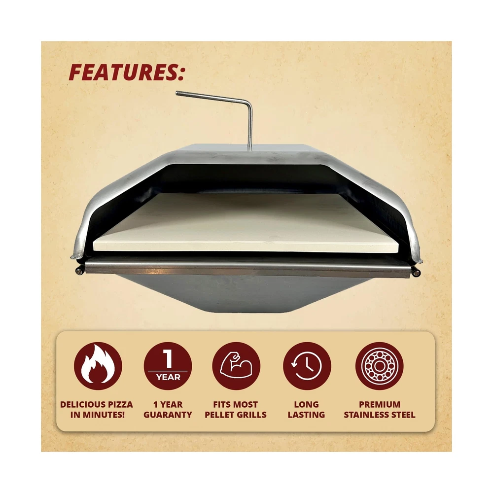 Brand New Wood Fired Pizza Oven Attachment for Most Full Sized Pellet Grills - Compatible with GMG, Traeger, Pit Boss, Camp Chef, Rec-Tec, Smoke Hollow and More Manufacturer model: ULTIMATE PELLET GRILL PIZZA ATTACHMENT: Elevate your pizza-making game with our intelligent pizza oven attachment. Convert your Pellet Grill into a wood pellet-fired pizza oven for an authentic wood-burning pizza experience at home. RESTAURANT QUALITY PIZZA IN MINUTES: Say goodbye to mediocre homemade pizzas. Our pizza oven funnels heat directly from the grill, reaching temperatures of up to 800F, allowing you to cook perfect pizzas in 2-4 minutes. The quick design allows you to enjoy delicious pizza with friends and family in no time. ENHANCED HEAT DISTRIBUTION: The innovative chamber ensures optimal airflow, distributing convective, conductive, and radiant heat for evenly cooked pizzas. Achieve the ideal balance of softness and crispiness in the crust. VERSATILE AND PORTABLE: Compatible with all full-size pellet grills with a center burn pot. Easily installed with adjustable rods. Our attachment is lightweight and perfect for outdoor gatherings. Take it to picnics or camping trips to turn any space into a gourmet pizza haven. UNLEASH THE PIZZA ARTIST WITHIN: Give the gift that ignites culinary passion - the Pellethead Grill Pizza attachment. Perfect for seasoned chefs and aspiring home cooks, this versatile attachment opens the door to a world of delicious possibilities beyond pizzas. Whether you own a Trager, GMG, or any other pellet oven, this attachment is your ticket to elevating your cooking game and indulging in many mouthwatering recipes. Description Shipping and Handling Please allow 5-7 business days for the package to arrive, regardless of buyer location within the US. We will provide an online tracking number to you once the item has been shipped. It may take a few business days for our automated system to process the tracking number onto eBay. However, this will not affect the shipping times. Return Policy All our products are brand new and sealed. All items qualify for returns within 30 days of receipt. Feedback We take our reputation seriously. If you have any questions or concerns, please contact us and we will respond back to your message within 24 hours.