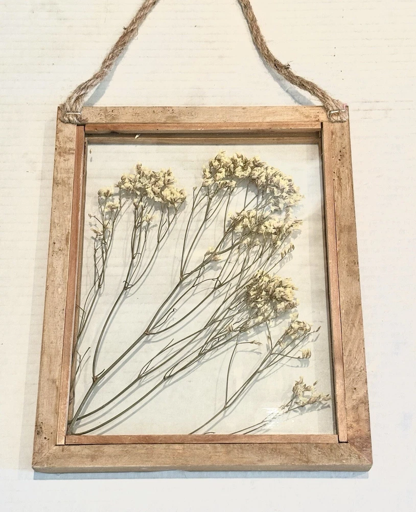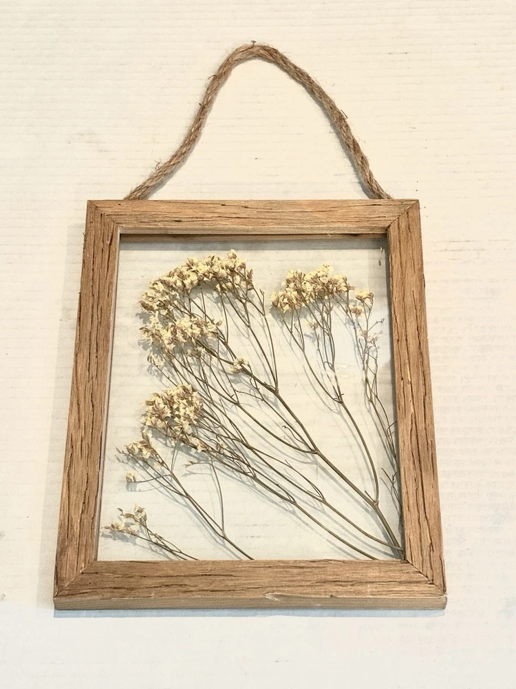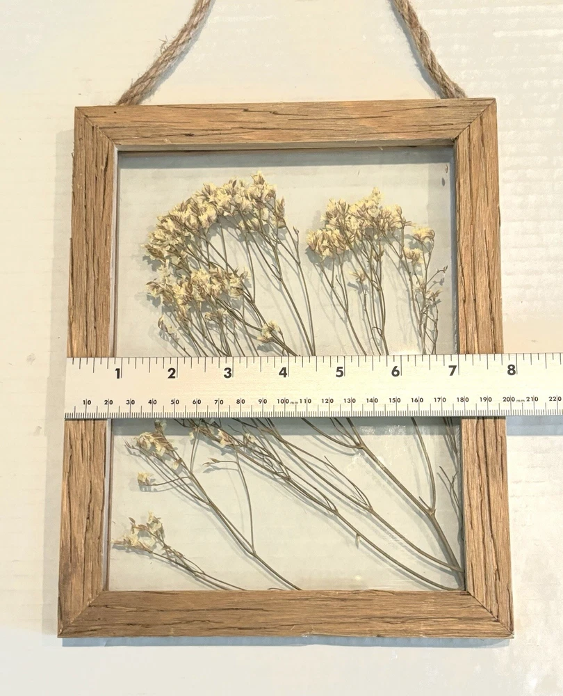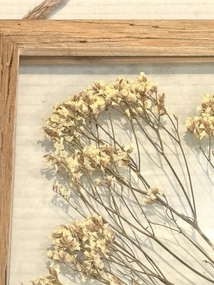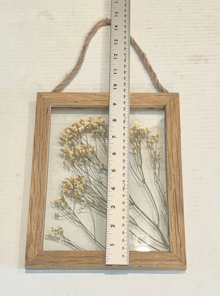 Add a touch of cottagecore charm to your living space with this beautiful handmade art piece. The wood framed pressed yellow flower hanging art is a perfect addition to any small space or window. The intricate design of the flower and the attention to detail make it a unique piece of folk art. This art piece is a one-of-a-kind addition to your collection. The framed piece measures approximately 10 inches in height and 8 inches in length plus about another 5 inches for the rope. Bring the beauty of nature into your home with this stunning piece of art.