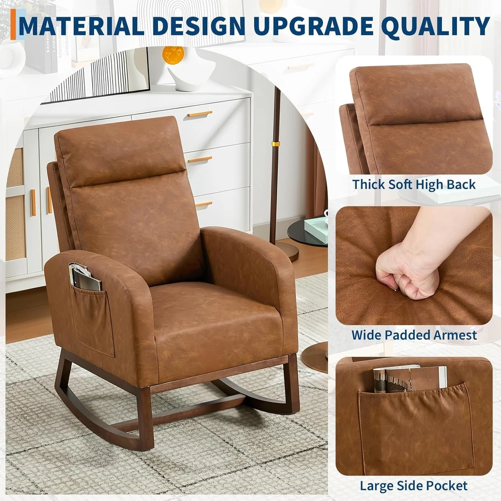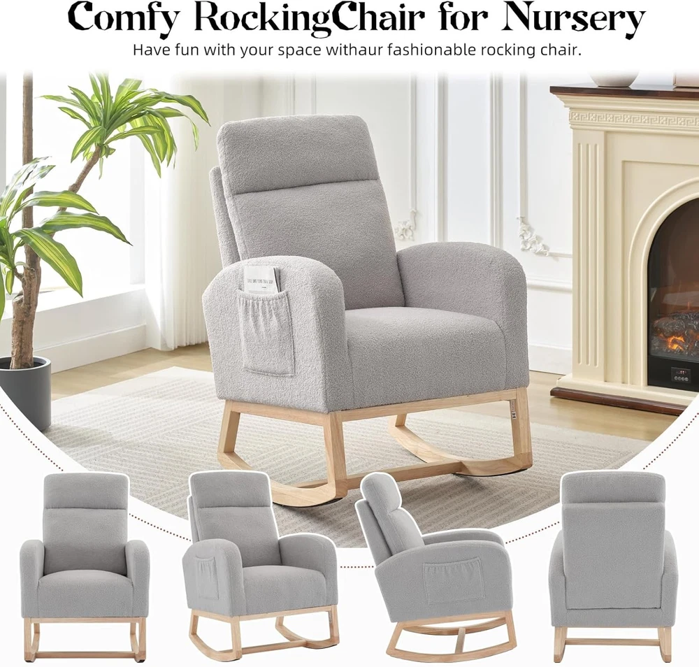 Product description Nursery Rocking Chair:The rocking chair frame is made of solid wood and a thickened rubber wood base,Super sturdy,with a weight capacity of up to 300LBS,The non-slip pad at the end of the wooden legs can not only bring a soothing effect,but avoid scratching the floor. Teddy Velvet Fabric:Upholstered with durable,soft,skin-friendly Teddy fabric that is gentle and non-irritating to the touch.The surface of rocker chair is breathable and easy to maintain.Durable and won't fade,wrinkle or pill over long periods of use. Side Pocket & Anti-tipping Stopper: The rocking chair has a storage pocket on each side that keeps your recently read books or magazines close at hand, making it the ideal reading nook for you. The plastic stoppers installed at the ends of the chair legs keep you from tipping backward Smooth Rocking:The rocking design of this chair is a great choice for mothers to coax their baby into sleep with free hands,When rocking,the angle range is 80°-130°Apart from that,the eleders can sit on rocking chairs to rest or read books to relax their mind and body by smooth rocking,mecedoras para dormir bebes. Versatility: With a combination of elegant appearance and rocking function, this boucle accent chair is ideal for living rooms, nurseries, bedrooms, study rooms and any other room in your house. With this super comfy accent chair, you can create a relaxing and entertaining corner.