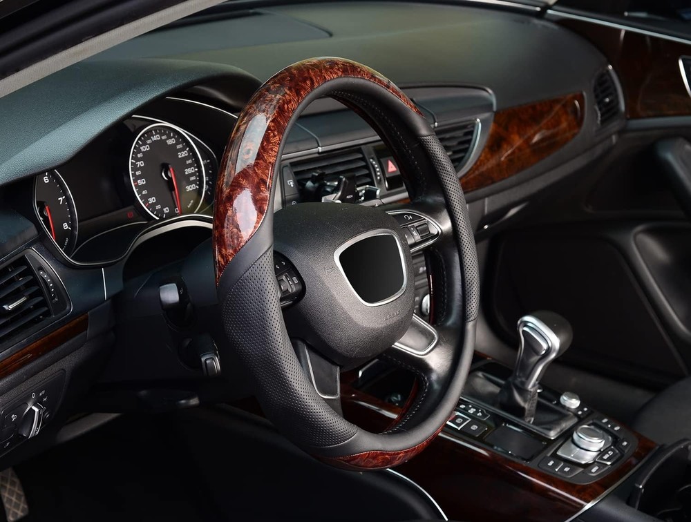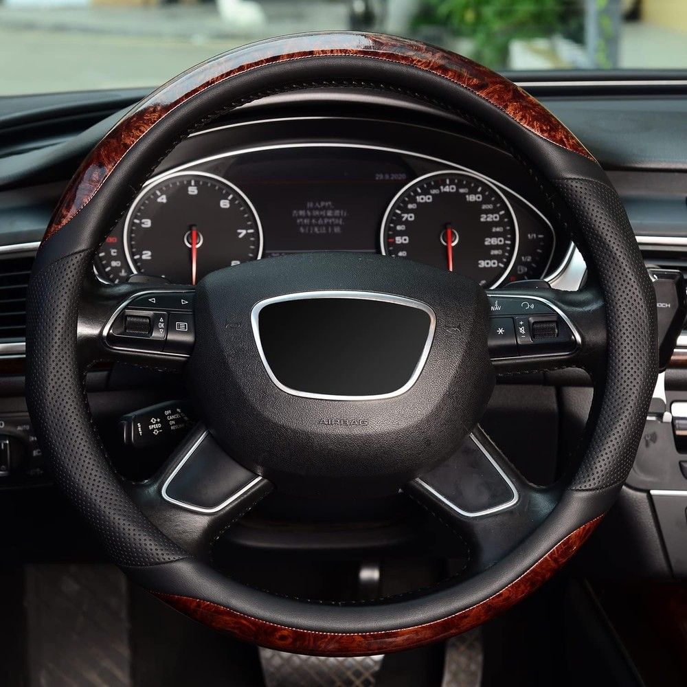 About this item Steering wheel cover made of high-quality durable microfiber leather and wood grain, breathable, comfortable, non-slip, providing a great touch and feel. Healthy and eco-friendly. Improves the life of the steering wheel and offers protection in hot and cold weather. Suitable for medium-Package Dimensionsd steering wheels with a diameter of 11.06 x 3.7 x 3.35 inches. Please carefully measure the Package Dimensions of your steering wheel before purchasing. This wood grain steering wheel cover not only delivers excellent tactile and visual effects but also increases friction to prevent slipping. Suitable for all four seasons. This car steering wheel cover can beautifully decorate your car while massaging your palm. It also protects your steering wheel from sunburn, scratches, fading, and dirt, keeping it in like-new condition. Easy to install; thanks to the malleable material, any adult can easily install this steering wheel cover without tools. Package Dimensions: 11.06 x 3.7 x 3.35 inches.