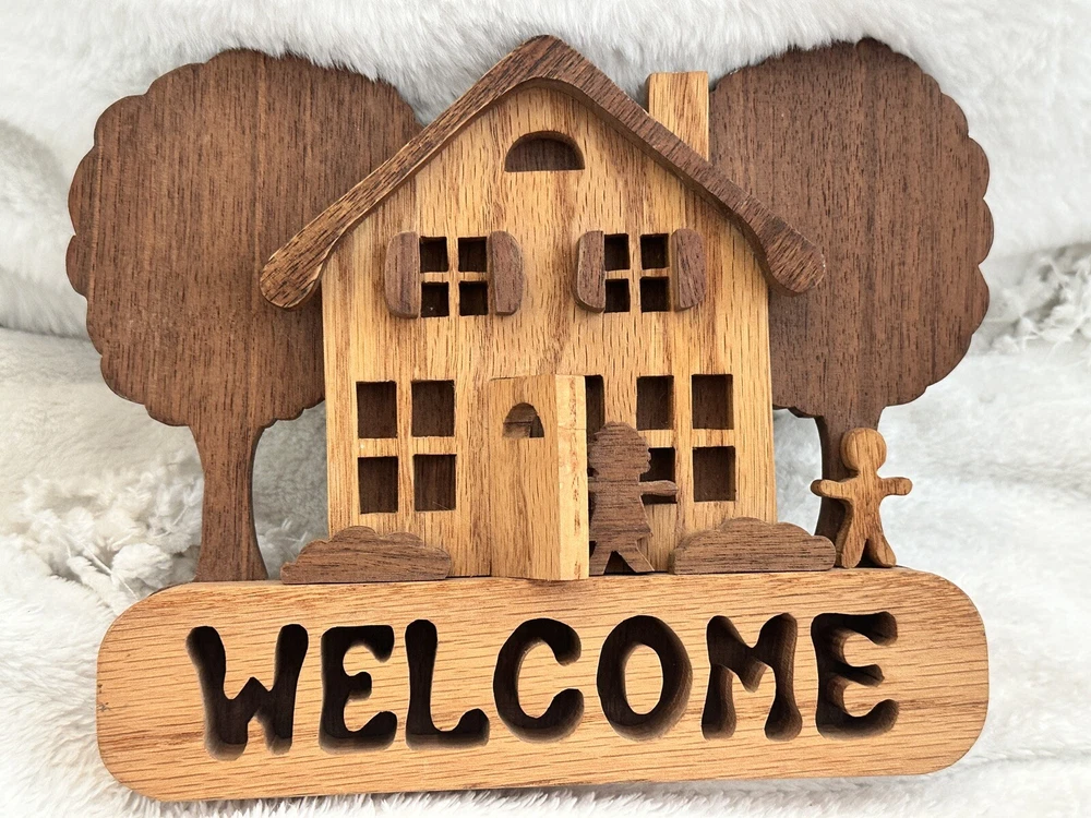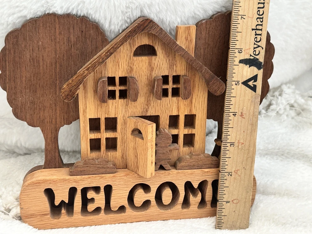 Wooden Welcome sign 1993 signed “BUDS SHOP” Decorate for each holiday like you would your own house and place above a mantle or on a shelf or hang on a wall or from a door it includes a keyhole route.