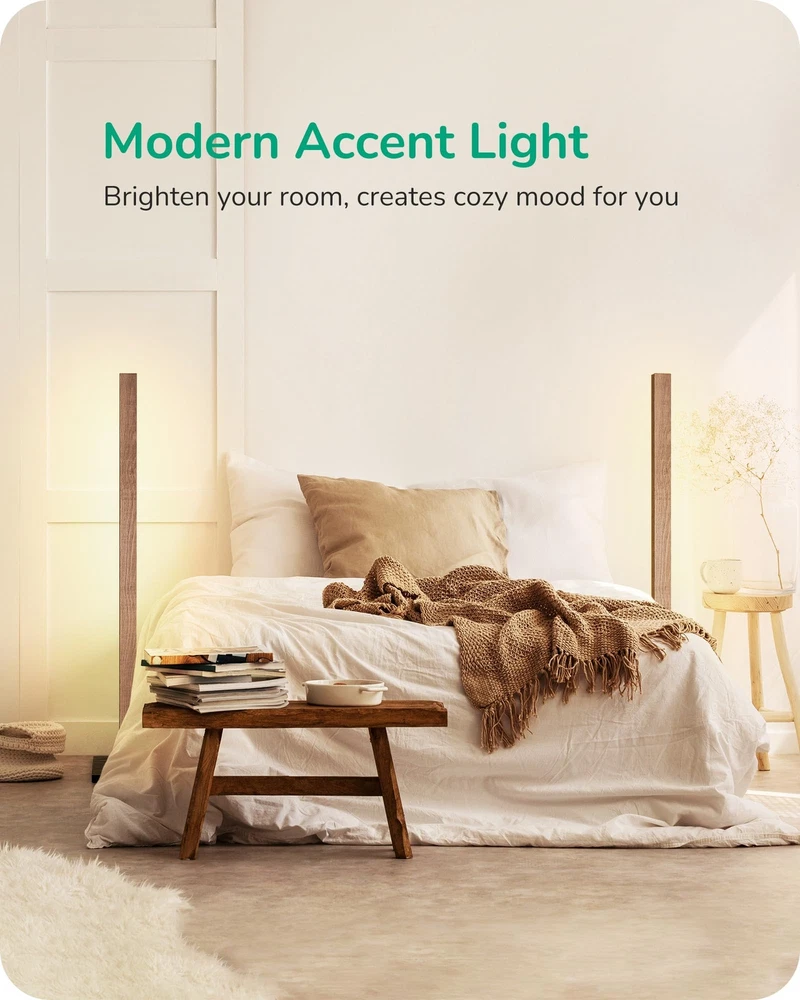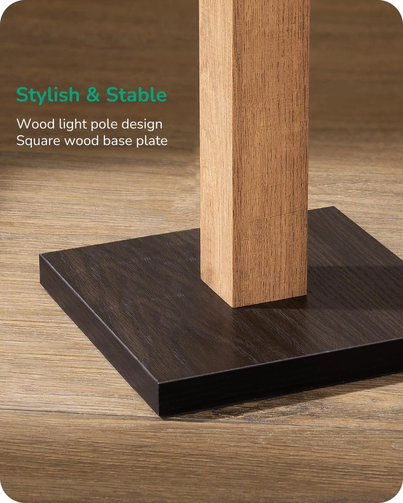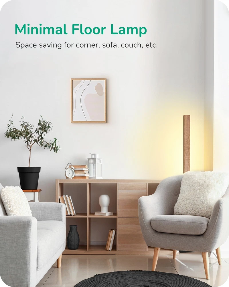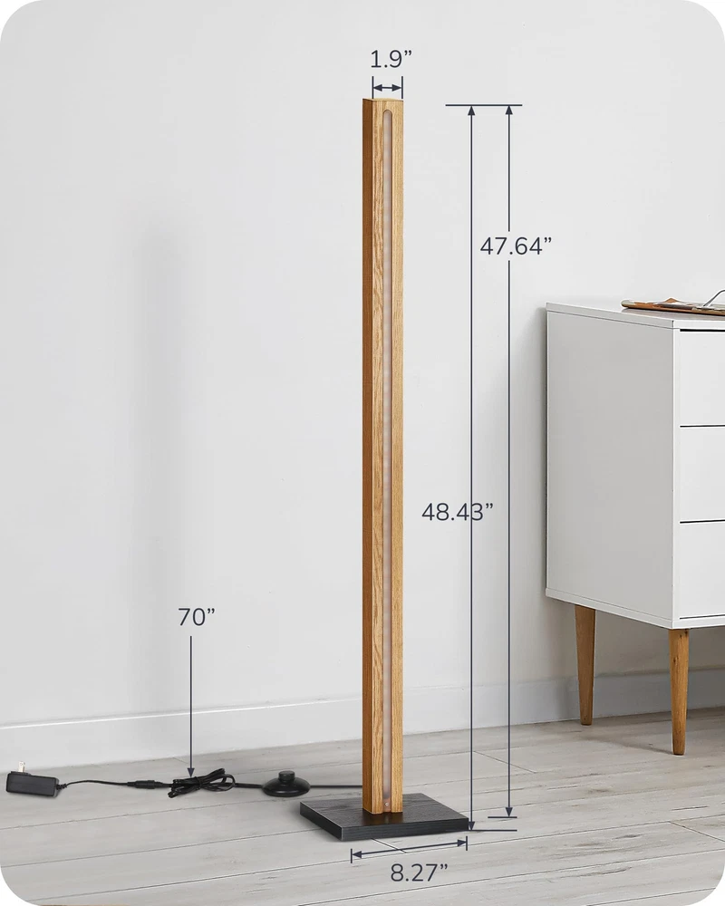 [Dimmable & 7 CCT Adjustable] Adjust the brightness from 10-100% to provide comfortable light, allowing you to customize the lighting according to life or work needs; 7 color temperature from 2700 to 6000K to switch the lighting from warm, white to cool light; creating glamourous ambiances for your family [Wood Slim Tall Lamp] Wood grain color pole and base, creates a natural touch and decor your rooms perfectly. The simple design corner lamp is space-saving. Just put this standing lamp beside a corner or a couch, showing a refined and modern interior design [RF-433 Remote Control] The minimal floor lamp can be controlled smoothly by RF-433 remote control within 49ft, to select 7 color temperatures and 7 brightness levels; one click to enter night light mode of brightness 30%, and the memory function can save your last setting [Easy to Assemble & Stable] Takes only 3 minutes to screw column lamp onto base then connect adapters and spin lock; made of solid wood, the square compact base plate keeps the bedside lamp sturdily in place and wobble free, prevents it from tipping over when you move it or have an accident [Long Lasting and Safety] Never replace a bulb and energy saving, the LED floor lamp features over 30,000 hours long life, will never overheat and stays cool to avoid burning yourself when moving it; ensuring both safety and convenience in your home