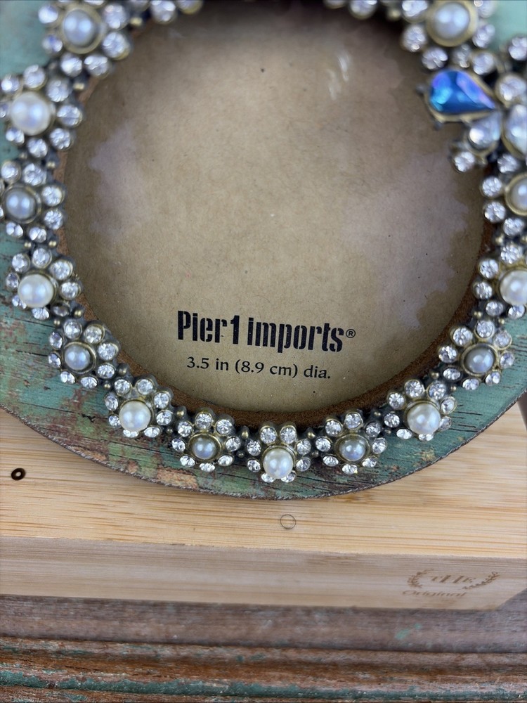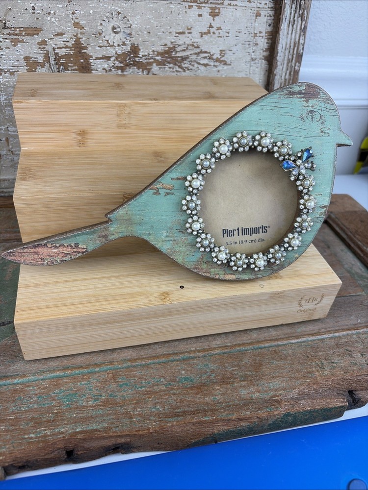 Wood Pier 1 Imports Green Distressed Bird Photo Frame 3.5" Rhinestone & Pearls Nice condition. Stands about 6” tall. Fits a 3.5” picture. Round window.