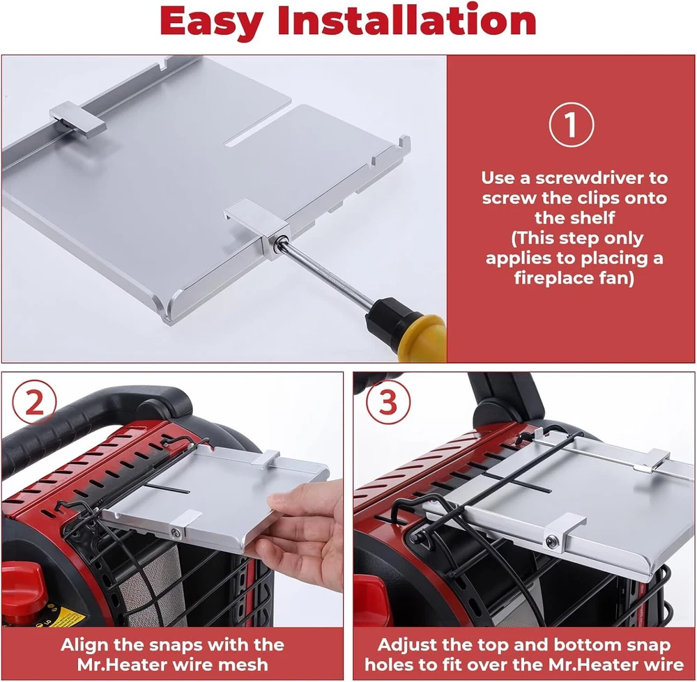 【Bracket for Mr.Heater 】Our brackets are specifically designed for use with Mr heater. Available for little or big Mr.Heater Buddy 9B/12B/18B 【Multi-functional Holder】The Mr.Heater bracket can not only be used to hold the fireplace fan, but it can also heat water and food for you. It will provide you with warmth and convenience whether you are on your patio or outdoors. Elevating the Heat】Our heater supports are made from aluminum for a wider heat surface. Uniform and Wide Heating Surfacemakes the Heat Fan More Efficient and Last Longer. Whether you are heating water, or food, it will be more efficient and save you time! 【With Fixed Clip】Our bracket design comes with two securing clips. Easy to install, when you need to use the fireplace fan on your Mr.Heater, just screw it onto the bracket with a driver and snap the fan base into the snaps, you can use it without worrying about dropping it due to accidentally touching the fan. 【Easy to Carry】Our heater divider size is 4.72*4.72inch, lightweight and easy to carry, saving you more space and making your outdoor trip lighter and easier. If you have any problems please let us know, the after-sales team will provide solutions within 24 hours. Product Description Wood Stove Fan Bracket for Mr Heater Buddy 1 For heating water 2 For heating food 3 For stove fan