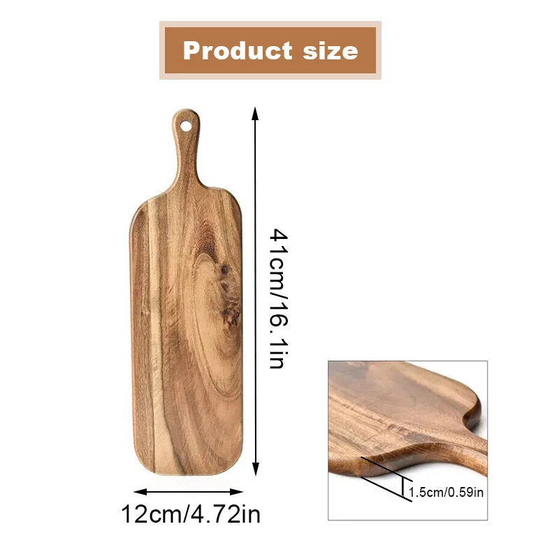 Specifications: Product Name: Wooden Chopping Board Material: Acacia Color: Wood Color Size: 41x12x1.5cm, 38x19x1.5cm Features: • Traditional Wood Material: Crafted from high-quality wood, this cutting board offers a natural and rustic touch to your kitchen decor. • Versatile Use: Suitable for serving cheese, charcuterie, bread, fruits, and more. It's an essential tool in every kitchen. • Rectangular Shape: Its rectangular shape provides ample space for serving various dishes, enhancing your dining experience. • Ergonomic Handle :Equipped with a comfortable handle, this cutting board is easy to hold and maneuver, ensuring a safe and efficient cutting process. • Easy to Clean: The wooden material makes this cutting board easy to clean and maintain, offering convenience and hygiene in your kitchen. Package include: 1 Pcs Wooden Chopping Board Notes: Due to display differences and lighting effects, the actual color of the product may be slightly different from the color shown on the picture. Thanks! Due to manual measurement, please allow a measurement tolerance of 1-2cm. On Dec 24, 2024 at 21:21:25 PST, seller added the following information:
