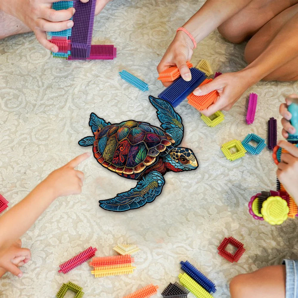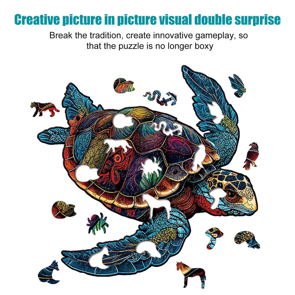 Wood Turtle Puzzle Sea Turtle Wooden Jigsaw Puzzles for Adults successful Bullet Points: Turtle Design: Our Turtle Puzzle takes shape in a new way with its special wooden pieces carved to form a beautifully irregular and three-dimensional turtle design. This unique puzzle stimulates cognitive growth while providing more entertainment for puzzle lovers of all ages. Natural Material: Crafted from high-quality material, this turtle puzzle is stable and sturdy, ensuring safe play for children and it has great durability. Hand-Eye Coordination: Promote language development and cognitive ability as children learn to classify and assemble, know the appearance and name of animals, and stimulate imagination and hand-eye coordination. Attract Attention: Turtle Puzzle is a masterpiece crafted with fine handmade pieces, showcasing superb workmanship and meticulously detailed connection design. Its exquisite packaging makes it the perfect present for anyone seeking artistic excellence. Ideal Present: Ideal for family or friends' birthday, this puzzle is a delightful challenge that enhances problem-solving skills, making it a great present for Children's Day. Our Turtle Puzzles for Adults are creatively designed in an adorable turtle shape with stable pieces and fine workmanship. These puzzles stimulate imagination and hand-eye coordination. Specification: Product Name: Turtle Puzzle Animal Classification: Turtle Category: 3D Puzzle Product Material: Wooden L ≈A3 size:28.5*28.5cm(11.4in*11.4in) puzzle pieces:128 Product List: 1 Set * Turtle Puzzle Notes: Due to different lighting and screen settings, the product color may be slightly different from the picture. Due to the difference in manual measurement, please allow a 1-3cm difference in size. On Feb 11, 2025 at 01:29:52 PST, seller added the following information:
