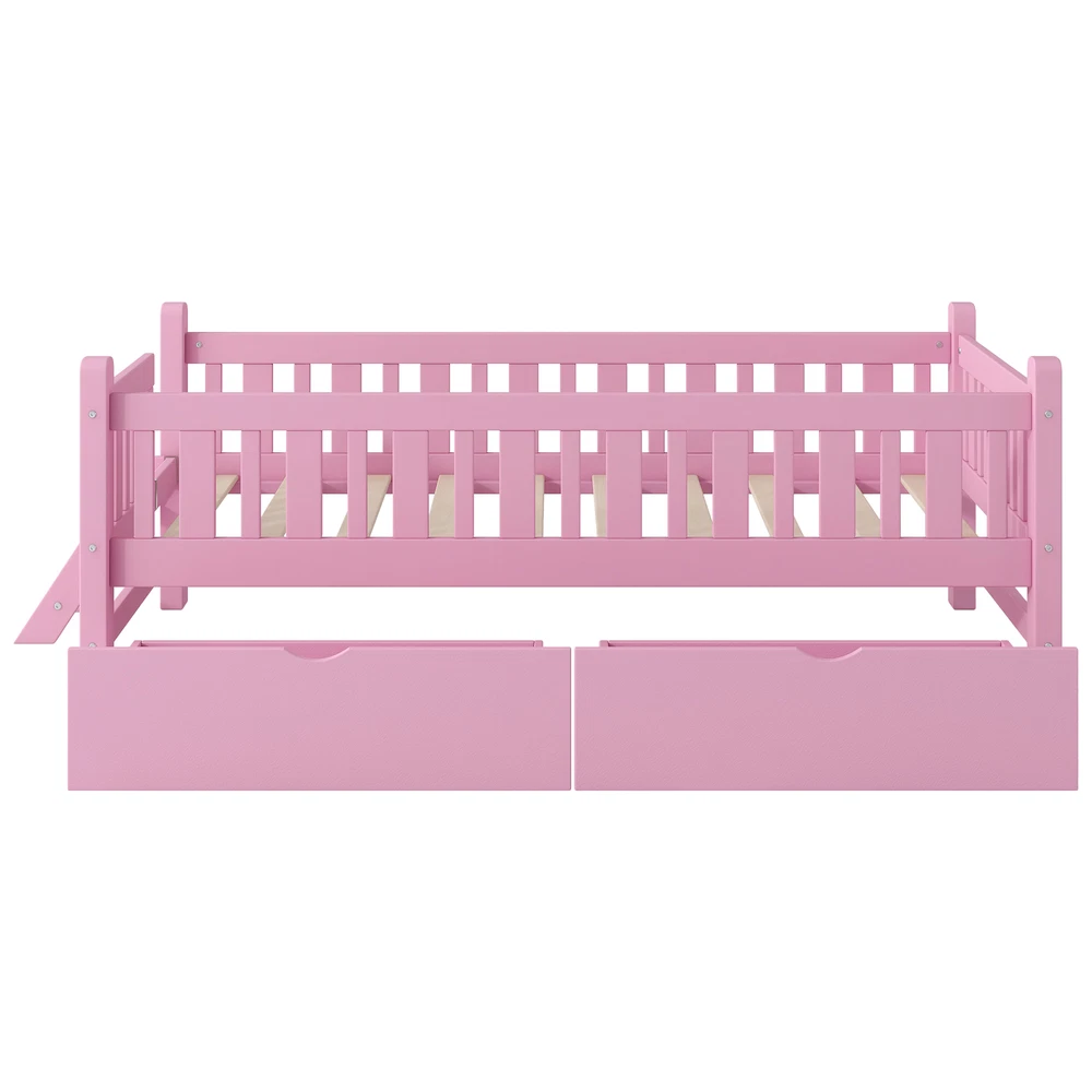Wood Twin Size Platform Bed Frame with Guardrail 2 Drawers For Kids Girls Pink Features [Semi-enclosed fence] The bed is surrounded by fences, but there is a small opening on the side of the fence, so it is not a completely enclosed space. Children can enter and exit freely through this small opening. [No Box Spring Required] The bed is close to the ground and increase the service life. [Sturdy Construction] Constructed of solid pine wood+MDF, this platform bed features a sturdy high quality solid wood construction for durability and high load capacity, ensuring longevity. [Easy to Assemble] All parts included in your package are indicated clearly. With step-by-step installation manual and per-drilled holes, you can easily assemble this bed individually. [Multiple Storage] Comes with 2 drawers, this platform bed is great for storing your clothes, toys or books. Descriptions Wood Twin Size Platform Bed with Guardrail and 2 Drawers, Pink This bed provides your child with an enclosed play area, perfect for exploring their imagination.The design of the guardrail provides safe guarantee.Constructed of solid pine wood+MDF, this platform bed features a sturdy high quality solid wood construction for durability and high load capacity, ensuring longevity. This daybed comes with 2 Drawers, easy to pull out, and a multi-functional piece of furniture ideal for small living spaces. Description Material Pine Wood+MDF Size Twin Color Pink Numbers of Package 1 Spring Box No need Assembly Required Yes Origin Vietnam Dimensions Overall Product Dimension 77.6''L x 41.6''W x 28''H Twin Bed 75.6'' x 39.3'' Total Height 28'' Recommend Mattress Thickness of Bed 6-8'' Overall Product Weight 84.4lbs Weight Capacity 400lbs