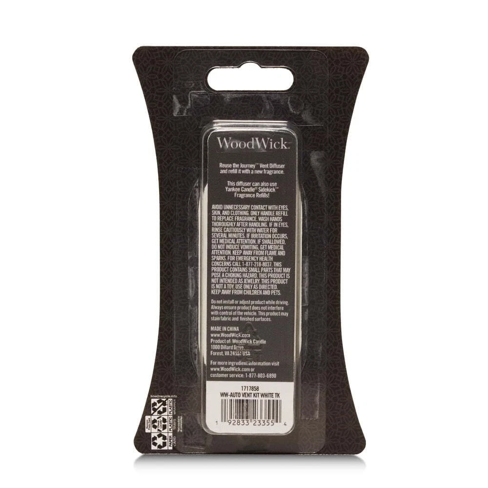 Introducing WoodWick Journey refillable diffuser options that kick up the style in your car. Collection has modern, premium designs and finishes you'll be eager to display. Each refill provides 30 days of welcoming fragrance. Our interchangeable fragrance refills are easy to change and fit into YC Sidekick Collection as well. This scent is for White Teak. Aromas of crisp balsam branches mixed with sandalwood and oak, with hints of tree moss and cedarwood. Refillable diffuser options that kick up the style in your car. Modern, premium designs and finishes you'll be eager to display. Sleek, Elegant, and Compact design Each refill provides 30 days of welcoming fragrance Very easy to use and ensures your car smells good White Teak Scented: crisp balsam branches mixed with sandalwood and oak, with hints of tree moss and cedarwood. Car air vent clip freshener