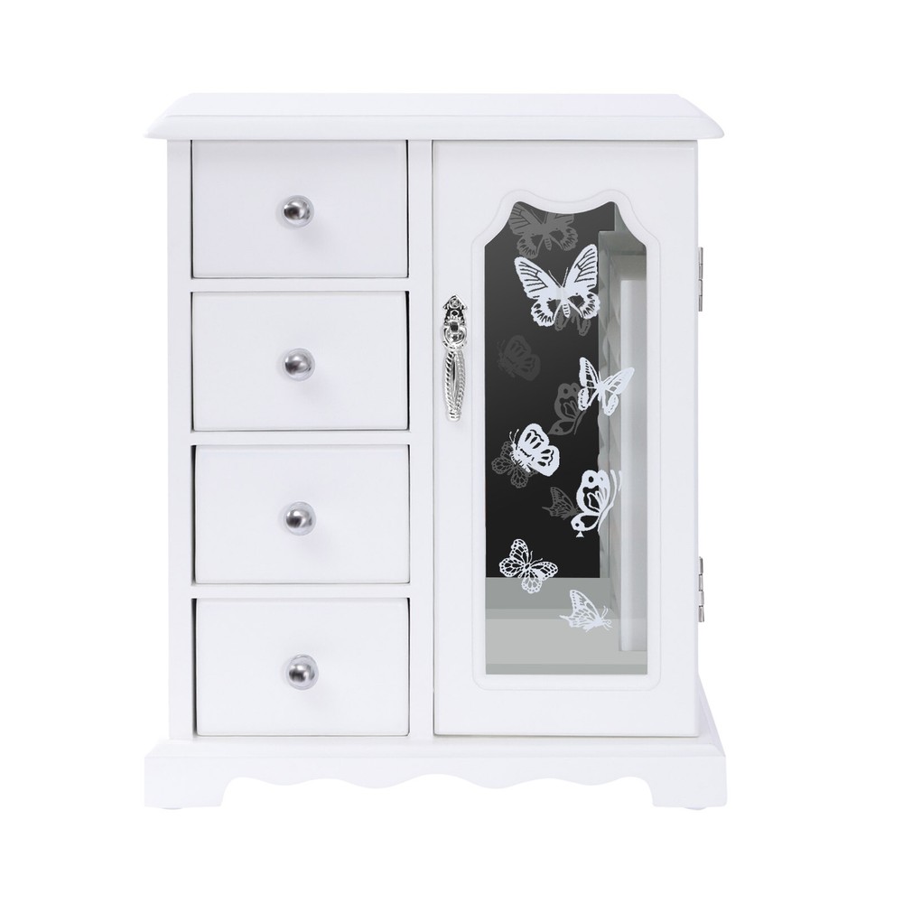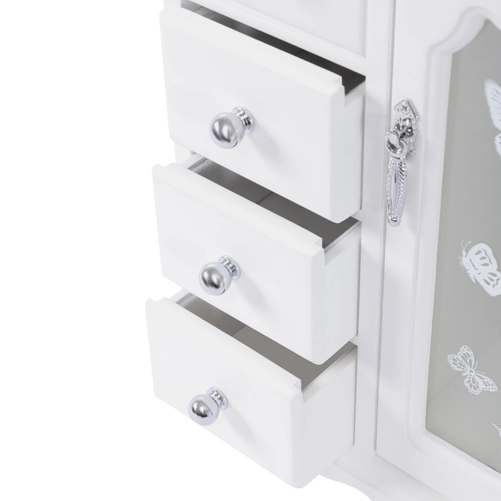 Specification Style: Simple, Modern Material: MDF, Glass Color: White Process: Odorless Paint Number of Drawers: 4 Product Size: 23*13*28.5cm/9*5*11.2in Package Size: 29*18*34cm/11.42*7.09*13.38in Net Weight: 2kg/4.41lbs Gross Weight: 2.4kg/5.29lbs Package Included 1* Jewelry Box Wooden 4 Drawers Jewelry Box W/ Mirror Storage Organizer Drawers White For Women Description ๐Ÿ•Description This Jewelry Box Will Keep Your Dresser Organized and save Time Searching for Jewelry. with Its Creative Design and Beautiful Butterfly Pattern, It Will Add a Touch of Character to Your Home. ๐Ÿ• Specification Style: Simple, Modern Material: Mdf, Glass Color: White Process: Odorless Paint Number of Drawers: 4 Product Size: 23*13*28.5cm/9*5*11.2in Package Size: 29*18*34cm/11.42*7.09*13.38in Net Weight: 2kg/4.41lbs Gross Weight: 2.4kg/5.29lbs ๐Ÿ• Package Included 1* Jewelry Box ๐Ÿ• Key Features Excellent Material: This Jewelry Box Is Made of High-quality Mdf, Which Is Natural, Renewable, Anti-wear, Rust-resistant, and Has a Long Service Life. Beautiful Appearance: the Creative Look, Butterfly Pattern, Double Door Design, and Whitecolor of the Jewelry Box Make It Beautiful and Suitable in Any Setting. Dust-proof and Highly Transparent Glass: This Jewelry Box Has Highly Transparent Glass. the Glass Is Not Only Dust-proof but Also Provides an Unobstructed View of the Interior Which Can Keep the Inside Clean and Help You Quickly Find the Jewelry You Want. 360ยฐ Rotatable Hook: This Jewelry Box Has a 360ยฐ Rotatable Hook, Which Can Be Freely Rotated for Easy Access to Necklaces and Bracelets. Large Capacity Storage: This Jewelry Box Has a Ring and Earring Area, a Hanging Area Behind the Door, and 4 Drawers. Earrings, Necklaces, Bracelets, Rings, Watches, Lipsticks, Etc. Can All Be Put into This One Organizer, Which Can Meet Your Various Needs and Make Your Dressing Table Tidier and Neater. Double Door Design: This Jewelry Box Is a Double Door Design, There Is a Large Opening, Which Is Easy for You to Take Earrings, Necklaces, Bracelets, and Rings. Sorted Storage: This Jewelry Box Has 4 Drawers That Allow You to Sort Your Items to Make Your Room Tidier and Easy to Find the Things You Need. Space Saving: with Its Footprint of 9*5in, This Jewelry Box Takes up a Small Area. Since It Makes Use of Vertical Space, Not Only Will It Not Waste Your Dressing Table, but It Will Also Provide You with More Storage Space. Built-in Mirror: This Jewelry Box Case Has a Built-in Mirror. You Only Need to Open the Box to Use It, Which Is Very Convenient for You to Wear Jewelry and Does Not Take up Much Space. Earrings and Rings Storage Area: This Storage Area Is Equipped with Soft Velvet to Protect the Jewelry from Wear and Tear Which Is Very Thoughtful. Wonderful Gift: Our Jewelry Box Is an Ideal Gift for Your Wife, Daughter, Girlfriend, or Make-up Lovers on Birthdays, Anniversaries, and Christmas, Because It Is Not Only Useful but Also a Great Decoration. Easy to Clean: Because of Its Smooth Surface, You Only Need to Wipe It with a Cloth, and Then It Will Shine like a Brand-new One. Customer Service: We Aim to Provide Quality Products and Services. If You Have Any Problems, Please Feel Free to Contact Us. We Will Reply and Solve the Problem for You As Soon As Possible. ๐Ÿ• Details Anti-slip Footbeds: This Jewelry Box Has Four Anti-slip Footbeds on the Bottom, Which Allows You to Keep It Stable While Using It for Your Convenience. 4 Drawers: the 4 Drawers of This Jewelry Box Not Only Provide More Storage Space but Also Protect Privacy. Silver Handles: Each Drawer Has a Silver Handle That Is Round and Smooth for Easy Access and Embellishes the Jewelry Box. Every Time You Open the Box Is a Ritual Enjoyment. Odorless Paint: This Jewelry Box Adopts Odorless Paint Which Is Odorless, Does Not Fade, and Has Bright Colors. Plating Hardware: the Plating Hardware of This Jewelry Box Will Not Fade or Rust Which Increases the Service Life. ๐Ÿ• Application It Is Suitable for the Bathroom, Bedroom, Dressing Table, and Make-up Store to Place Necklaces, Rings, Earrings, Bracelets, and Other Make-up Items, Making Your Dressing Table Neater and Tidier. ๐Ÿ• Notes Please Allow the Slight Color Difference Caused by the Shooting Light and 1-3 Cm Error Due to Manual Measurement, and Make Sure You Do Not Mind Before Ordering. Payment Delivery details Terms of sales About us Contact us Payment We accept ebay payment ใ€‚ Fees such as import duties, taxes are not included in the item price or shipping costs. These charges are the buyer's responsibility. Delivery details Shipping: 2-9 working days to: USA Terms of sales We maintain high standards of excellence and strive for hundred percent customer satisfaction. Feedback is very important to us. We hope that you contact us immediately before you give neutral or negative feedback, so that we can address your concerns. It is impossible to address issues if we do not know about them! About us Your satis faction is our ultimate goal. We work hard to earn your trust and future business. Our certified technicians have tested each item before shipping. The unit comes with 1 year limited warranty on all manufacturing defects. a) If you receive a defective item, you may return it or ask for a discount. Please contact us within 14 days after you receive the package. b) What you returned must be intact and in its original packaging as re? u. Customer is responsible for shipping costs of the returned item. c) We will cover the cost of shipping back t with the shipping rate indicated in the registration page. We will send you a new unit or refund the full payment you paid. Thank you. Contact us Business Hour Business Hour: Monday To Friday: 8:30 AM to 5:00 PM (Beijing China time) Due to time zones, our reply to your questions may not be immediately. But within above working time, we will reply your email within 24 hours. If it's non-workdays, please kindly be 