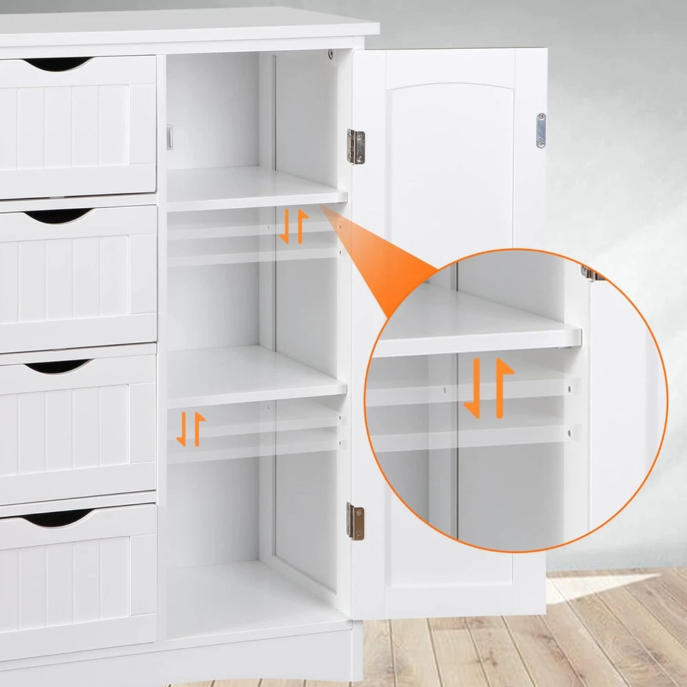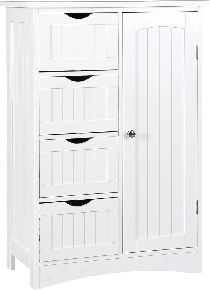Stable structure: This wooden bathroom storage cabinet is made of high-quality MDF boards, which are not only sturdy and durable, but also fashionable and environmentally friendly.Waterproof coating for wet environments, suitable for extended use 4 Drawers and 1 Cupboard: This bathroom storage cabinet with 4 drawers and 1 cupboard can be classified and stored according to the type of item. The 4 drawers are suitable for small-sized items,The interior shelves of the cabinet have 3 adjustable heights to accommodate a wide range of product sizes; It makes organizing more convenient Easy installation and cleaning: Due to the bathroom organizers and storage cabinet's simple appearance and structure, it does not require a lot of time to install and is equally conservative to clean Modern style suitable for anywhere: This bathroom storage cabinet is designed modern, simple and elegant, suitable for any room. You can place it anywhere you want, bedroom, living room, study, etc Multifunctional use: For freestanding storage, its uses are very extensive; It can be used to place books, clothing, towels, and various things such as CDs, it can effectively avoid the stacking of room debris Product Description This white storage cabinet has a simple, elegant, and fashionable design, which can help you make good use of your home space, saving space. It is a modern style suitable for any place, adding a warm beauty to your home. Features: -- Large storage space -- Stable and safe construction -- Fashionable and easy to install -- Keep the family tidy and organized -- It is not just a piece of furniture, but also plays an important role in decorating a home Specifications: -- Color: White -- Shape: Rectangular -- Material : MDF -- Freestanding Cabinets Dimensions: 21.9"D ×11.8"W×32.2"H -- Net Weight: 15.7kg/34.6LB Package Content: -- Freestanding Storage Cabinet×1 -- Instruction×1