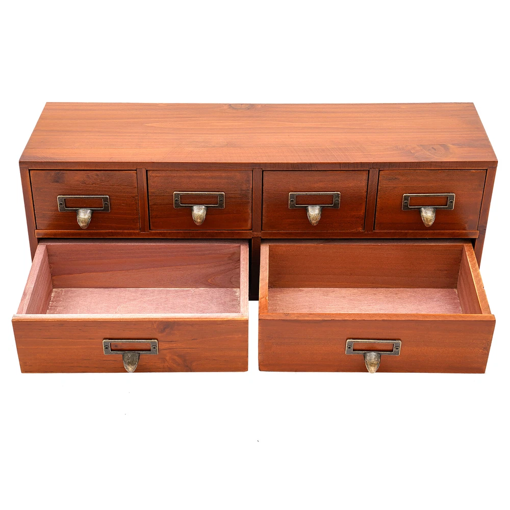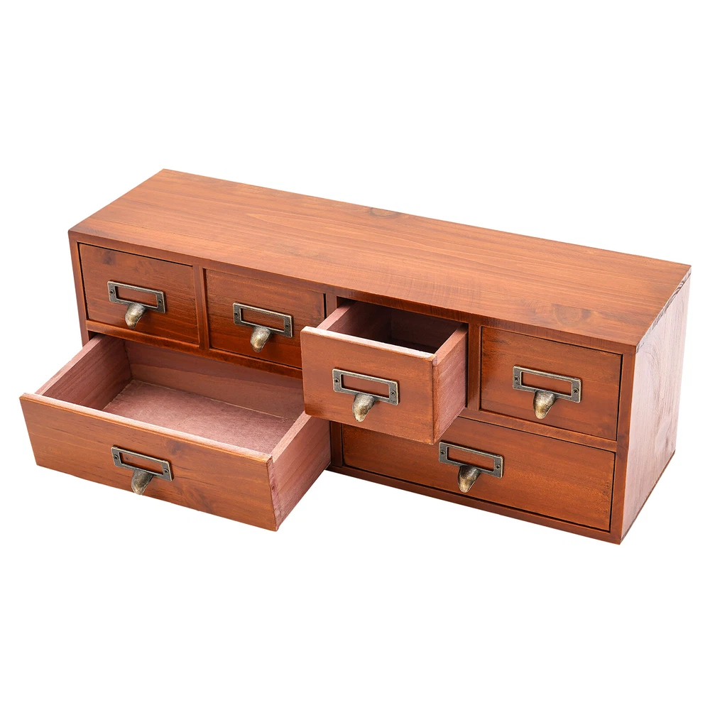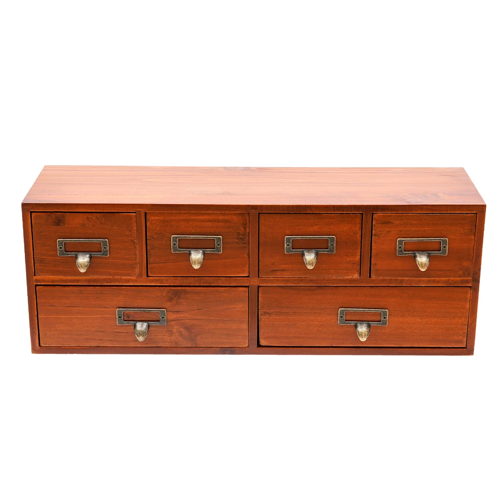 Package Included 1 * 6-Drawer Storage Cabinet Application This product can be used to store herbs, library cards, business cards, pharmaceuticals, tea, essential oils, pins, thumbnails, beads, cards, pictures, pens, office supplies, letters, mail, stamps, scissors, bills, stationery, cosmetics, jewelry, hair accessories, sewing supplies, handicrafts, and other items. It can be used in living rooms, bedrooms, study rooms, kitchens, dressing rooms, changing rooms, offices, libraries, front desks, and other places. Specification Material: Pine Wood, Multi-Layer Board, Iron Process: Painting Color: Brown Style: Retro Shape: Rectangular Assembly Required: No Number of Drawers: 6 Plate Thickness: Approx. 70-100mm/0.28-0.39in Each Large Drawer Size: 21*6.5cm/8.3*2.6in 6 Drawers Desktop Dresser Wooden Storage Dressers Chests of Drawers for Bedroom Description Check out our stylish 6-drawer storage cabinet, which combines charm with practicality. It features 4 small drawers and 2 large drawers, making it ideal for keeping your workspace neatly organized. The retro brown finish gives it an antique allure that reflects your exquisite sense of style. Key Features Good Material: This product is made of high-quality pine wood, multi-layer boards, and iron. After painting, it can maintain a beautiful shape and color, allowing you to use it for a long time. Suitable Size: The overall size of 19.3*5.5*6.9 inches allows you to place it on a table or other countertop to help store various items. The flat space above it can be used to place items such as photo frames and decorations, providing you with sufficient storage space. Neat Storage : The design of 4 small drawers and 2 large drawers allows you to organize different items in a more organized manner, making your desk or room cleaner. Stable & Sturdy : The 0.28-0.39 inch thick boards (excluding the back panel) and sturdy nails ensure that this product remains stable even when loaded with a large number of items, allowing you to use it with confidence. Improve Space Utilization: The vertical design transforms the storage space of the desktop into three dimensions, creating more storage space and allowing you to maximize space utilization. Safe to Use: This product uses water-based environmentally friendly paint, which will not release harmful substances. You can place it safely at home and enjoy a healthy living environment. Retro Style: The simple brown and brass colors make this product look very antique, and the simple straight shape adds a sense of fashion to the product. Whether it is a modern or retro decoration style, this product can adapt well. Easy to Find: Without buckles, its drawers can be fully pulled out, making it more flexible to use and easier to find the items you need. Details Label Slots: The metal frames on the handles can be used to hold the labels, allowing you to find the item you need faster. Practical Handles: They allow you to easily open or close drawers, and the curved structure provides better care for your hands. Application This product can be used to store herbs, library cards, business cards, pharmaceuticals, tea, essential oils, pins, thumbnails, beads, cards, pictures, pens, office supplies, letters, mail, stamps, scissors, bills, stationery, cosmetics, jewelry, hair accessories, sewing supplies, handicrafts, and other items. It can be used in living rooms, bedrooms, study rooms, kitchens, dressing rooms, changing rooms, offices, libraries, front desks, and other places. Specification Material: Pine Wood, Multi-Layer Board, Iron Process: Painting Color: Brown Style: Retro Shape: Rectangular Assembly Required: No Number of Drawers: 6 Plate Thickness: Approx. 70-100mm/0.28-0.39in Each Large Drawer Size: 21*6.5cm/8.3*2.6in Each Small Drawer Size: 9.5*6.5cm/3.7*2.6in Product Size: 49*14*17.5cm/19.3*5.5*6.9in Package Size: 49*14*17.5cm/ 19.3*5.5*6.9 in Gross Weight: 2.4kg/5.29lbs Net Weight: 2kg/4.41lbs Package Included 1 * 6-Drawer Storage Cabinet Notes The product uses pine wood, and there may be some flaws in the patterns on it, which is a normal phenomenon. This product is handmade and may have slight scratches and nail holes, please make sure you don’t care before purchasing. Please allow the slight color difference caused by the shooting light and 1-3cm error due to manual measurement, and make sure you do not mind before ordering. Payment Delivery details Terms of sales About us Contact us Payment We accept ebay payment 。 Fees such as import duties, taxes are not included in the item price or shipping costs. These charges are the buyer's responsibility. Delivery details Shipping: 2-9 working days to: USA Terms of sales We maintain high standards of excellence and strive for hundred percent customer satisfaction. Feedback is very important to us. We hope that you contact us immediately before you give neutral or negative feedback, so that we can address your concerns. It is impossible to address issues if we do not know about them! About us Your satis faction is our ultimate goal. We work hard to earn your trust and future business. Our certified technicians have tested each item before shipping. The unit comes with 1 year limited warranty on all manufacturing defects. a) If you receive a defective item, you may return it or ask for a discount. Please contact us within 14 days after you receive the package. b) What you returned must be intact and in its original packaging as re? u. Customer is responsible for shipping costs of the returned item. c) We will cover the cost of shipping back t with the shipping rate indicated in the registration page. We will send you a new unit or refund the full payment you paid. Thank you. Contact us Business Hour Business Hour: Monday To Friday: 8:30 AM to 5:00 PM (Beijing China time) Due to time zones, our reply to your questions may not be immediately. But within above working time, we will reply your email within 24 hours. If it's non-workdays, please kindly be patient and w