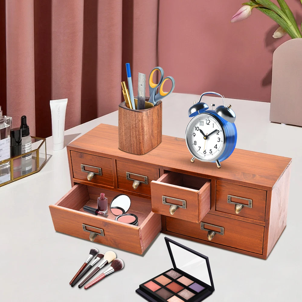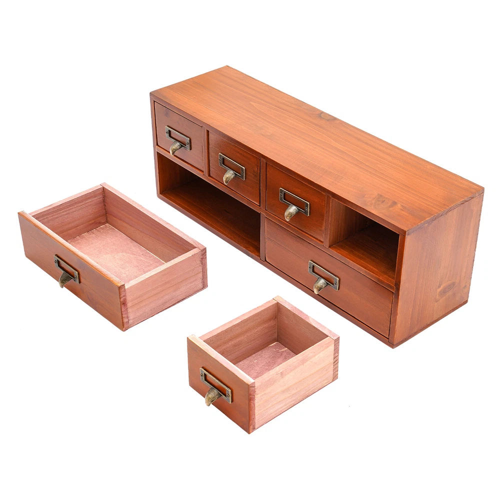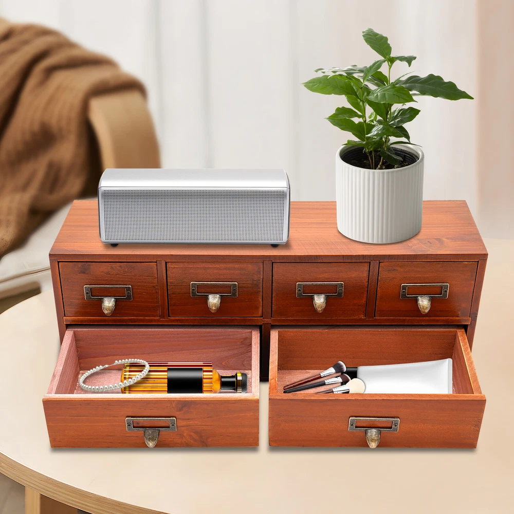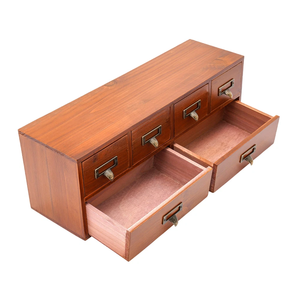 Package Included 1 * 6-Drawer Storage Cabinet Application This product can be used to store herbs, library cards, business cards, pharmaceuticals, tea, essential oils, pins, thumbnails, beads, cards, pictures, pens, office supplies, letters, mail, stamps, scissors, bills, stationery, cosmetics, jewelry, hair accessories, sewing supplies, handicrafts, and other items. It can be used in living rooms, bedrooms, study rooms, kitchens, dressing rooms, changing rooms, offices, libraries, front desks, and other places. Specification Material: Pine Wood, Multi-Layer Board, Iron Process: Painting Color: Brown Style: Retro Shape: Rectangular Assembly Required: No Number of Drawers: 6 Plate Thickness: Approx. 70-100mm/0.28-0.39in Each Large Drawer Size: 21*6.5cm/8.3*2.6in 6 Drawers Desktop Dresser Wooden Storage Dressers Chests of Drawers for Bedroom Description Check out our stylish 6-drawer storage cabinet, which combines charm with practicality. It features 4 small drawers and 2 large drawers, making it ideal for keeping your workspace neatly organized. The retro brown finish gives it an antique allure that reflects your exquisite sense of style. Key Features Good Material: This product is made of high-quality pine wood, multi-layer boards, and iron. After painting, it can maintain a beautiful shape and color, allowing you to use it for a long time. Suitable Size: The overall size of 19.3*5.5*6.9 inches allows you to place it on a table or other countertop to help store various items. The flat space above it can be used to place items such as photo frames and decorations, providing you with sufficient storage space. Neat Storage : The design of 4 small drawers and 2 large drawers allows you to organize different items in a more organized manner, making your desk or room cleaner. Stable & Sturdy : The 0.28-0.39 inch thick boards (excluding the back panel) and sturdy nails ensure that this product remains stable even when loaded with a large number of items, allowing you to use it with confidence. Improve Space Utilization: The vertical design transforms the storage space of the desktop into three dimensions, creating more storage space and allowing you to maximize space utilization. Safe to Use: This product uses water-based environmentally friendly paint, which will not release harmful substances. You can place it safely at home and enjoy a healthy living environment. Retro Style: The simple brown and brass colors make this product look very antique, and the simple straight shape adds a sense of fashion to the product. Whether it is a modern or retro decoration style, this product can adapt well. Easy to Find: Without buckles, its drawers can be fully pulled out, making it more flexible to use and easier to find the items you need. Details Label Slots: The metal frames on the handles can be used to hold the labels, allowing you to find the item you need faster. Practical Handles: They allow you to easily open or close drawers, and the curved structure provides better care for your hands. Application This product can be used to store herbs, library cards, business cards, pharmaceuticals, tea, essential oils, pins, thumbnails, beads, cards, pictures, pens, office supplies, letters, mail, stamps, scissors, bills, stationery, cosmetics, jewelry, hair accessories, sewing supplies, handicrafts, and other items. It can be used in living rooms, bedrooms, study rooms, kitchens, dressing rooms, changing rooms, offices, libraries, front desks, and other places. Specification Material: Pine Wood, Multi-Layer Board, Iron Process: Painting Color: Brown Style: Retro Shape: Rectangular Assembly Required: No Number of Drawers: 6 Plate Thickness: Approx. 70-100mm/0.28-0.39in Each Large Drawer Size: 21*6.5cm/8.3*2.6in Each Small Drawer Size: 9.5*6.5cm/3.7*2.6in Product Size: 49*14*17.5cm/19.3*5.5*6.9in Package Size: 49*14*17.5cm/ 19.3*5.5*6.9 in Gross Weight: 2.4kg/5.29lbs Net Weight: 2kg/4.41lbs Package Included 1 * 6-Drawer Storage Cabinet Notes The product uses pine wood, and there may be some flaws in the patterns on it, which is a normal phenomenon. This product is handmade and may have slight scratches and nail holes, please make sure you don’t care before purchasing. Please allow the slight color difference caused by the shooting light and 1-3cm error due to manual measurement, and make sure you do not mind before ordering. Payment Delivery details Terms of sales About us Contact us Payment We accept ebay payment 。 Fees such as import duties, taxes are not included in the item price or shipping costs. These charges are the buyer's responsibility. Delivery details Shipping: 2-9 working days to: USA Terms of sales We maintain high standards of excellence and strive for hundred percent customer satisfaction. Feedback is very important to us. We hope that you contact us immediately before you give neutral or negative feedback, so that we can address your concerns. It is impossible to address issues if we do not know about them! About us Your satis faction is our ultimate goal. We work hard to earn your trust and future business. Our certified technicians have tested each item before shipping. The unit comes with 1 year limited warranty on all manufacturing defects. a) If you receive a defective item, you may return it or ask for a discount. Please contact us within 14 days after you receive the package. b) What you returned must be intact and in its original packaging as re? u. Customer is responsible for shipping costs of the returned item. c) We will cover the cost of shipping back t with the shipping rate indicated in the registration page. We will send you a new unit or refund the full payment you paid. Thank you. Contact us Business Hour Business Hour: Monday To Friday: 8:30 AM to 5:00 PM (Beijing China time) Due to time zones, our reply to your questions may not be immediately. But within above working time, we will reply your email within 24 hours. If it's non-workdays, please kindly be patient and w