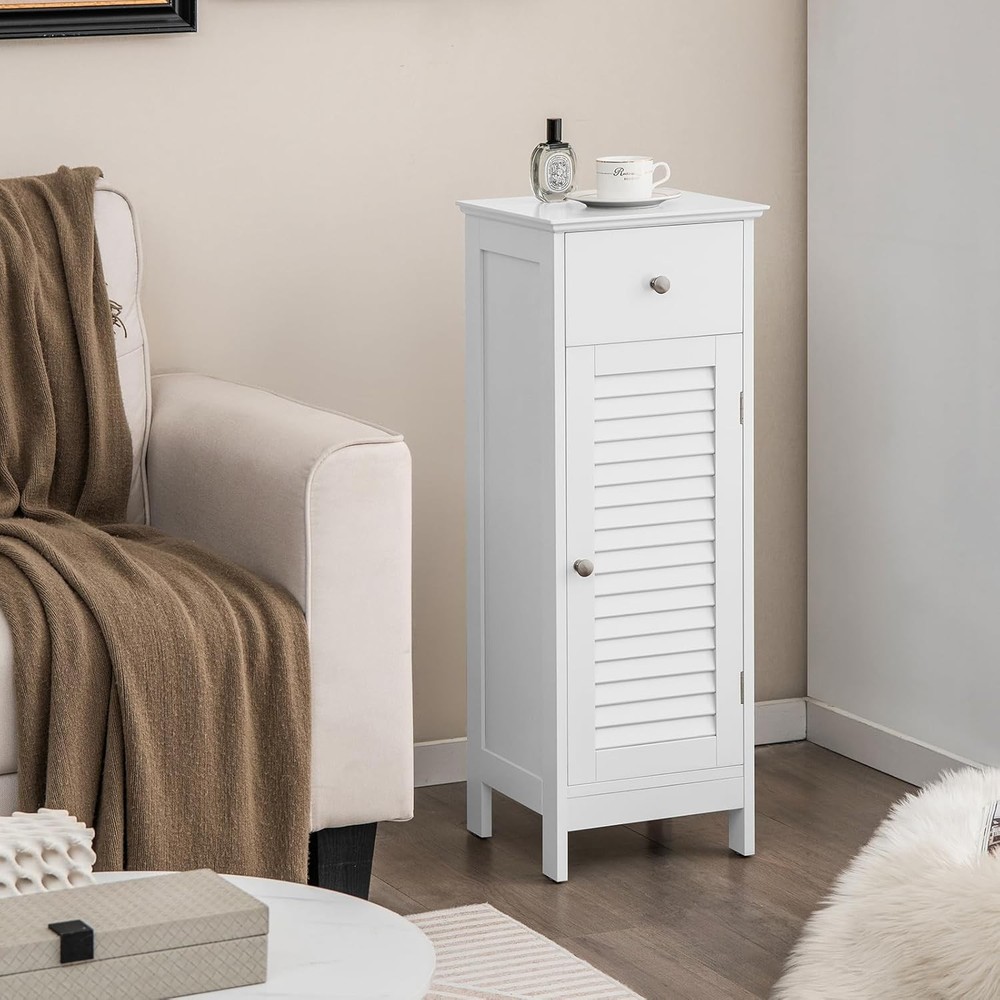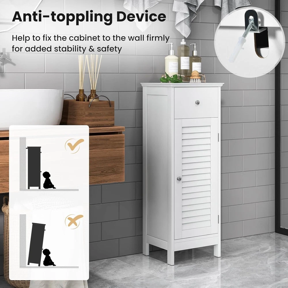 Bathroom Floor Cabinet, Wooden Side Storage Cabinet with Single Shutter Door and Inner Adjustable Shelf, Equipped with Anti-toppling Fitting, 13 x 12 x 34.5 inches (White) Product Description About this item 【Inner Adjustable Shelf】 The inner shelf could be adjusted in three positions, allowing you to freely set a suitable height according to your needs. This feature make this floor cabinet suitable for a lots of occasions. Definitely a great addition to bathroom, living room, kitchen and so on. 【Exquisite Lacquered Surface】 Adopting selected painting, the surface of the floor cabinet is rather smooth and water-proof, making it suitable for bathroom use or other humid environment. 【Anti-toppling Fitting Included】 We have prepared a set of anti-toppling fitting for this cabinet for added safety. It can be securely fixed to the wall to have around pets or kids. 【Easy to Assemble and Maintain】With the enclosed step by step instruction and necessary hardware, it is easy for you to have the bathroom floor cabinet installed in no time. Thanks to its smooth lacquered surface, it is convenient to clean and remove stains. 【 Promise】We proudly stand behind all of our products. If for any reason you are not satisfied with our floor cabinet, please contact us for solution and we are committed to making things right for you. We will respond within 24 hrs by offering feasible suggestion until problem is solved. Description Sicked of staying in a disordered room? Our exquisite and practical bathroom floor cabinet would be one of the rightest choice for you to start to own a tidy and clean room. Constructed of superior wood, together coated with selected painting material, this bathroom storage cabinet can withstand the humidity, especially suitable for bathroom or toilet use. With its chic and elegant appearance, it can also be used as a side cabinet to whether place it in the living room nor kitchen, adding a touch of elegance without any doubt! In addition, it is easy for you to clean it with a damp cloth due to the smooth lacquered surface. Just bring this storage cabinet home now! You won’t be regretted! Feature Minimalist yet practical design, matching most home decor Ample storage space, ideal for storing bath essentials, first aid kit, soaps, etc. Constructed of superior P2 MDF, assuring durability, stability, great load-bearing capacity Adjustable inner shelf for flexibility, storing things of different heights freely Shutter door design for extra air circulation to better store your belongings Lacquered surface designed to withstand the humidity, making it suitable for bathrooms Ideal for bathroom, living room, kitchen, entryway, hotel, inns Easy to assemble with detailed instruction and enclosed hardware set Specification Color: White Material: P2 MDF Overall dimension:13" x 12" x 34.5" (L x W x H) Feet height: 3" Drawer dimension: 10" x 6" (L x W) Net weight: 20 lbs Top board weight capacity: 20 lbs Shelf maximum weight capacity: 7 lbs Drawer weight capacity: 5 lbs Package includes: 1 x Bathroom floor cabinet