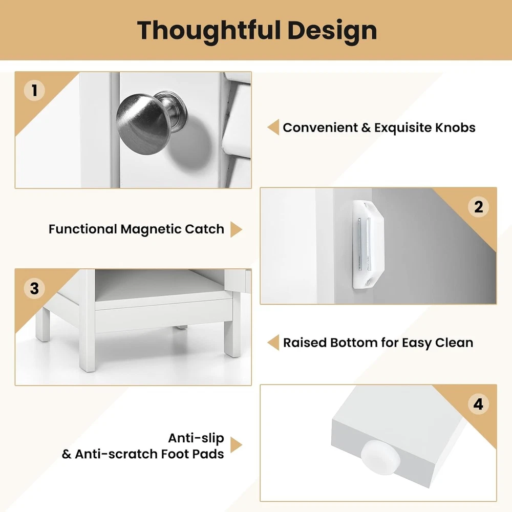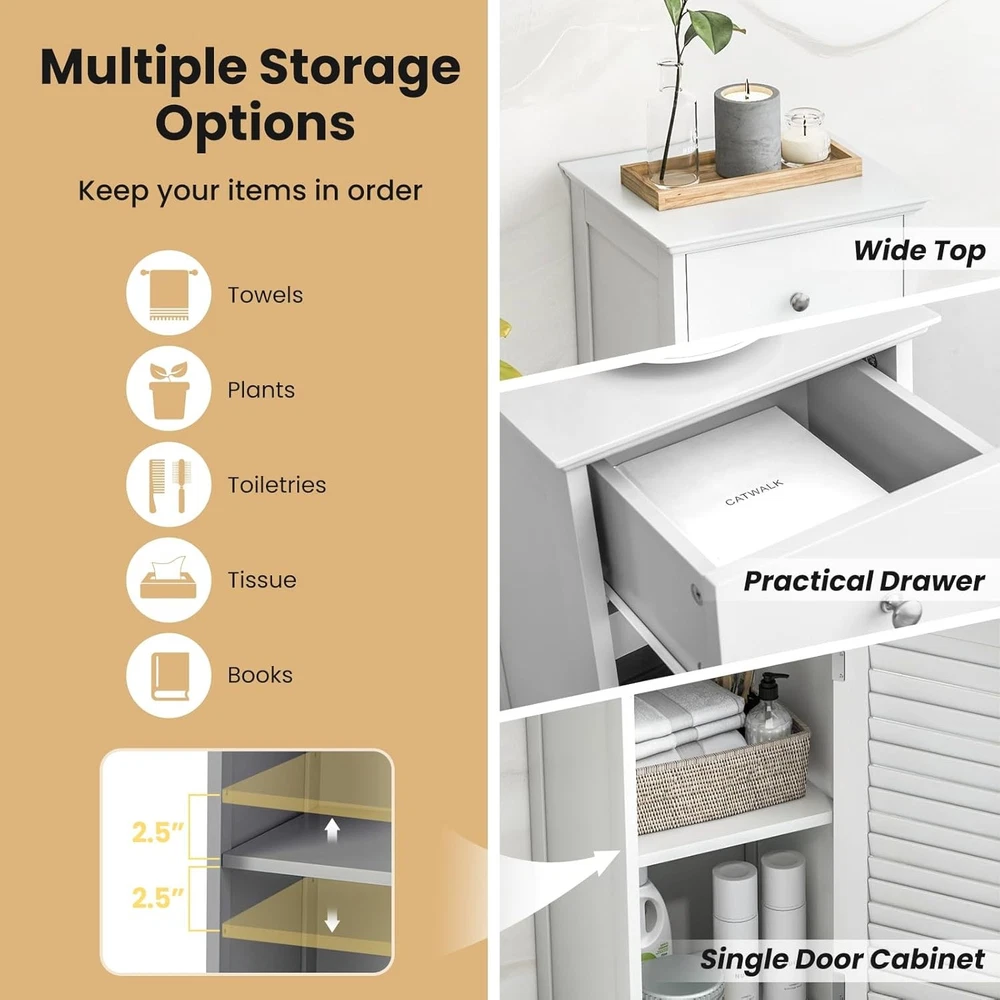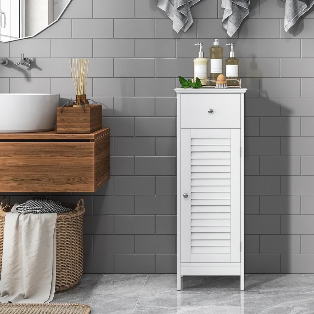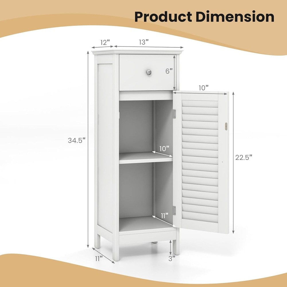 Product Description Description Sicked of staying in a disordered room? Our exquisite and practical bathroom floor cabinet would be one of the rightest choice for you to start to own a tidy and clean room. Constructed of superior wood, together coated with selected painting material, this bathroom storage cabinet can withstand the humidity, especially suitable for bathroom or toilet use. With its chic and elegant appearance, it can also be used as a side cabinet to whether place it in the living room nor kitchen, adding a touch of elegance without any doubt! In addition, it is easy for you to clean it with a damp cloth due to the smooth lacquered surface. Just bring this storage cabinet home now! You won’t be regretted! Feature Minimalist yet practical design, matching most home decor Ample storage space, ideal for storing bath essentials, first aid kit, soaps, etc. Constructed of superior P2 MDF, assuring durability, stability, great load-bearing capacity Adjustable inner shelf for flexibility, storing things of different heights freely Shutter door design for extra air circulation to better store your belongings Lacquered surface designed to withstand the humidity, making it suitable for bathrooms Ideal for bathroom, living room, kitchen, entryway, hotel, inns Easy to assemble with detailed instruction and enclosed hardware set Specification Color: White Material: P2 MDF Overall dimension:13" x 12" x 34.5" (L x W x H) Feet height: 3" Drawer dimension: 10" x 6" (L x W) Net weight: 20 lbs Top board weight capacity: 20 lbs Shelf maximum weight capacity: 7 lbs Drawer weight capacity: 5 lbs Package includes: 1 x Bathroom floor cabinet On Aug 14, 2025 at 20:07:43 PDT, seller added the following information: