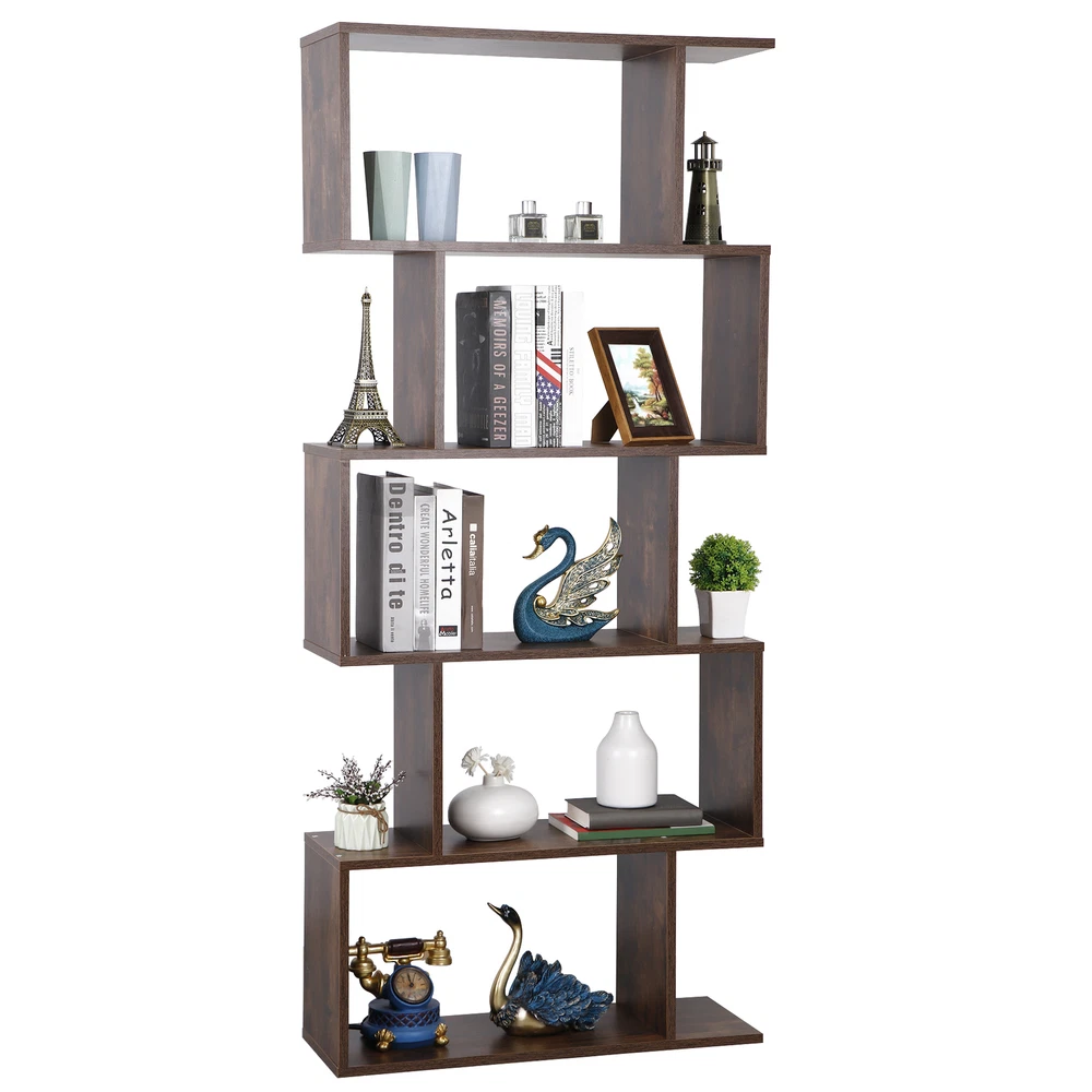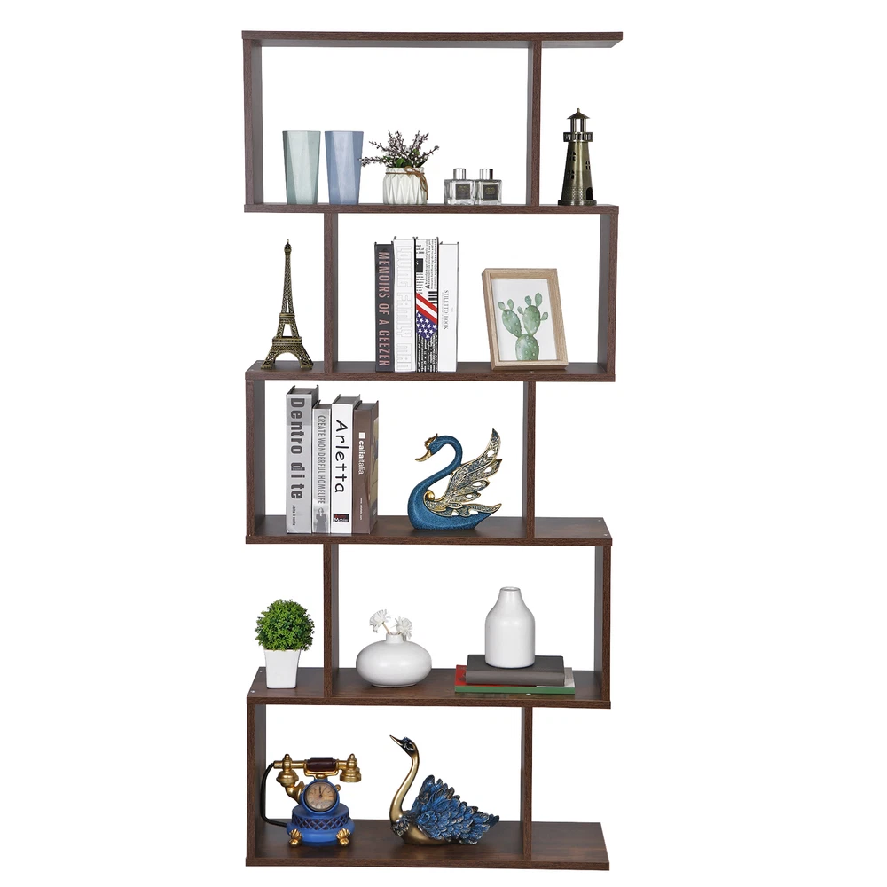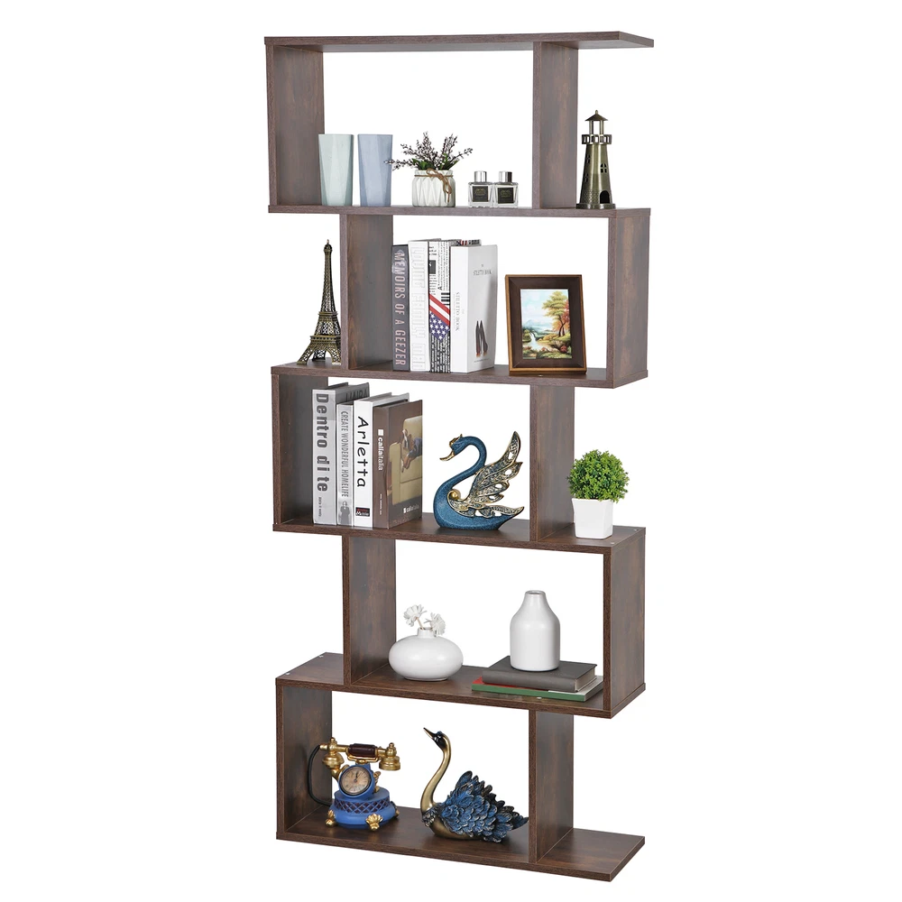 Features: 5 Tier Shelf Storage Space: This bookshelf includes 5 tier open shelves for storage and the surface of the shelf is smooth. The Load capacity of each shelf is up to 33 LBS. It can be used to place books, photo albums, potted plants and decorations. Stable Structure: The bookcase is supported by high quality chipboard panels. The anti-tipped parts is included to insure the stable of the shelf. Best Home&Office Decor: The irregular design of the split-level is even more Special. This bookcase is the best decorative furniture of your living room, office, bedroom and etc. The screw hole stickers are included can be used to shield the screw. Easy to Assemble: The detailed instruction and complete accessories will help you to quickly install the shelf. If you have any questions during the install procedures, you can contact our customer service. Specifications: Material: Particle Board with Melamine Veneer Product Size: 27.56*9.45*62.6in Weight: 40.92lb
