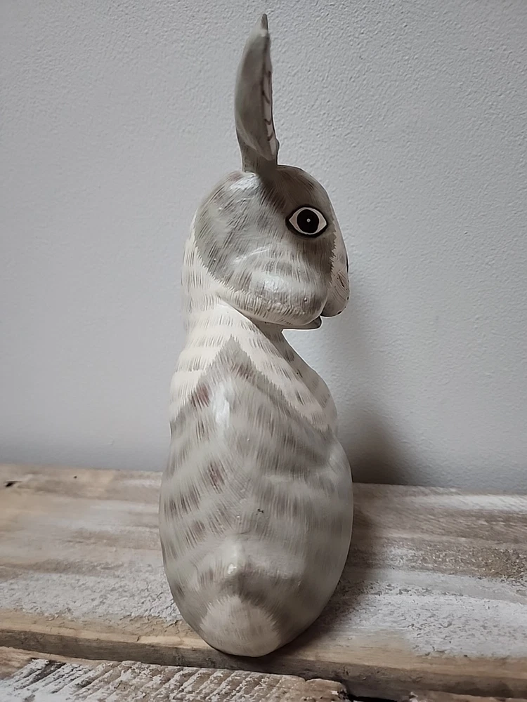 This charming wooden statue is a perfect addition to any folk art collection. The intricately carved bunny rabbit stands at 10 inches tall and is handmade with great attention to detail. Crafted from high-quality wood, this statue is a wonderful tribute to the beauty of nature. All sales are final.